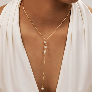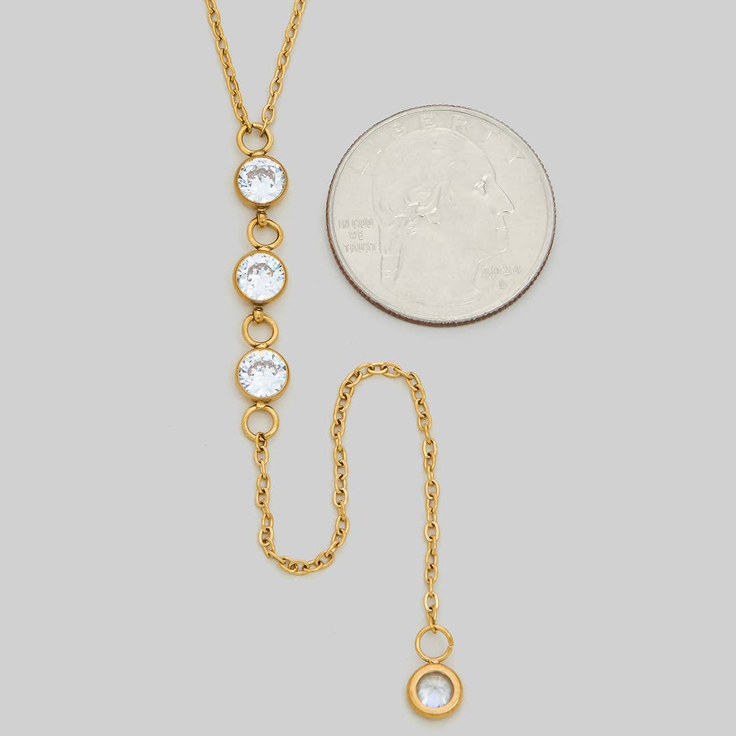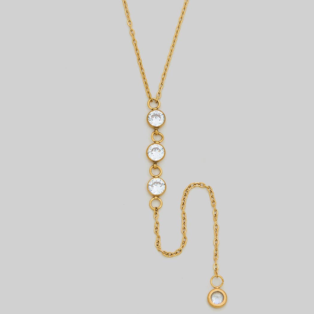 A delicate 18K gold dipped Y necklace featuring shimmering cubic zirconia accents that catch the light beautifully. The 15 inch length sits elegantly at the collarbone adding refined sparkle perfect for layering or wearing alone for a timeless feminine look.
