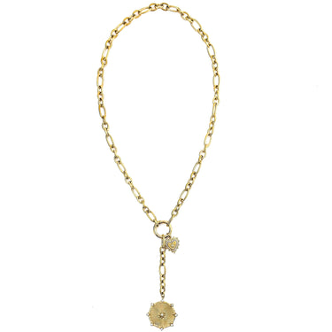Add some sparkle to your outfit with the Laney Lariat Charm Necklace! This trendy piece features a gold chunky chain lariat, adorned with a crystal starburst and heart charm. Make a statement and shine with this playful and stylish necklace.