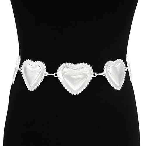 Our METAL EMBOSSED HEART LINK WAIST CHAIN BELT is a unique piece that adds a touch of elegance to any outfit.