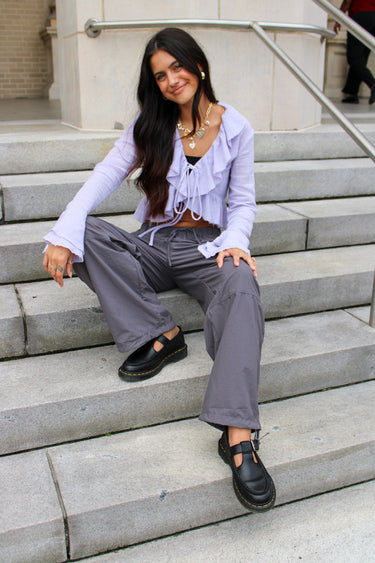 Linen delight in our Amelia top. Features a deep-v neckline, ruffle trim long sleeves, dramatic ruffle details, peplum fit waistline, light linen-like fabric, tie front detail and a lot of outfit possibilities.