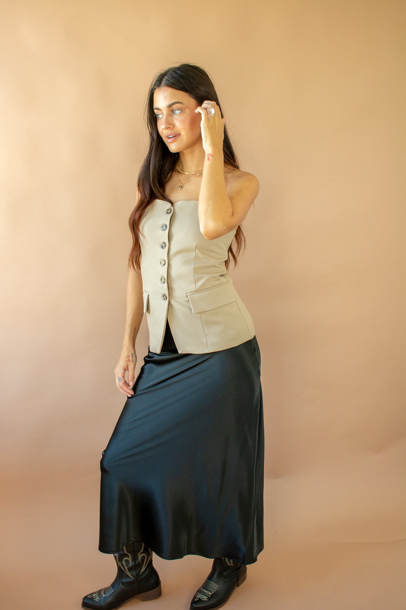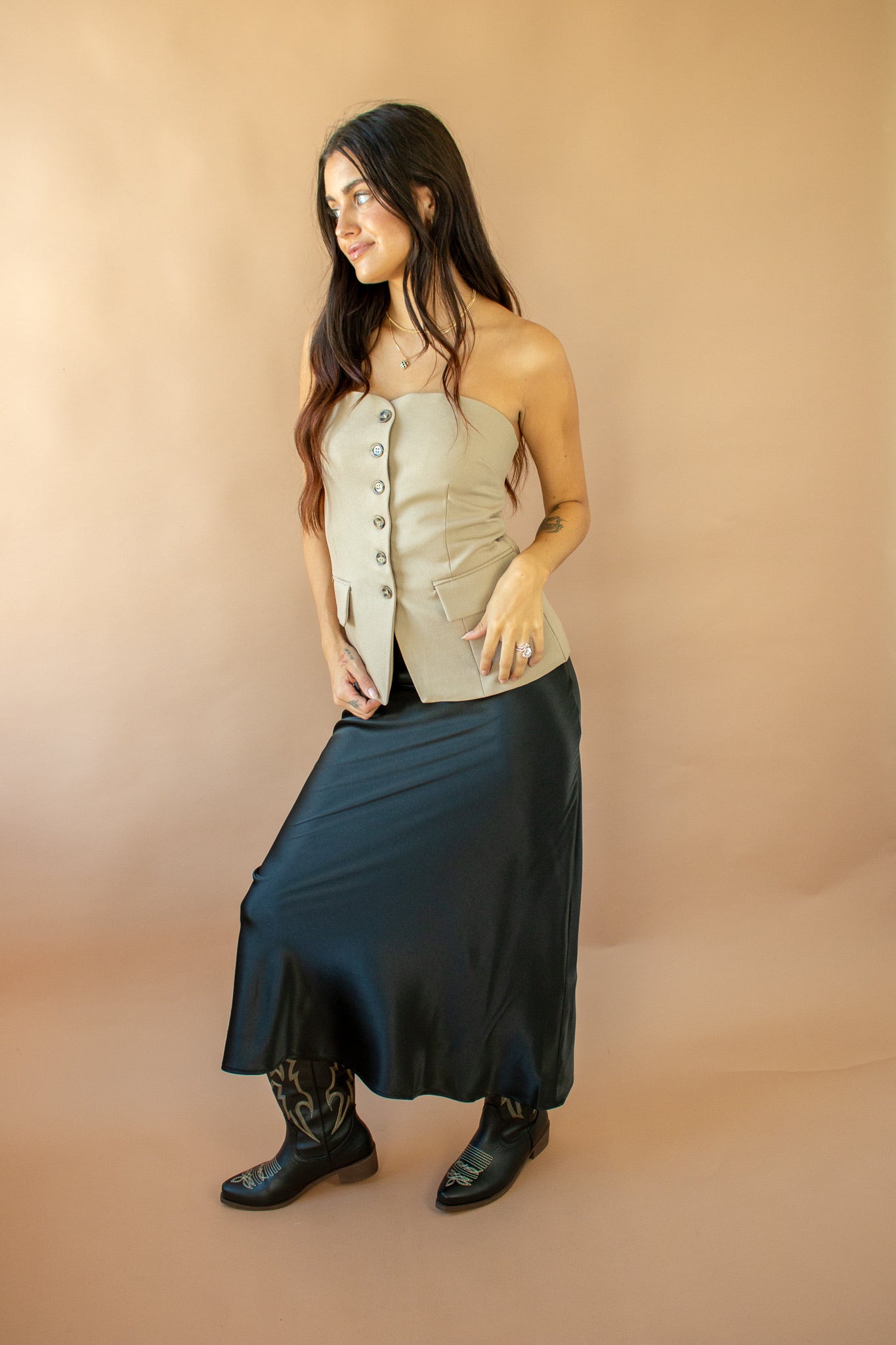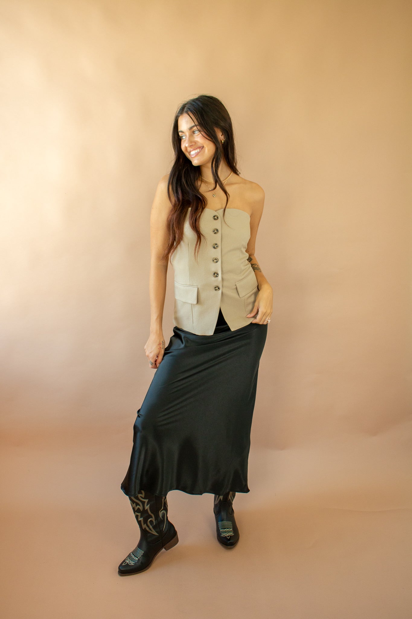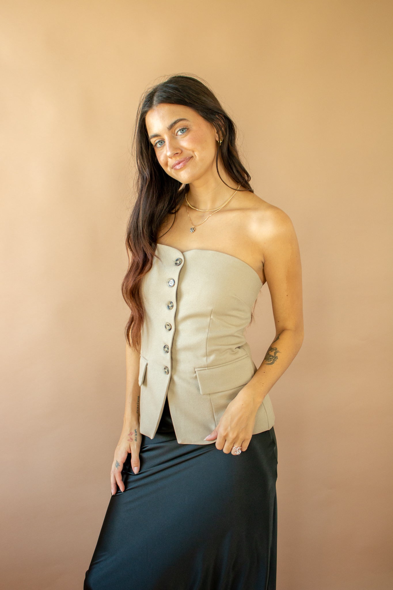 Our Brooke Top features a sleek strapless cut in an office siren vibe. Features a button front closure, flap suit pockets, structured bodice and full length hem. We love it paired with trousers, satin skirts, denim and more.
