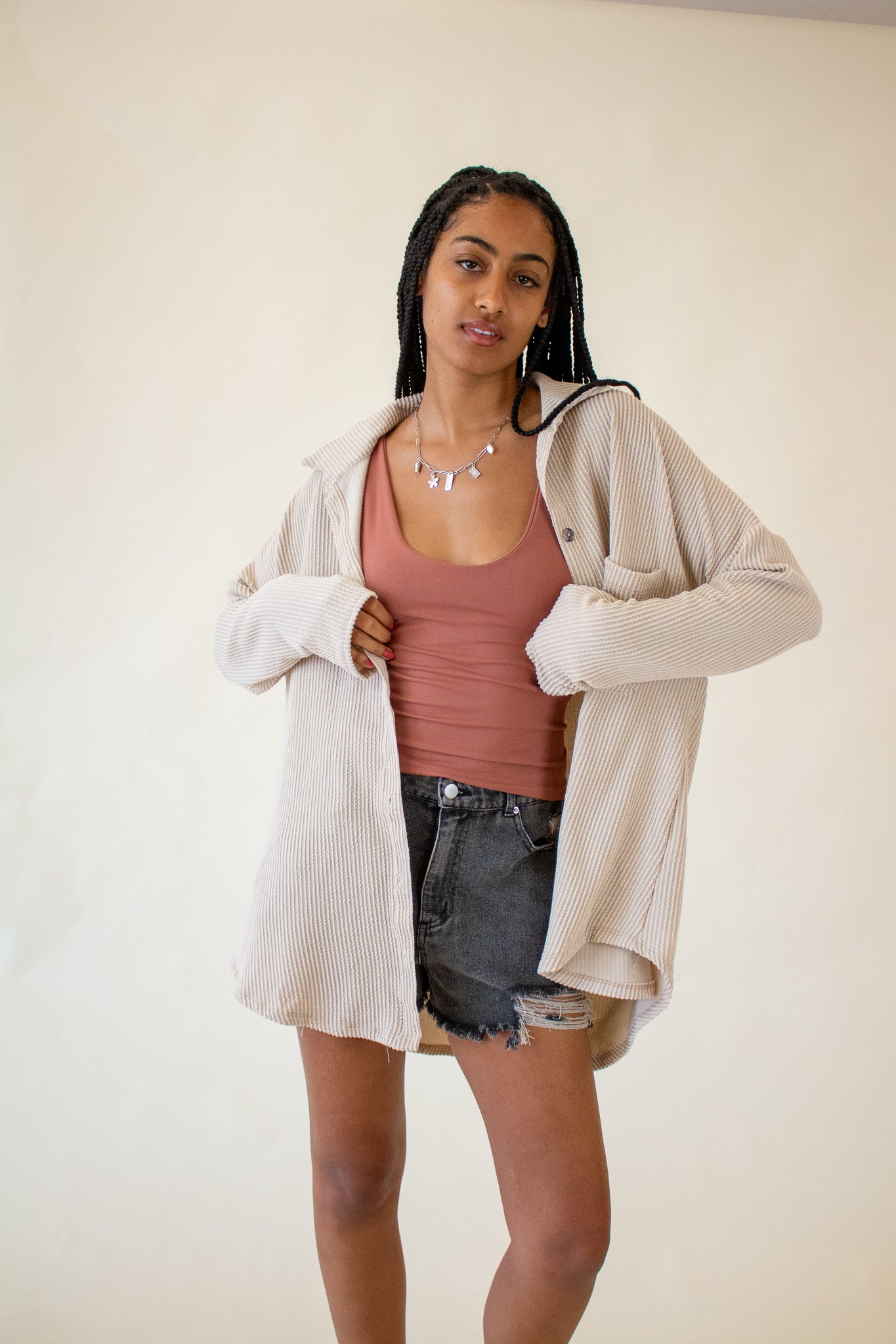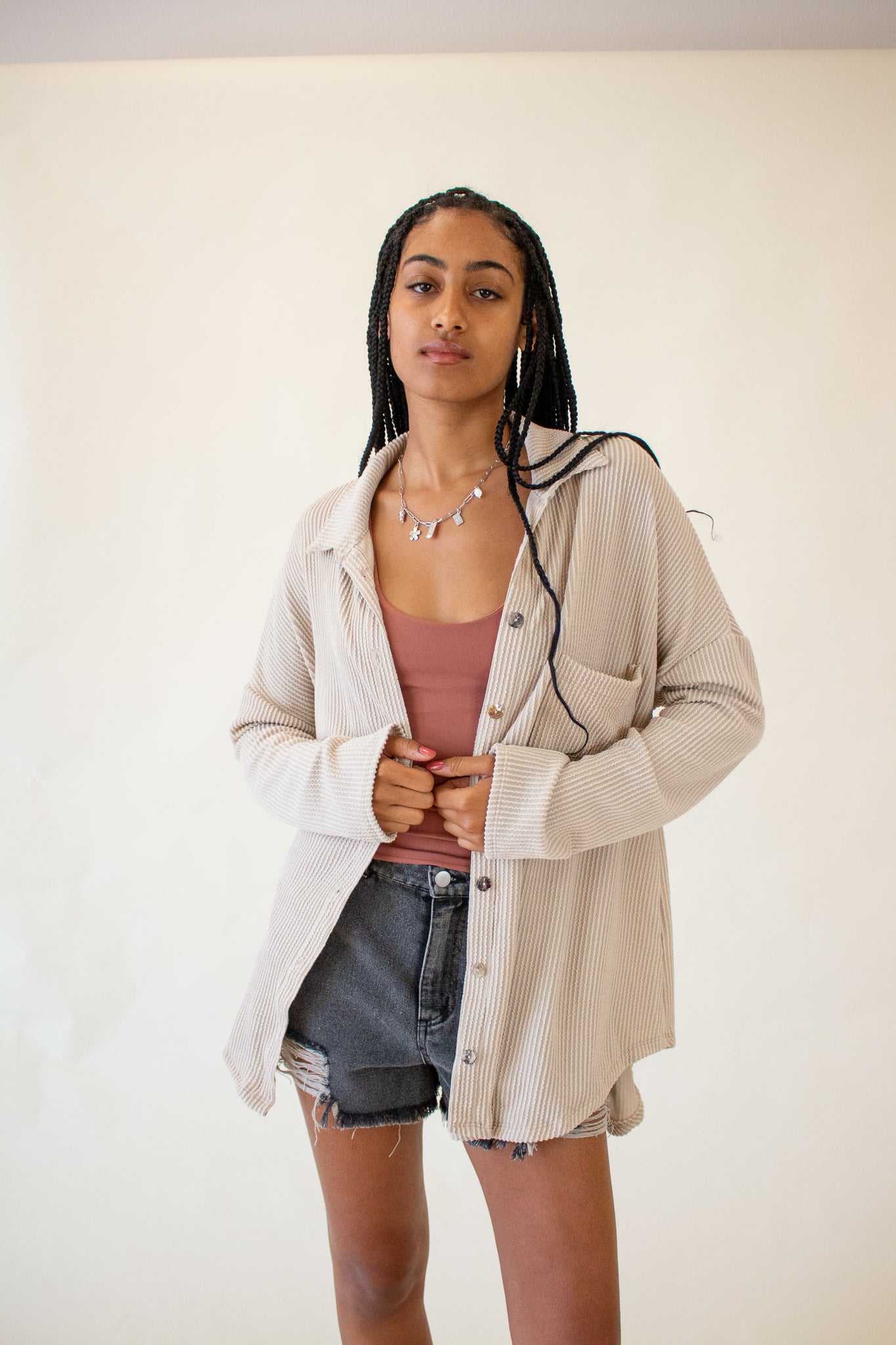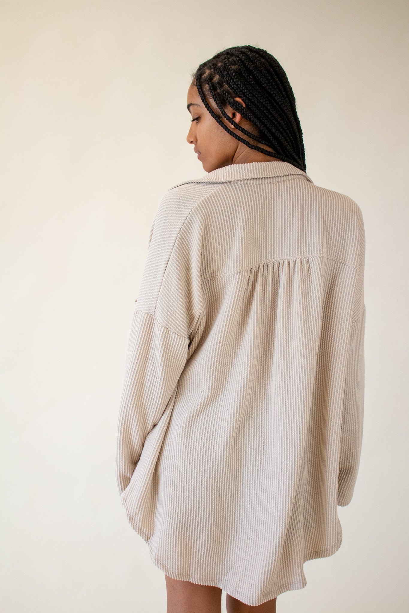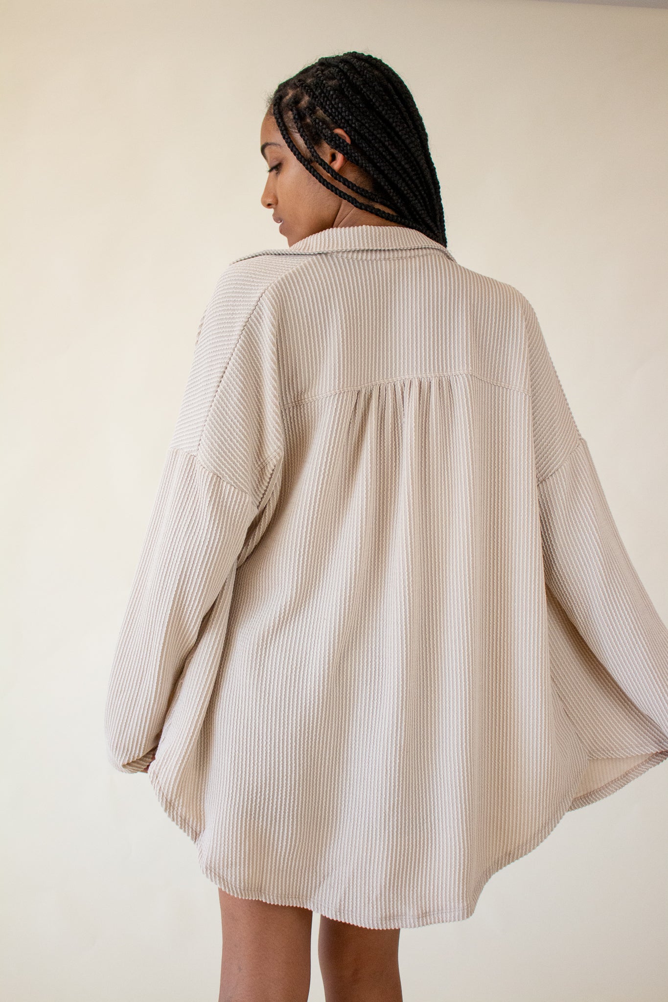 Our Brooke Top features a super soft ribbed texture, collared neckline, button front closure and oversized fit. We love the slouchy drop shoulders, long-line hem and wide cut bodice. Wear it layered over tanks and tees or as a beach coverup for your favorite swim.