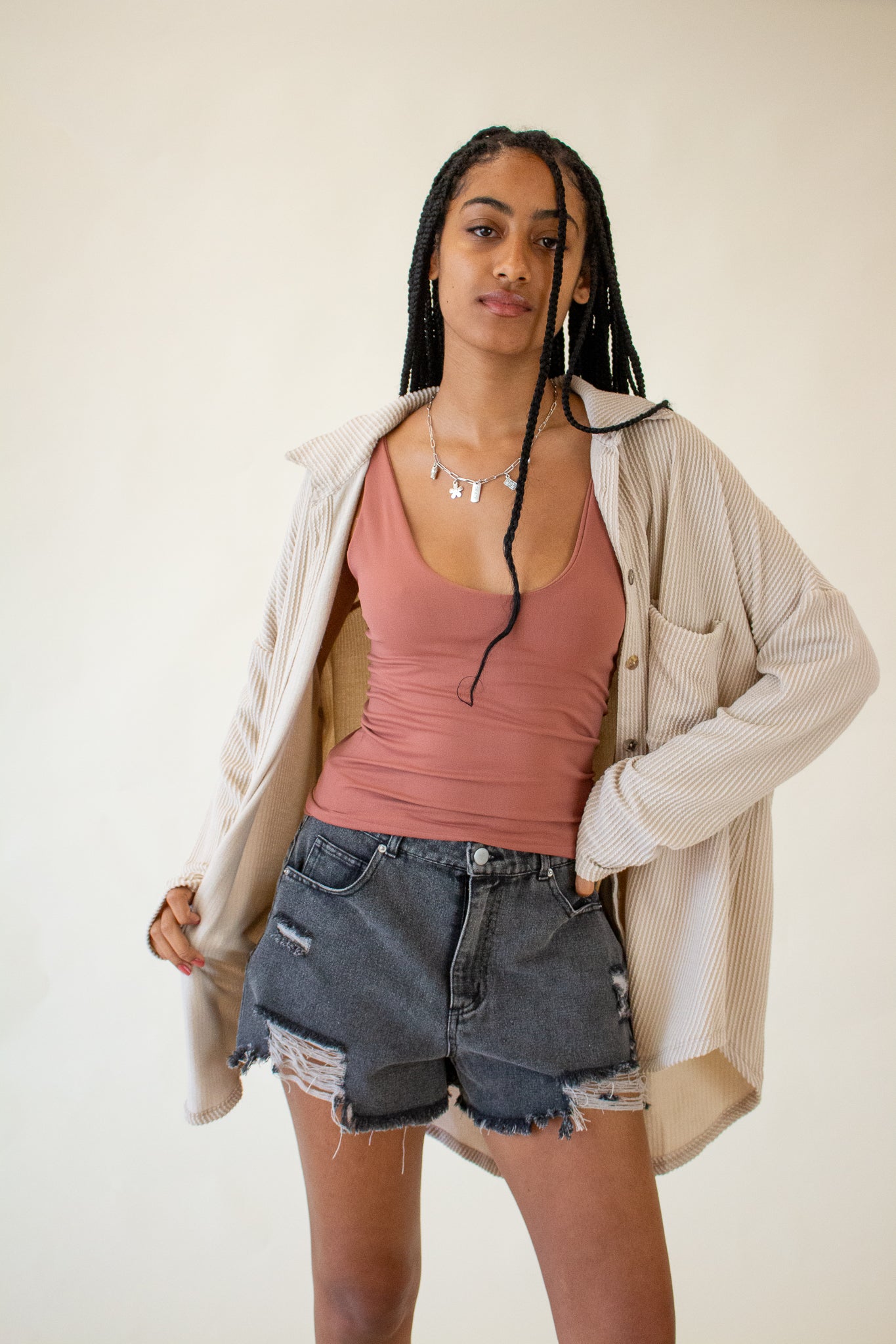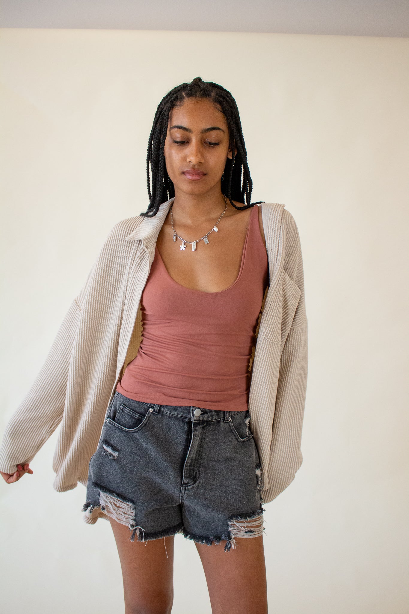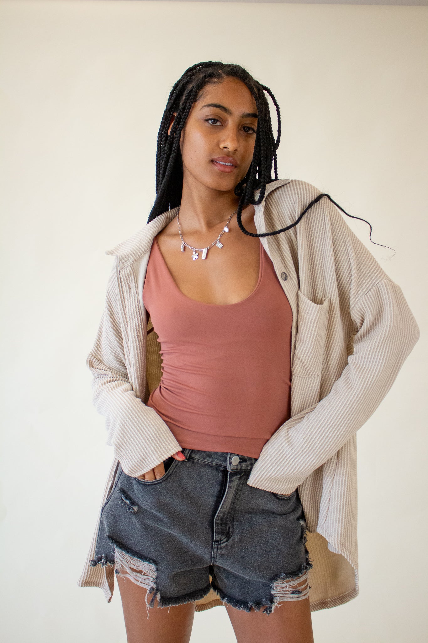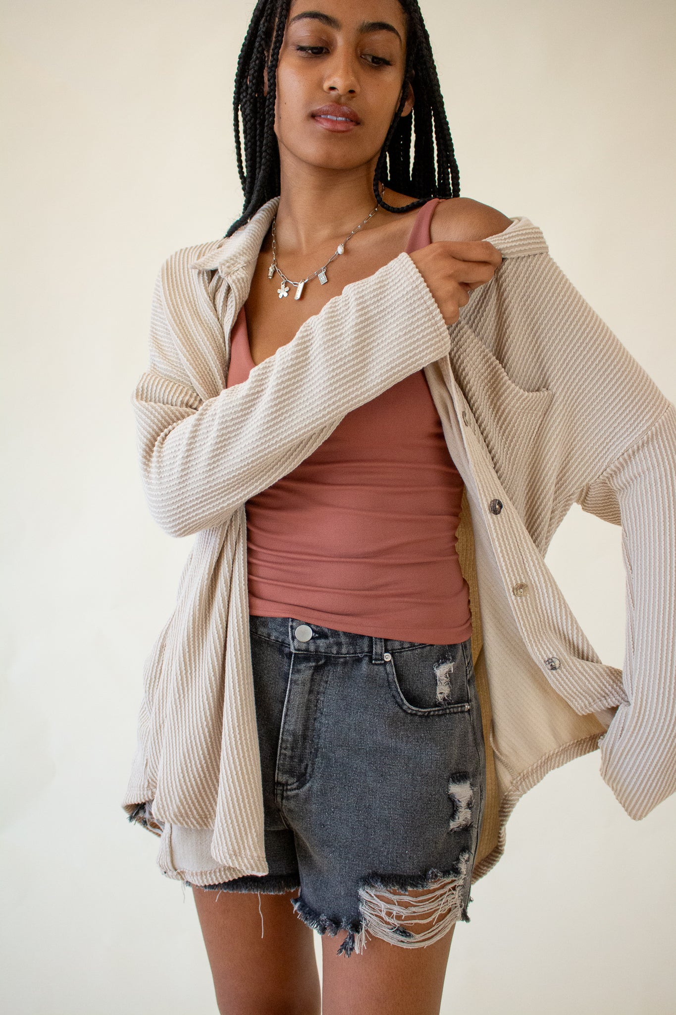 Our Brooke Top features a super soft ribbed texture, collared neckline, button front closure and oversized fit. We love the slouchy drop shoulders, long-line hem and wide cut bodice. Wear it layered over tanks and tees or as a beach coverup for your favorite swim.