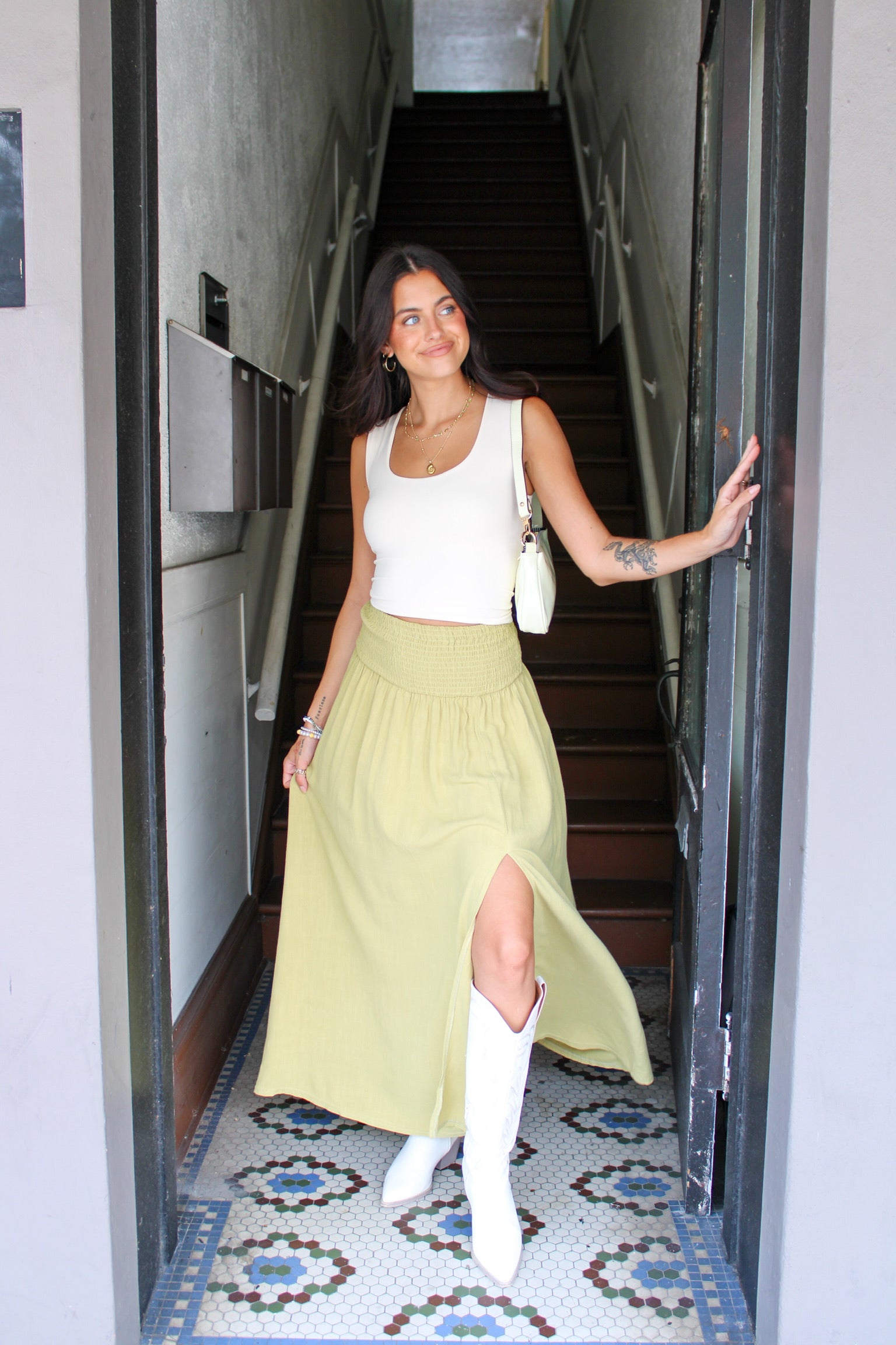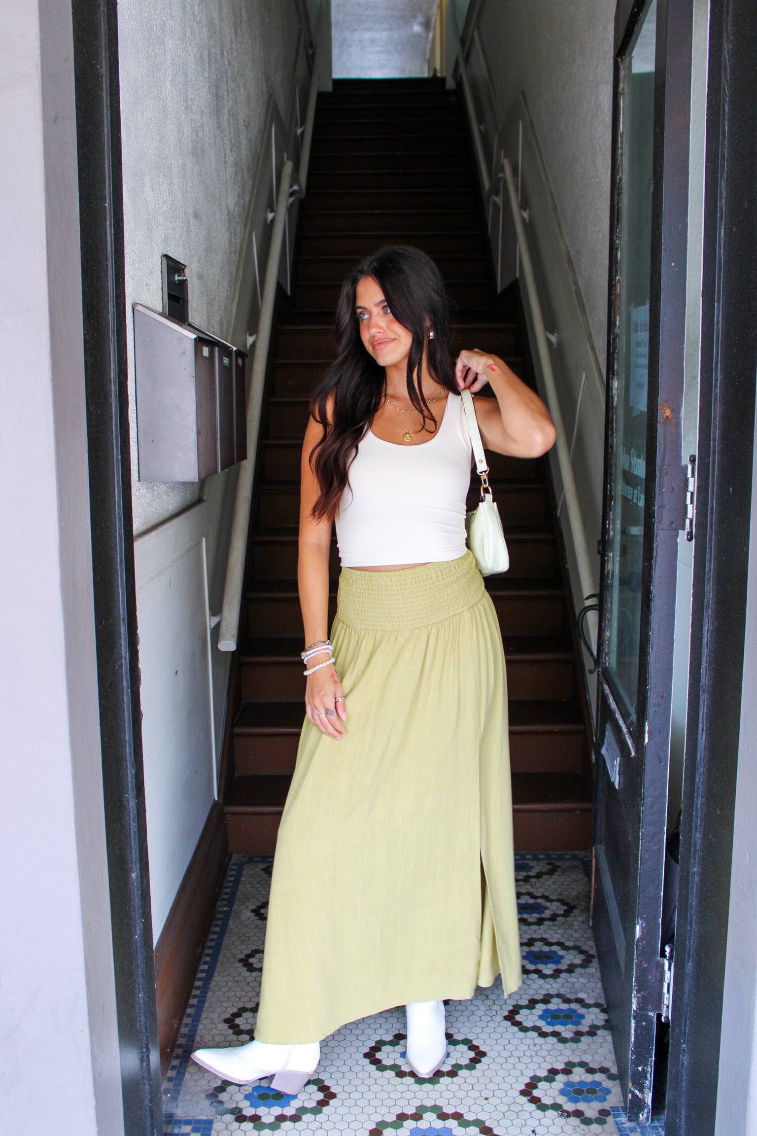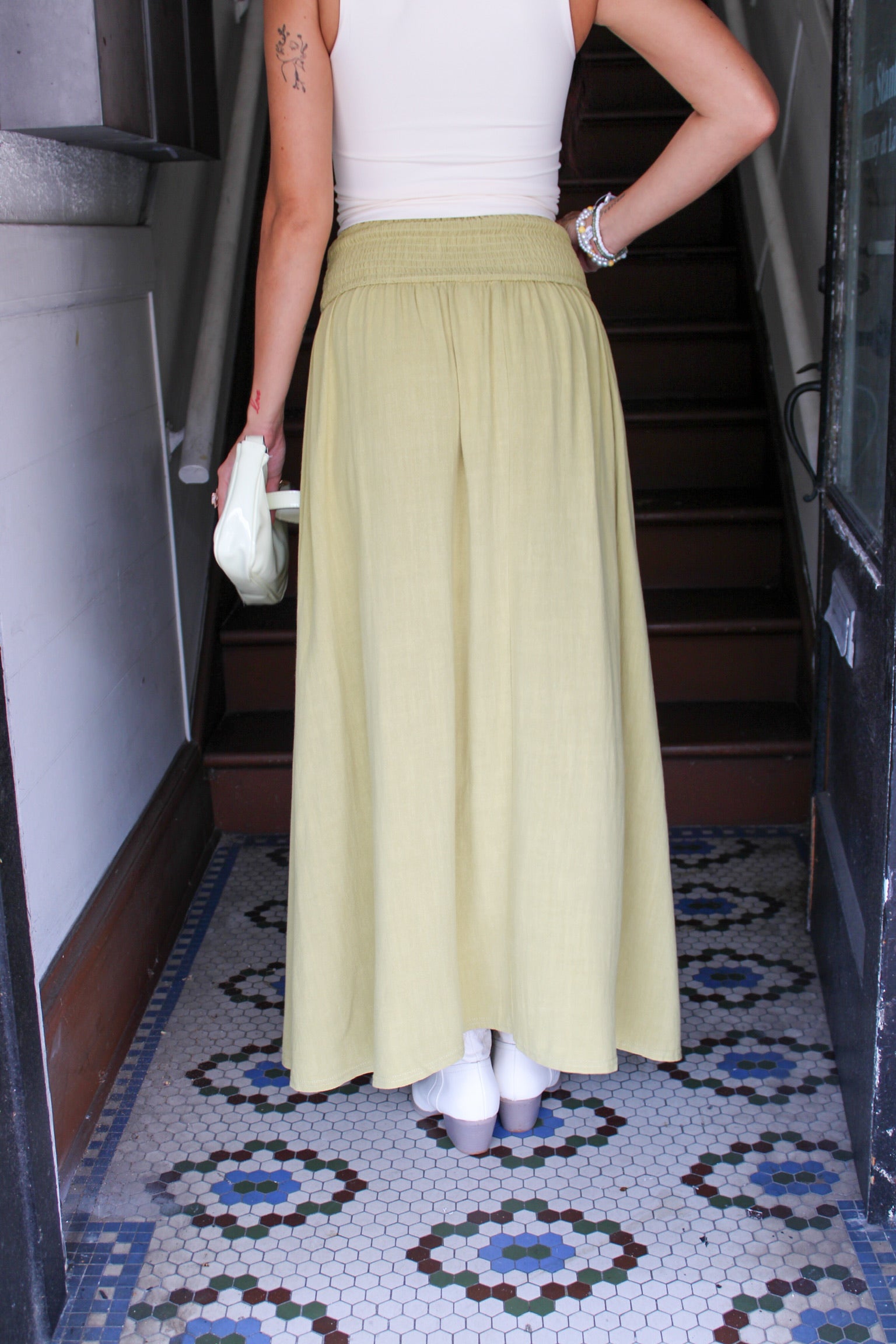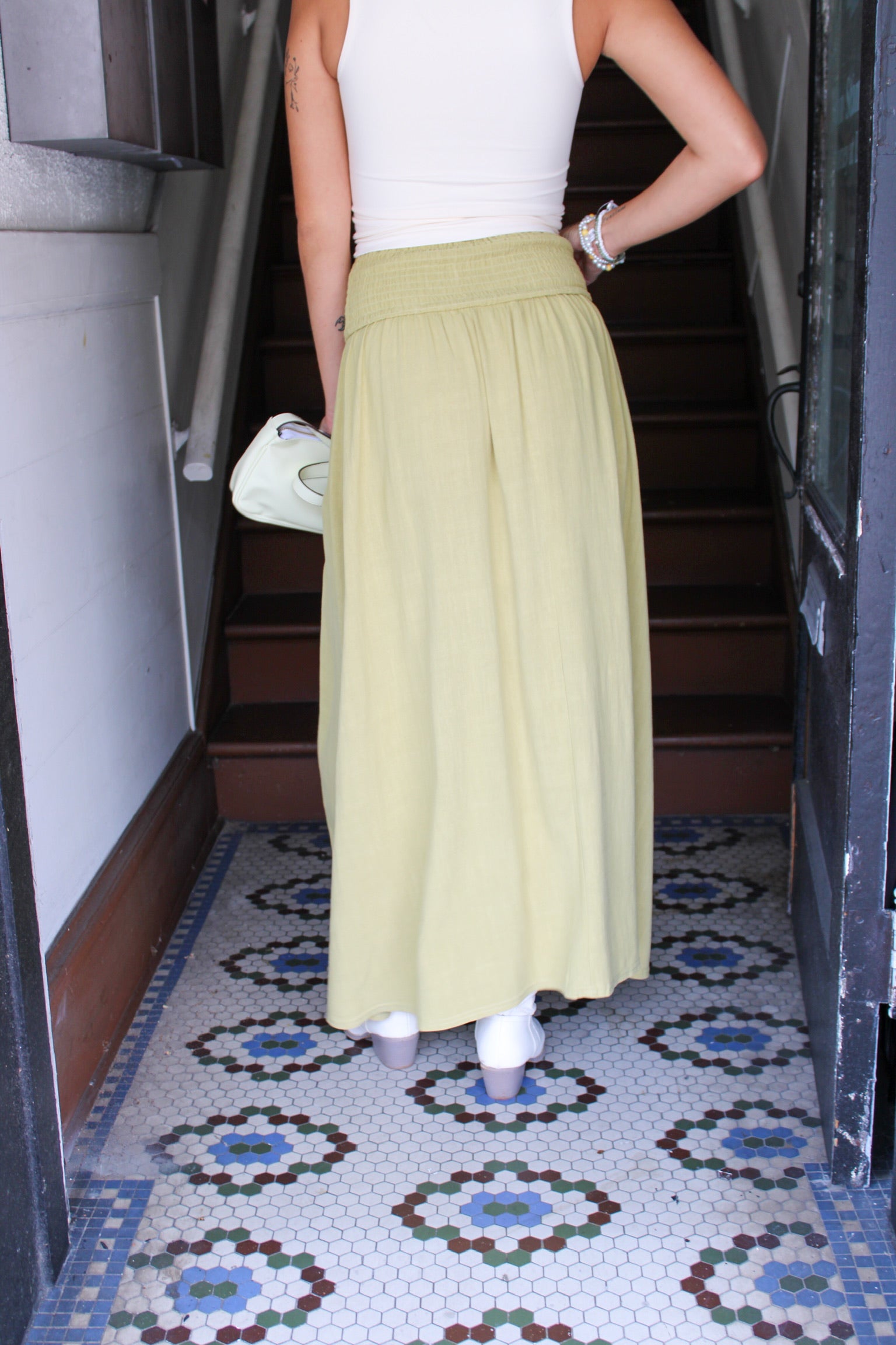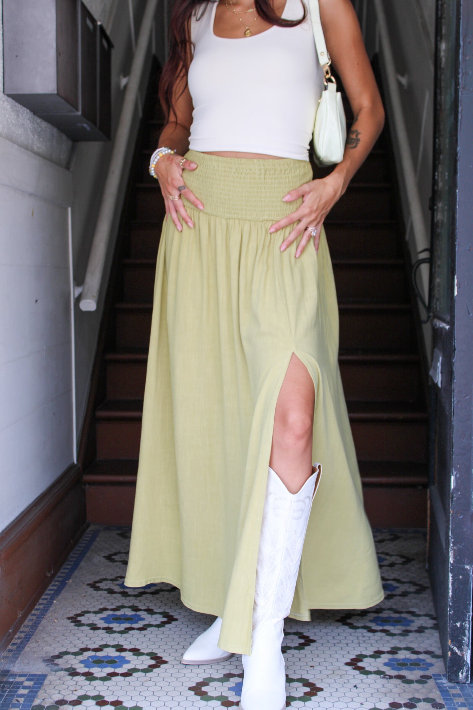 This linen-like skirt is the perfect piece to add to your summer line-up. The Calabasas skirt features an elastic smocked waist that flatters a range of bodies, a high slit for comfortable walking, a straight flowy floor length hem, inner lining and super lightweight fabric that moves with you! Wear with seamless crops, linen button downs, over your favorite swim or with a lacy going out top for a night of drinks and lounging.
