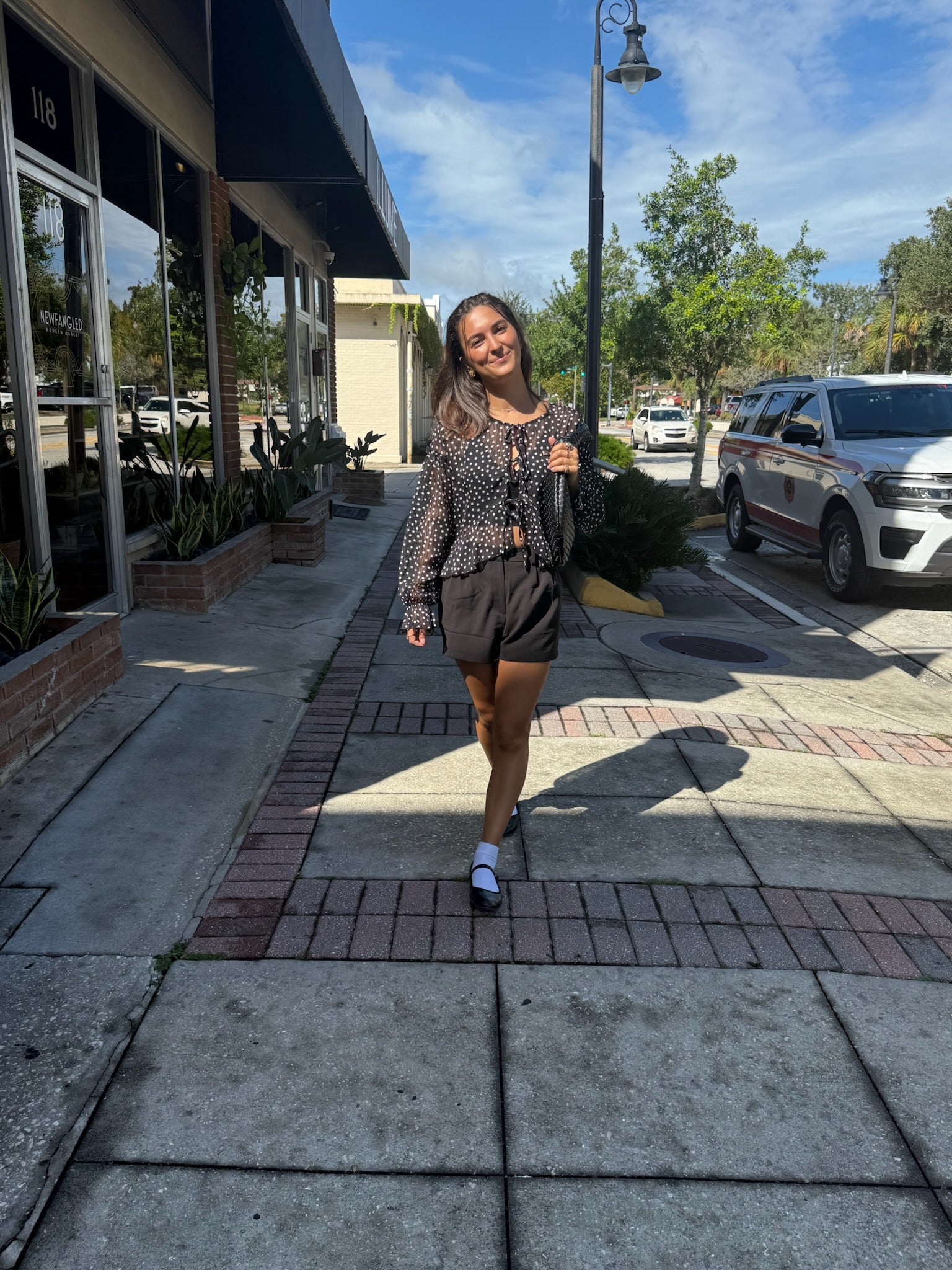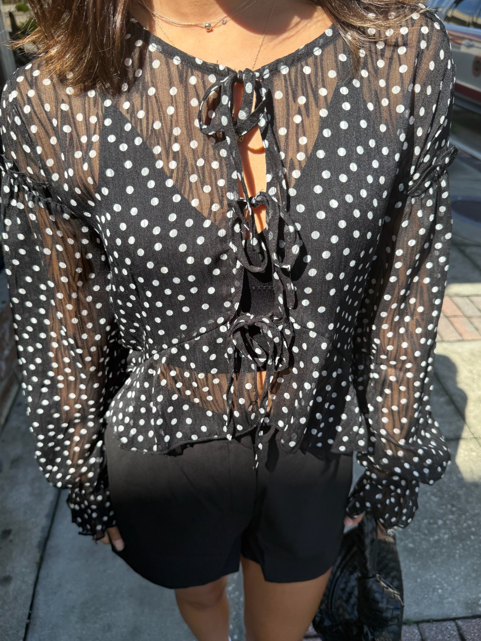 Romantic and chic, the Amara Dot Blouse is a standout with her sheer woven fabric and uneven polka dot print. Designed with ruffle detailing, long sleeves, and a playful self-tie front, she’s equal parts feminine and effortless. Pair Amara with denim for a casual look or style her with a mini skirt for a night out.