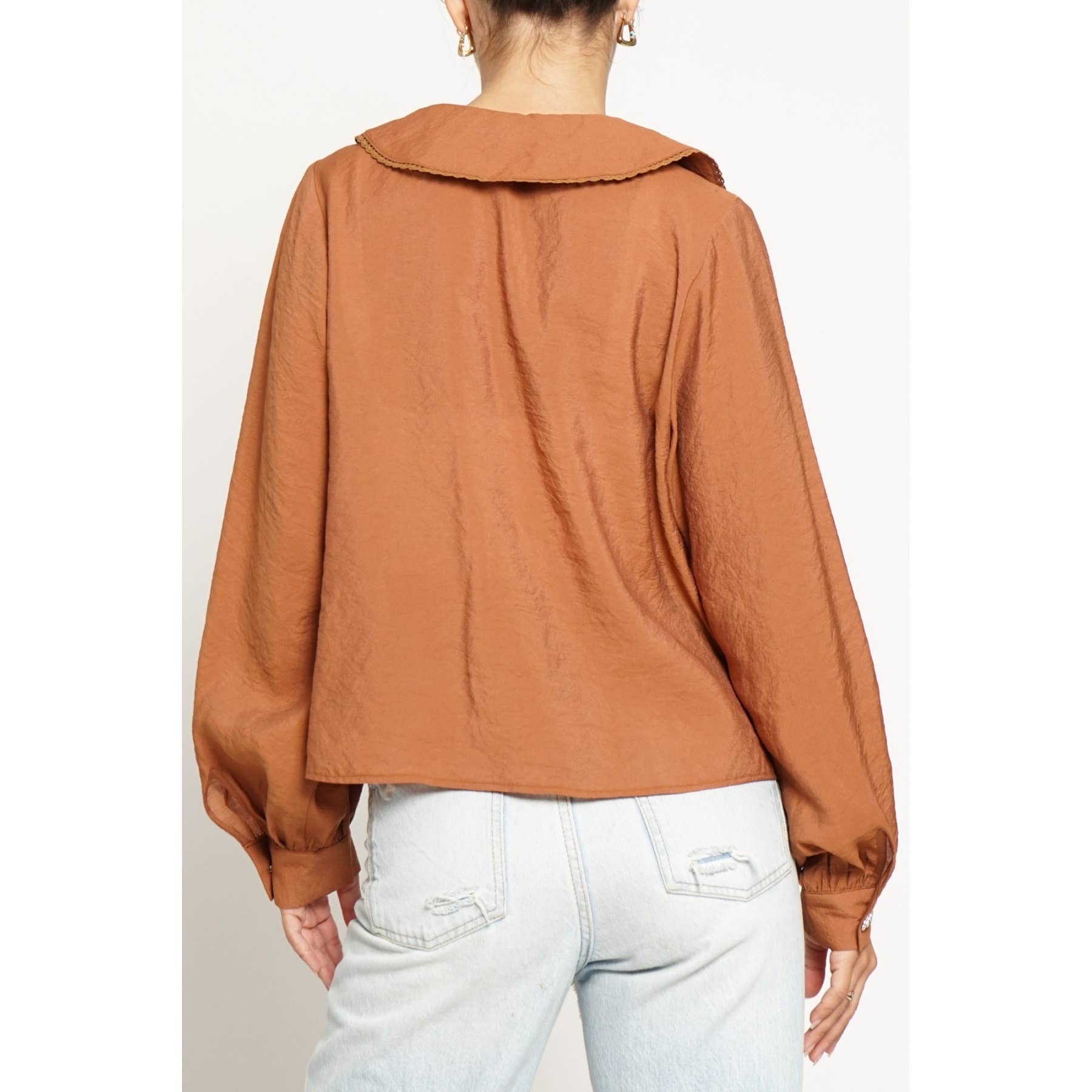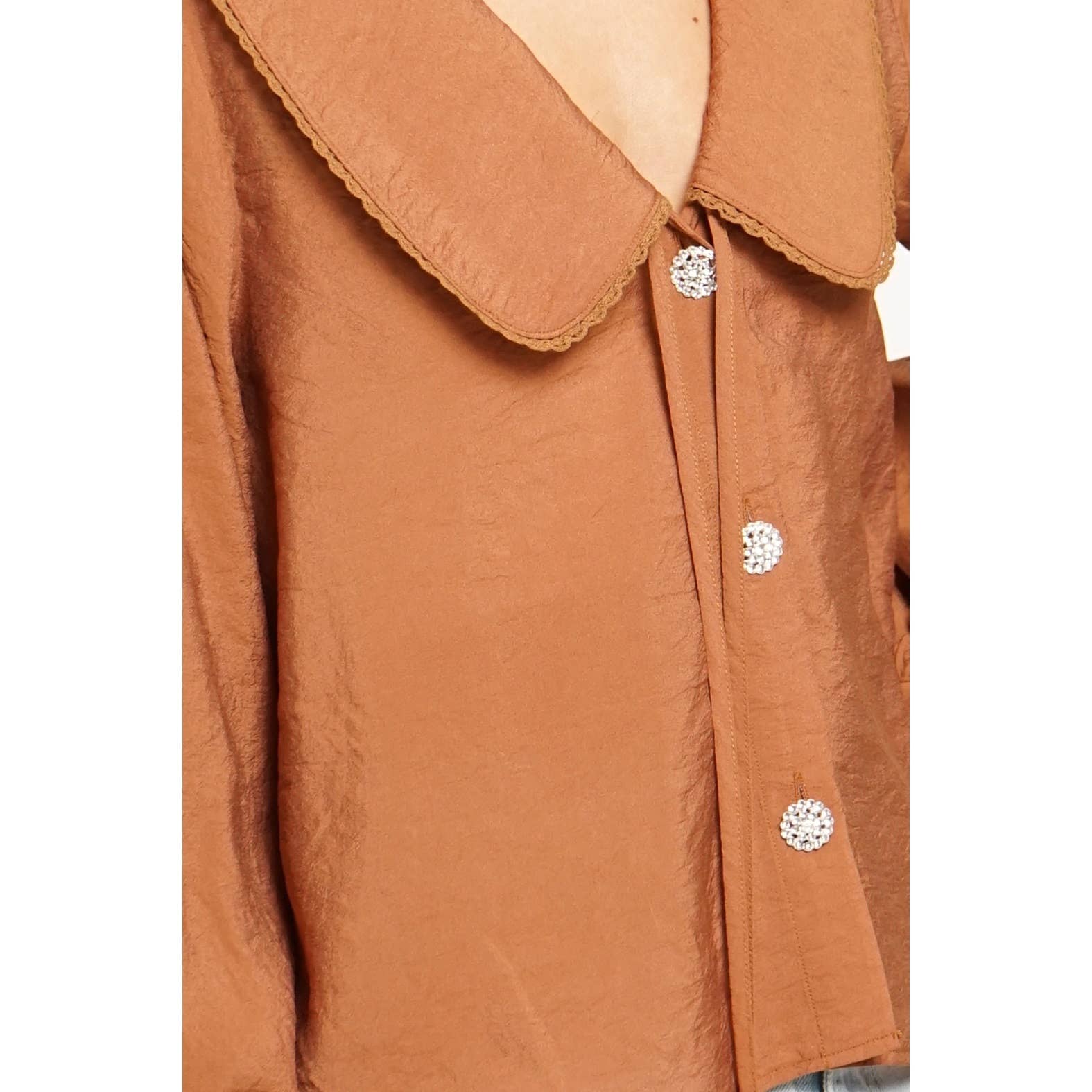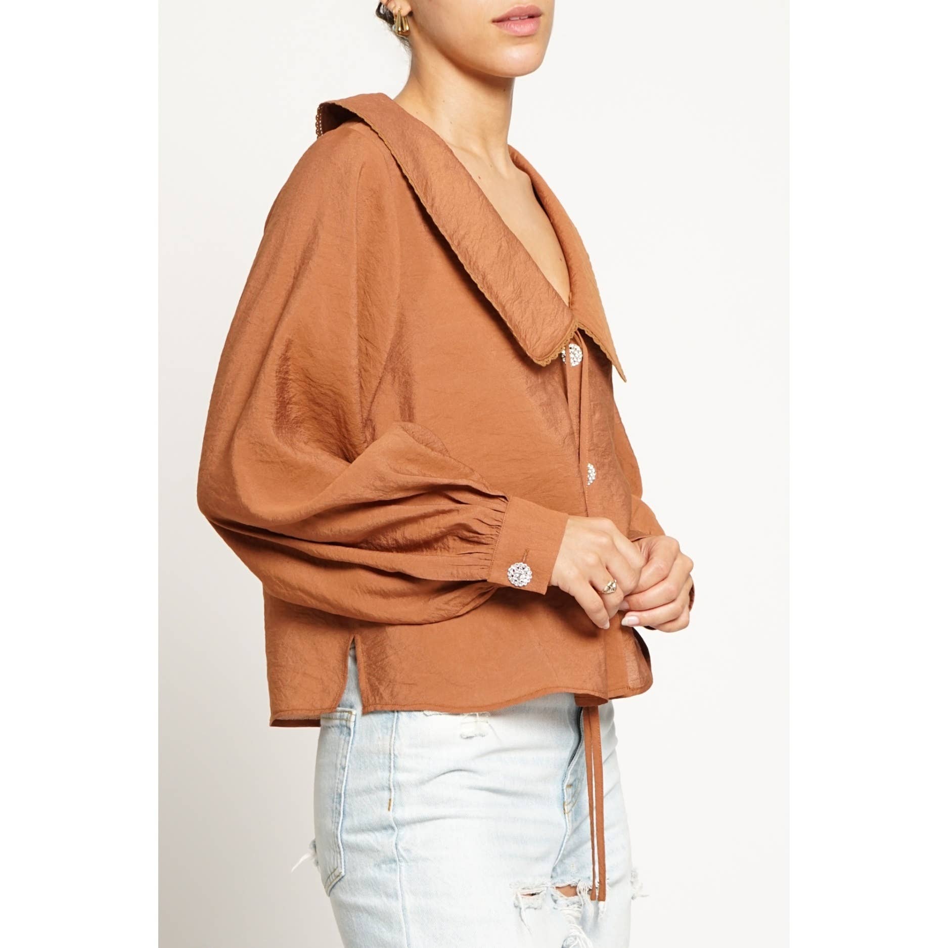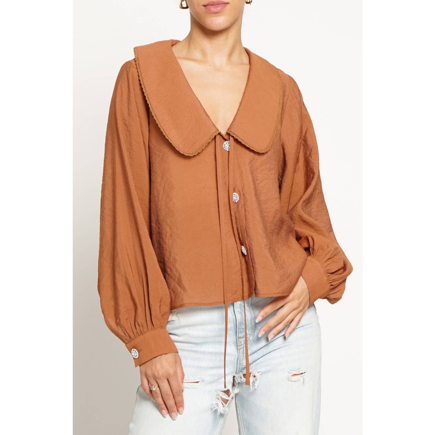 Chic with a touch of sparkle, the Giselle Blouse is made to stand out. Designed in a lightweight woven fabric, she features a dramatic oversized collar, rhinestone button details, and a flowy silhouette that’s both flattering and effortless. Pair Giselle with tailored trousers for a polished look or denim for an elevated everyday vibe.