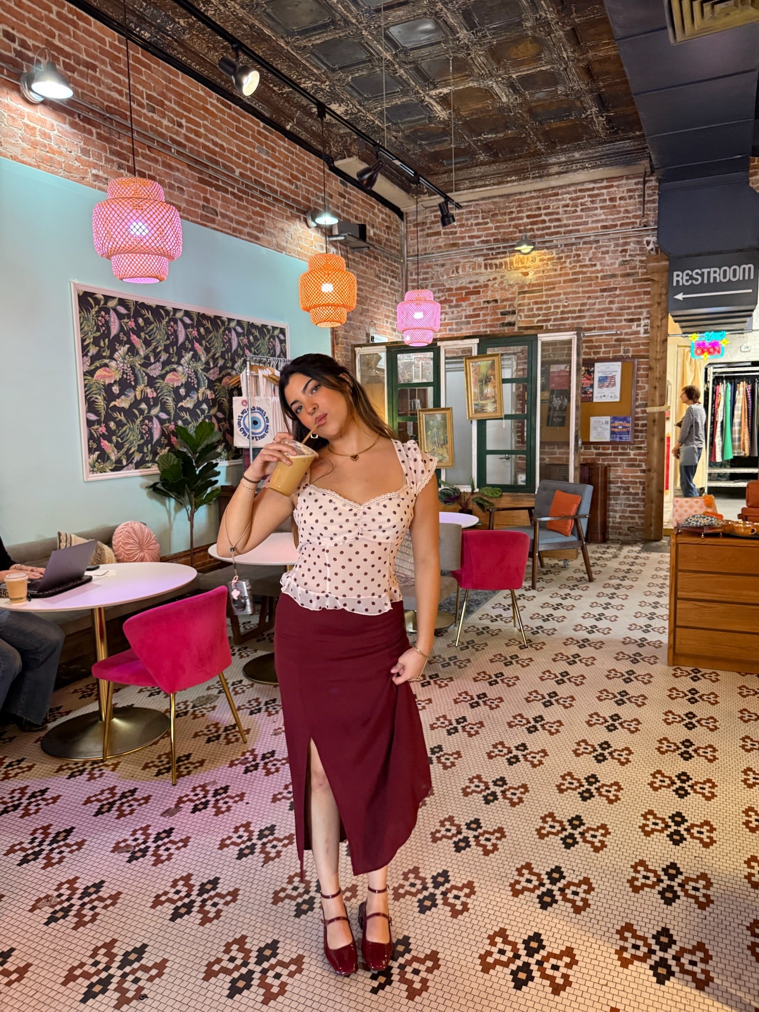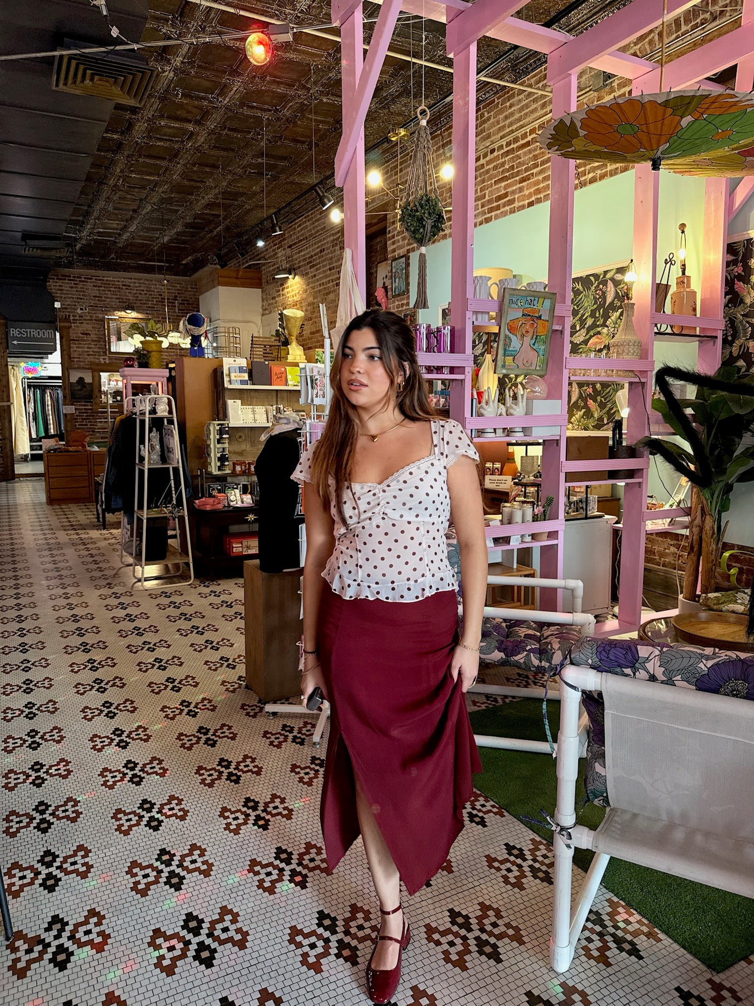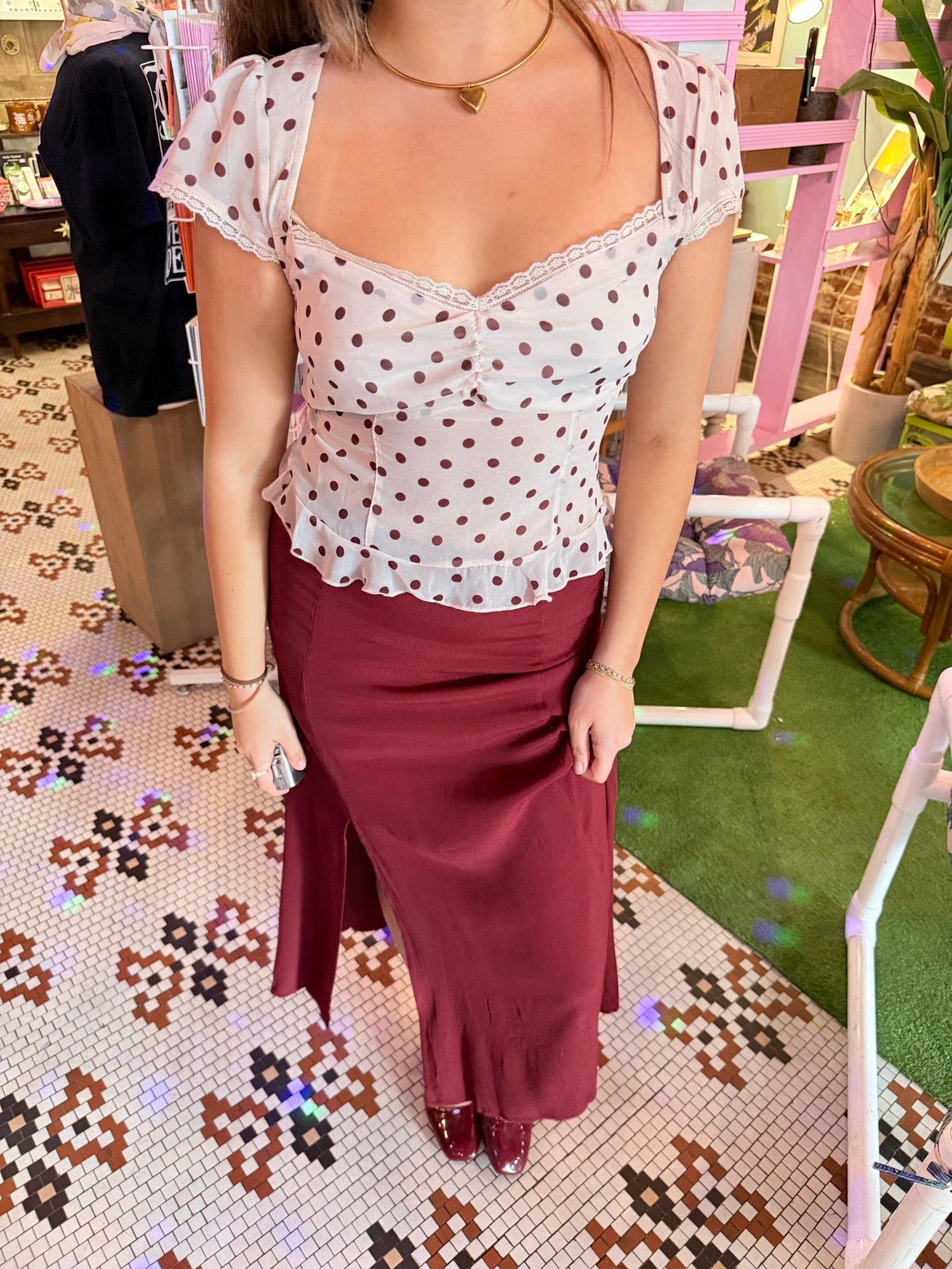 The Paris Darling Top is the definition of flirty and feminine with a vintage twist. Designed in a sheer ivory chiffon scattered with soft brown polka dots, it features delicate lace trim, flutter sleeves, and a subtly ruched bust for that romantic, French-girl touch. The lightweight fabric drapes effortlessly and pairs beautifully with dark denim, leather trousers, or the Milan Muse Maxi Skirt for a chic, coordinated look. Whether you’re strolling through city streets or grabbing coffee with friends, this top adds instant charm and sophistication.