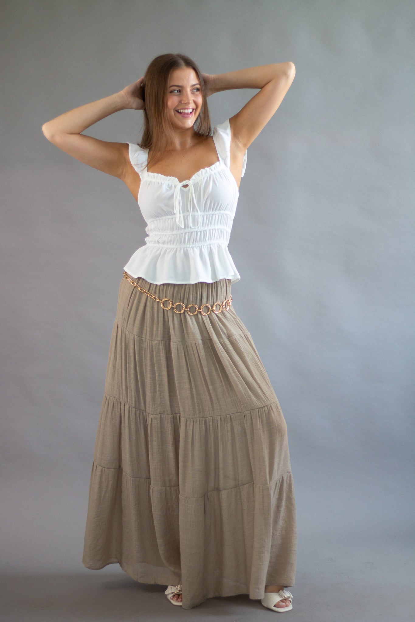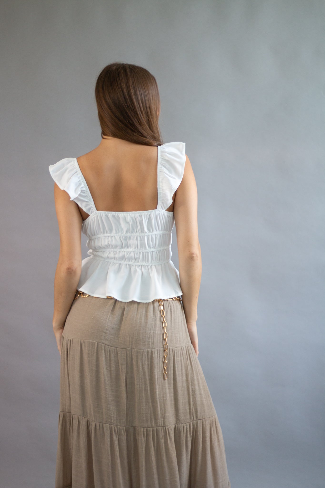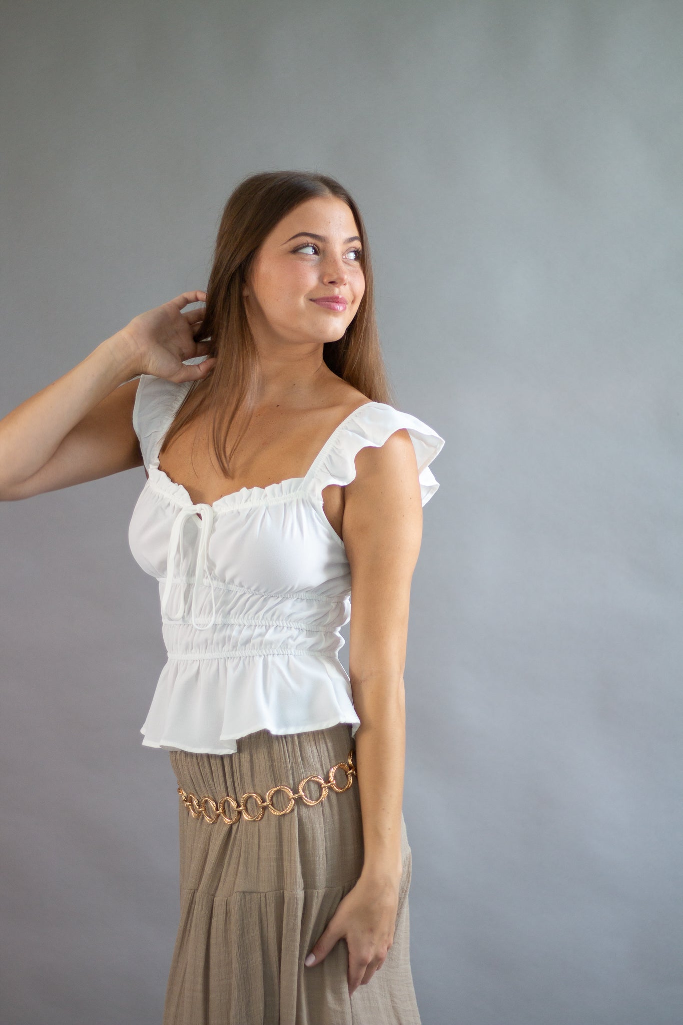 This woven top features a sweetheart neckline with a front self-tie keyhole, sleeveless ruffle straps, and a smocked waist and back. The peplum silhouette adds a flirty touch to this solid-colored favorite.