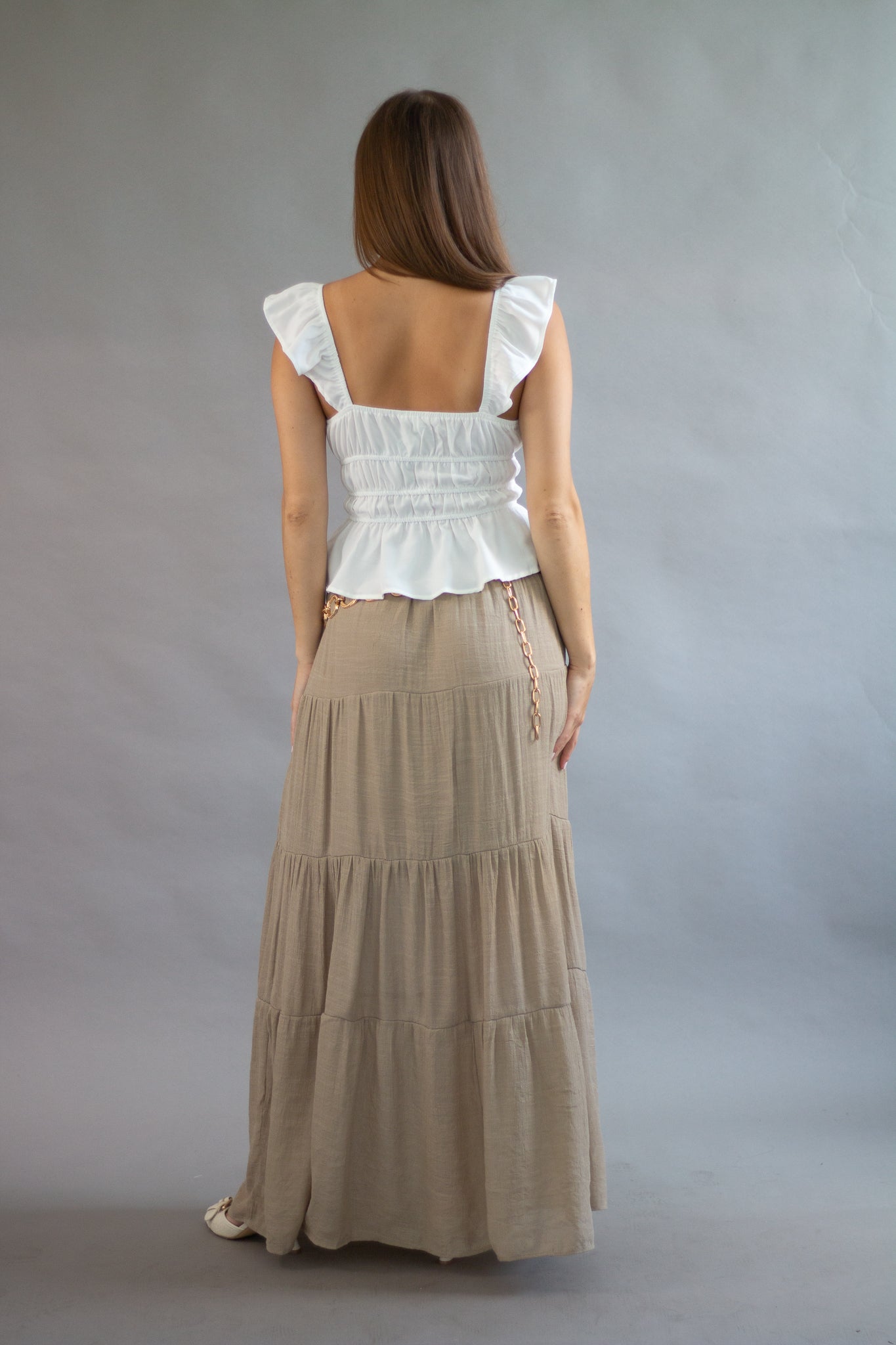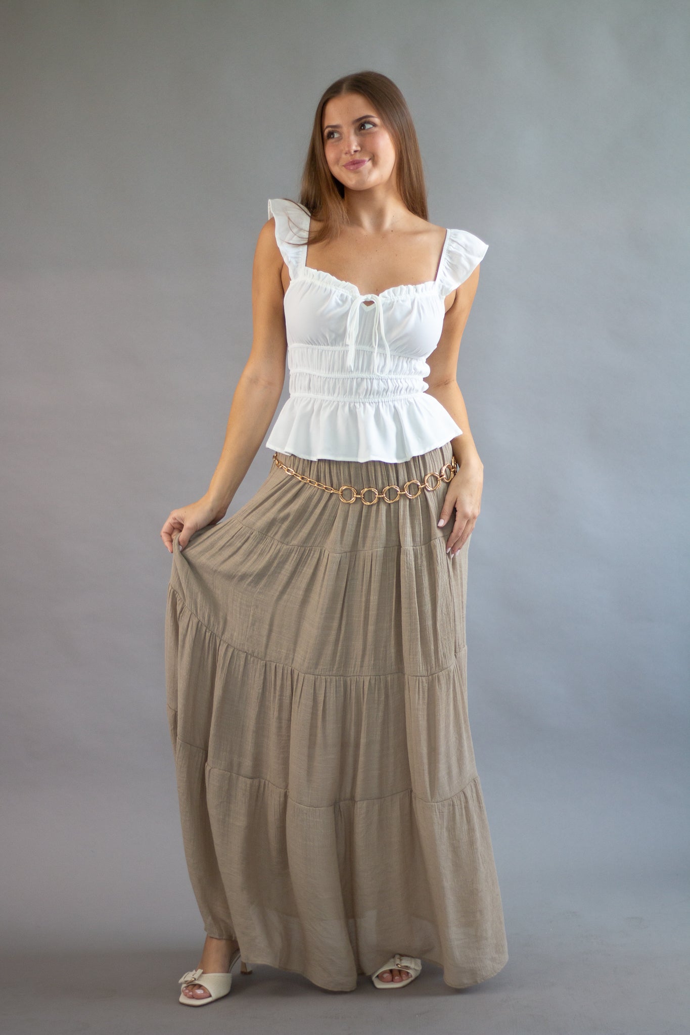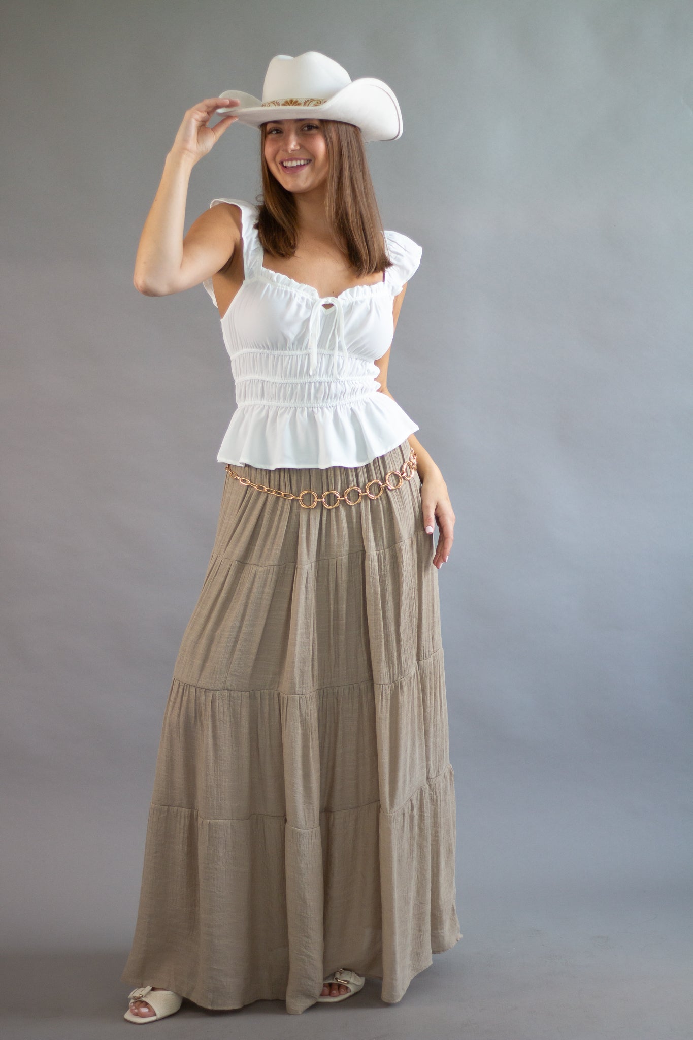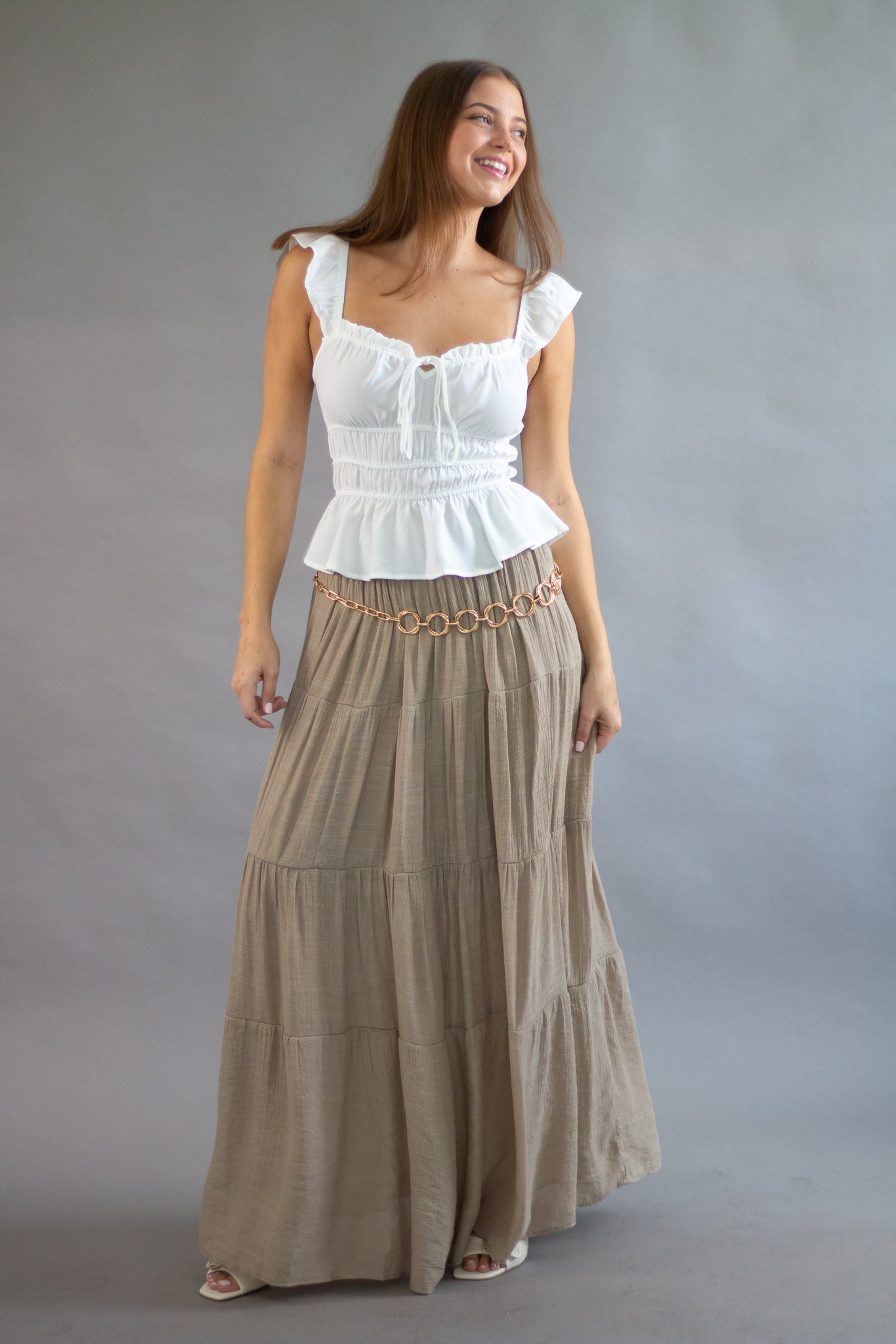 This woven top features a sweetheart neckline with a front self-tie keyhole, sleeveless ruffle straps, and a smocked waist and back. The peplum silhouette adds a flirty touch to this solid-colored favorite.
