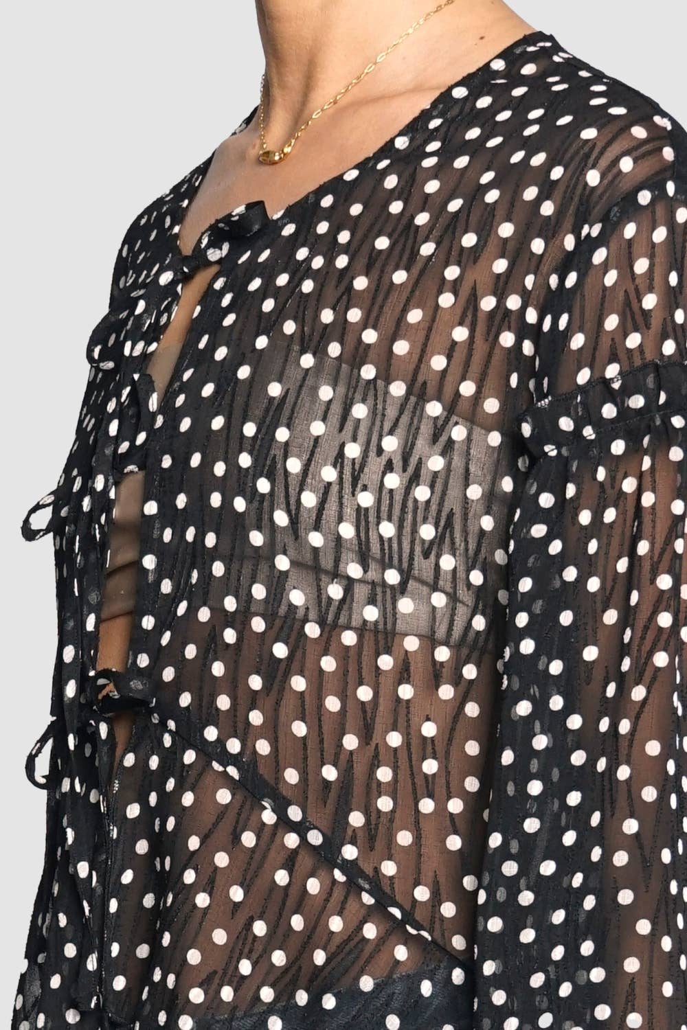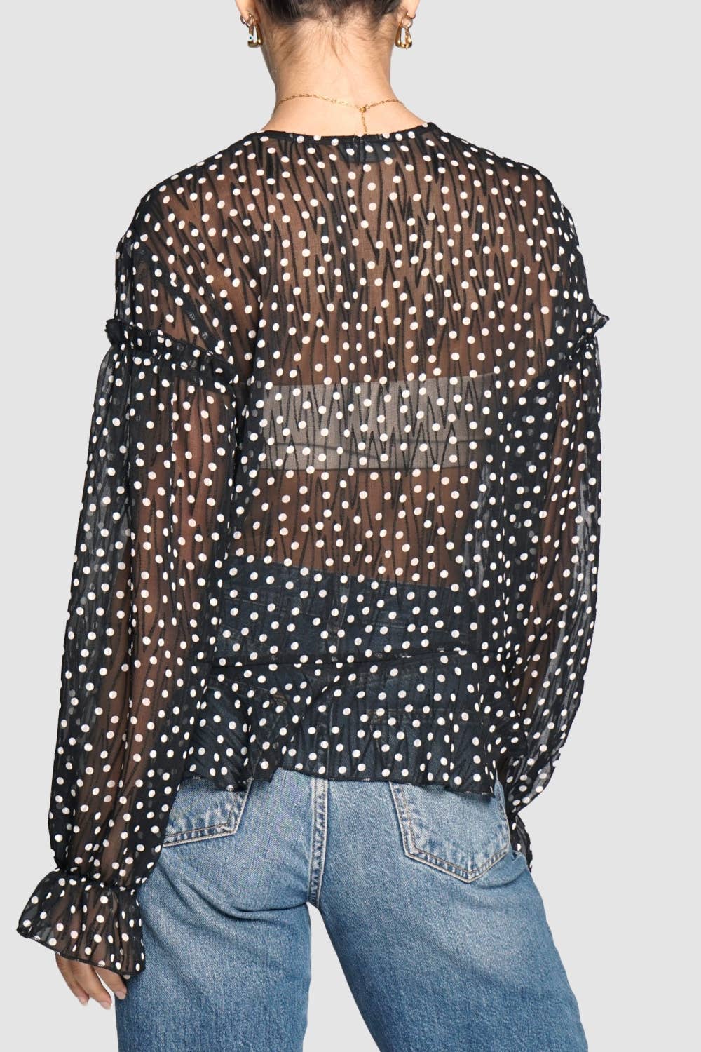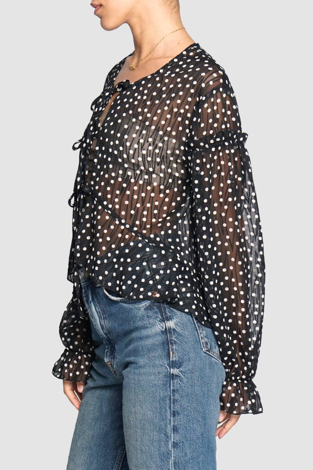 Romantic and chic, the Amara Dot Blouse is a standout with her sheer woven fabric and uneven polka dot print. Designed with ruffle detailing, long sleeves, and a playful self-tie front, she’s equal parts feminine and effortless. Pair Amara with denim for a casual look or style her with a mini skirt for a night out.