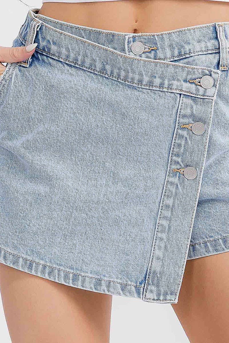 Casual, cool, and effortlessly wearable — the Winter Stroll Denim Skort is your year-round staple with a cozy-season twist. Designed in soft washed denim, this mini skort features a classic button-front closure and functional pockets for that timeless, laid-back feel. The flattering silhouette gives you the look of a skirt with the comfort of built-in shorts, making it perfect for everyday wear.