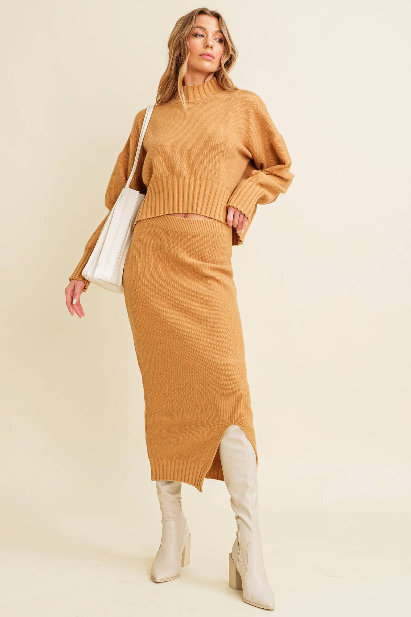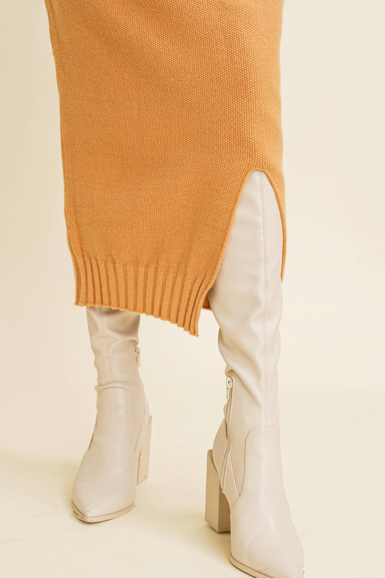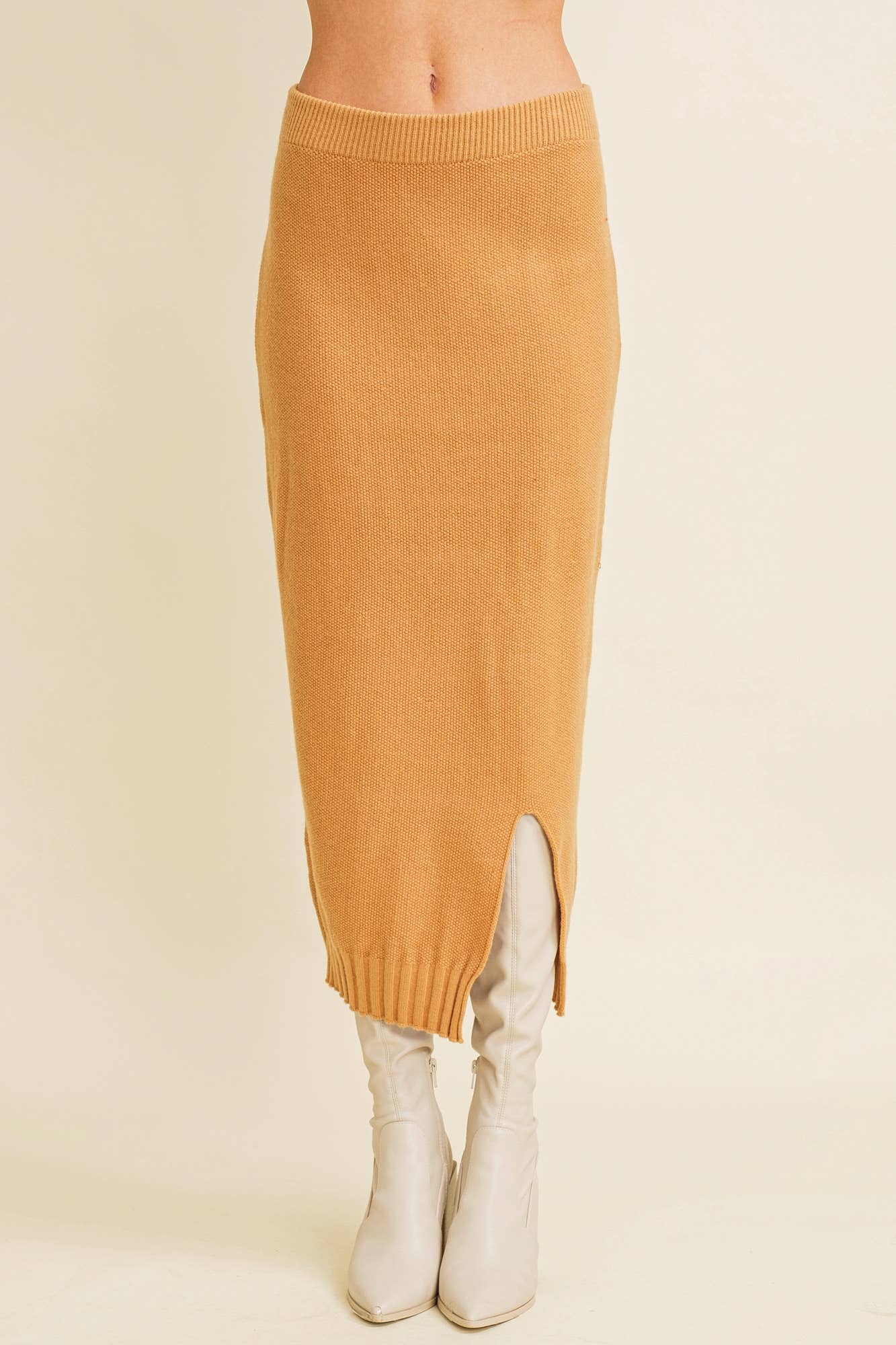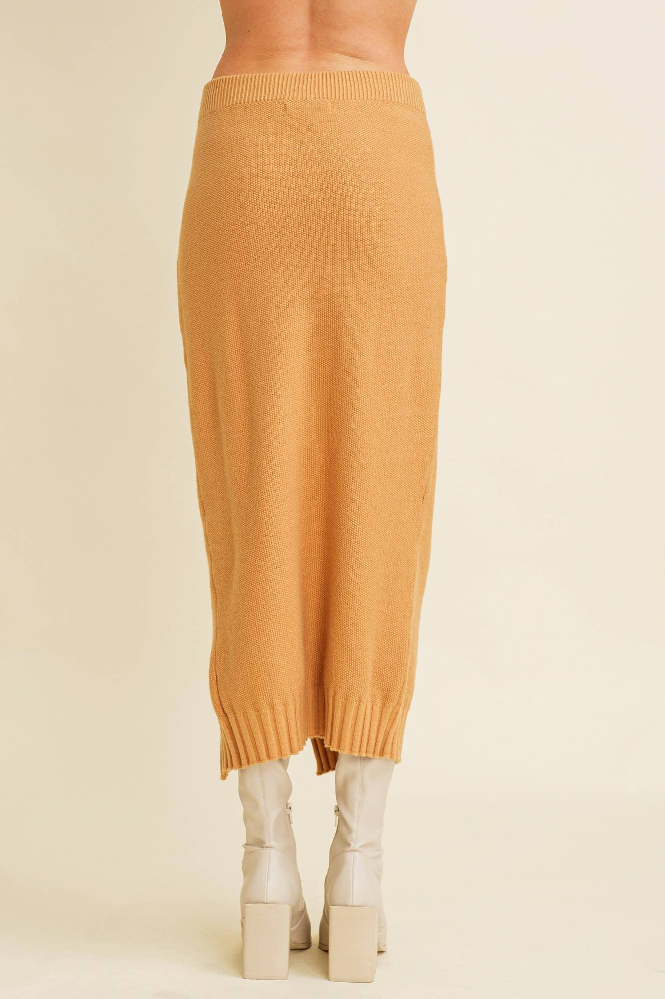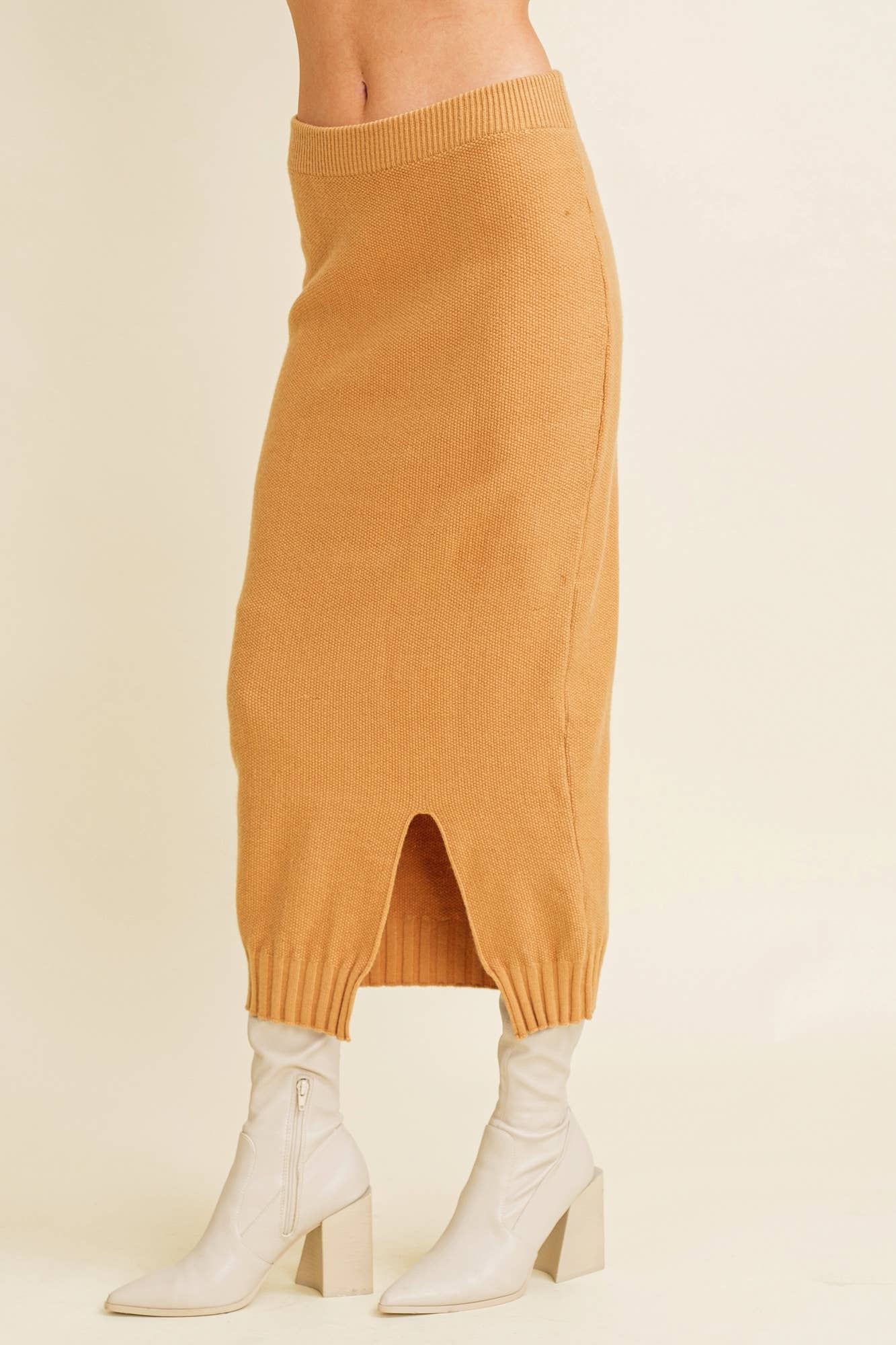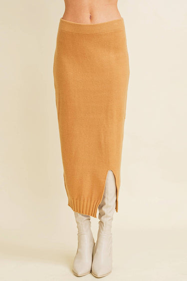Experience the perfect blend of style and comfort with Slit Hem Midi Knit Skirt. This contemporary fit skirt is perfect for the fall/winter season. Crafted from a blend of 50% Viscose, 28% Nylon, and 22% Polyester, it promises durability and a soft touch. The unique slit hem adds an edgy touch to your outfit, reflecting the modern contemporary woman. Whether you're following trends or starting them, this skirt is a wardrobe must-have.