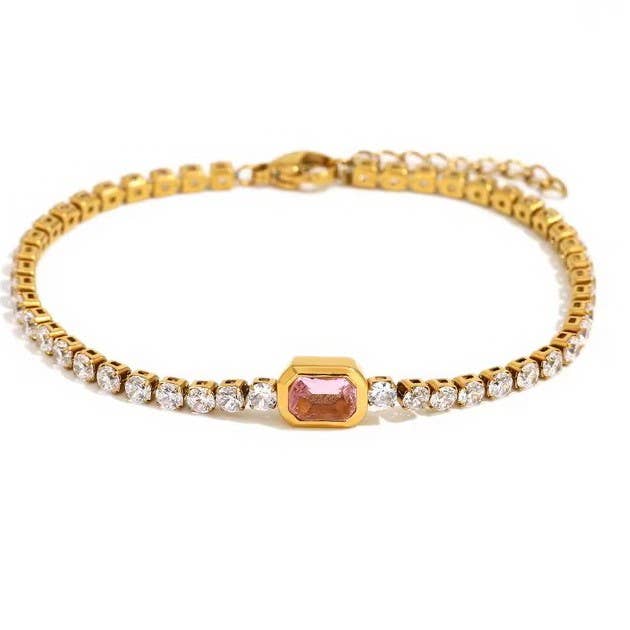 18K Stainless Steel Non-Tarnish Classic Gemstone Tennis Bracelet, this bracelet features a beautiful gemstone on rhinestone chain design crafted from premium 18K stainless steel. Its non-tarnish finish ensures lasting shine and durability, making it perfect for everyday elegance or layering with other pieces.