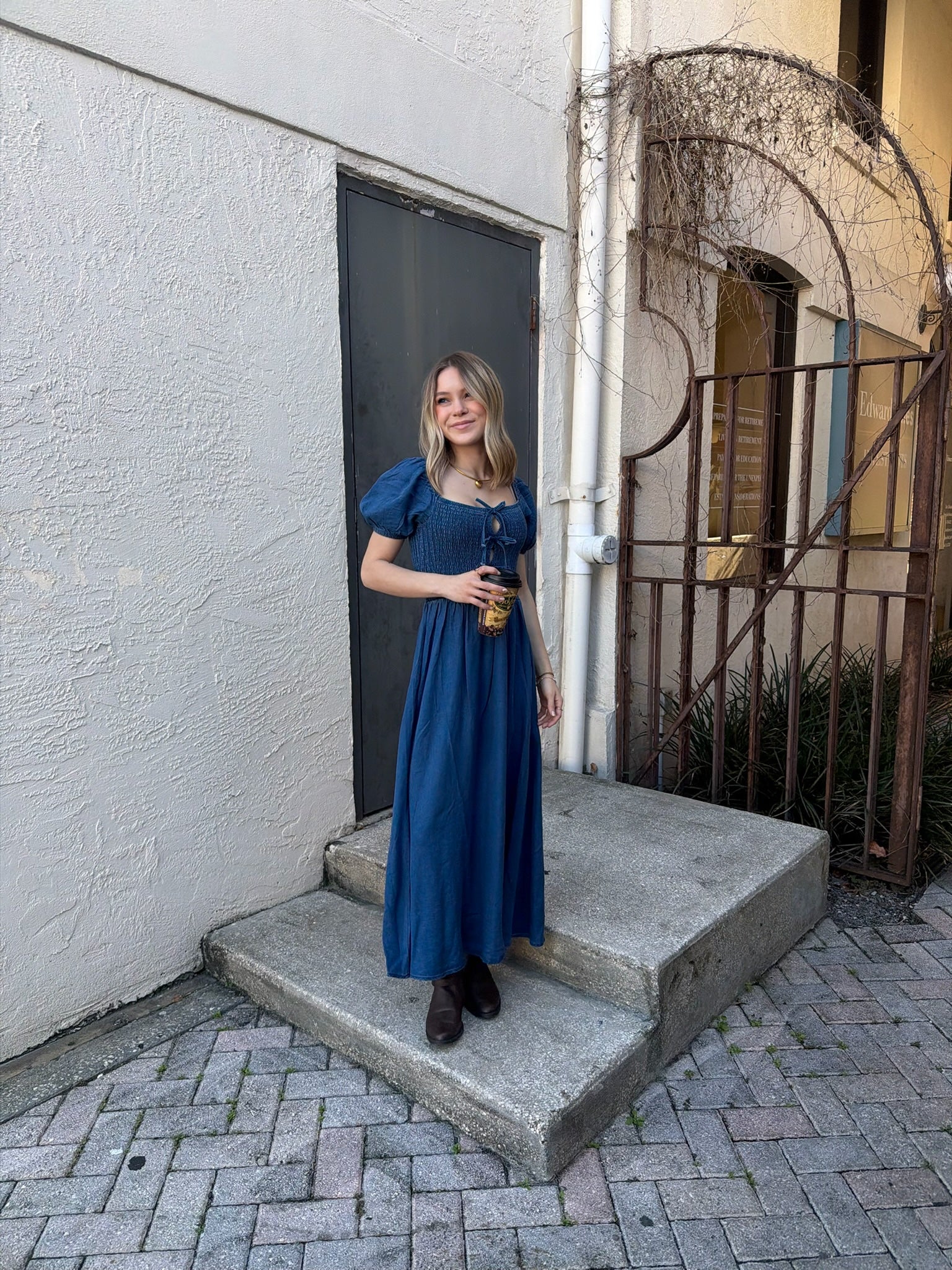 Effortlessly feminine with a touch of vintage charm, this denim-toned midi dress is made for sunny days and easy styling.