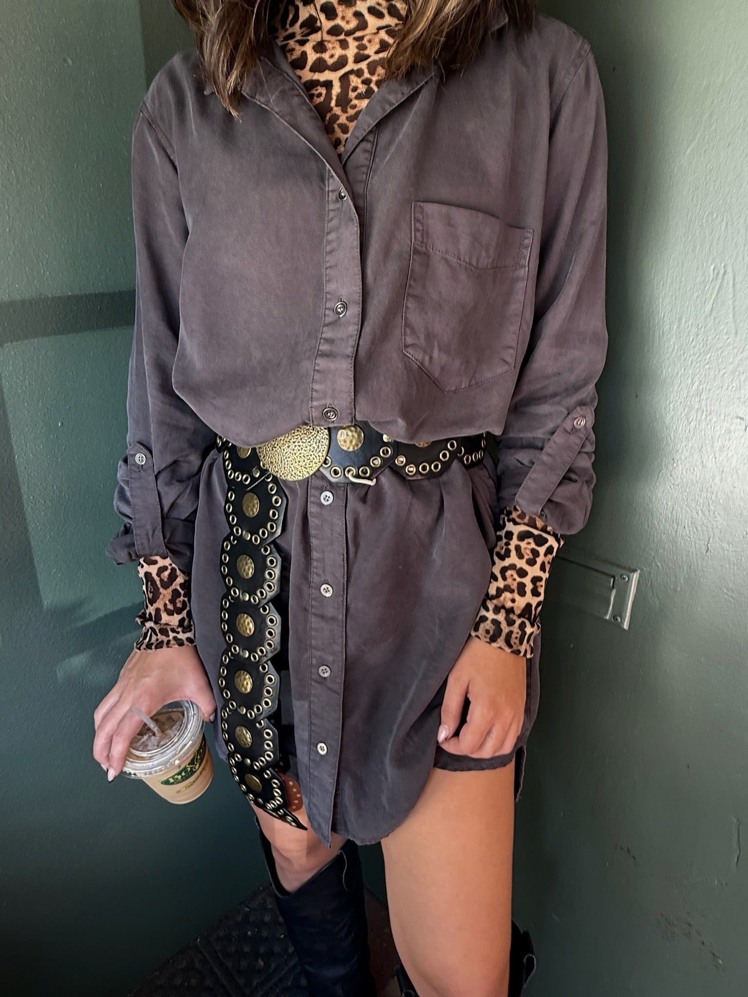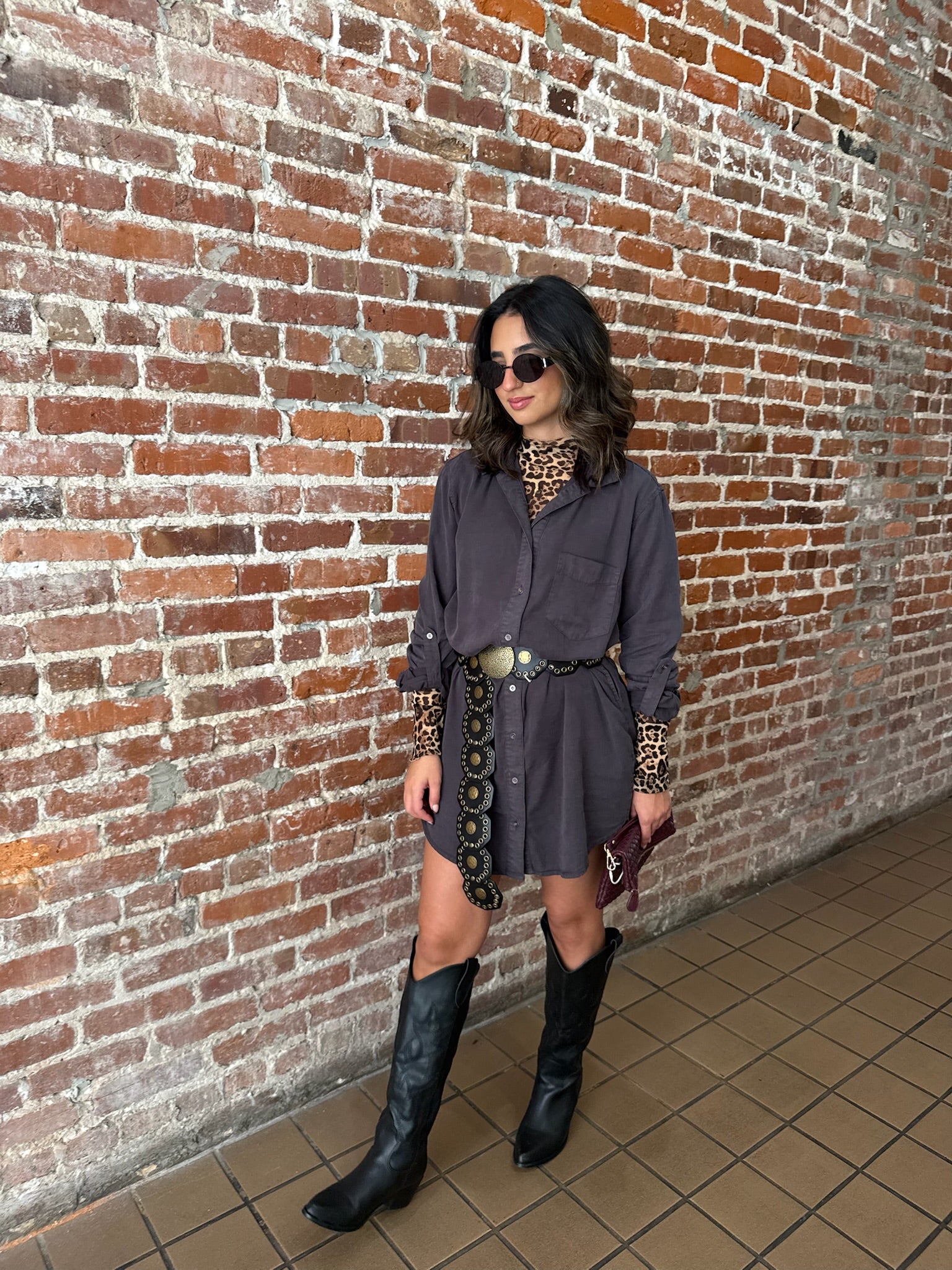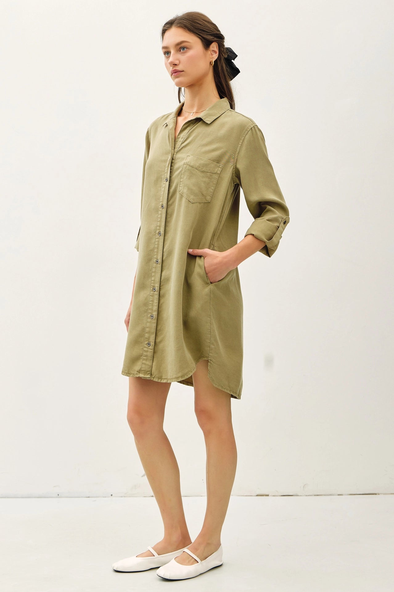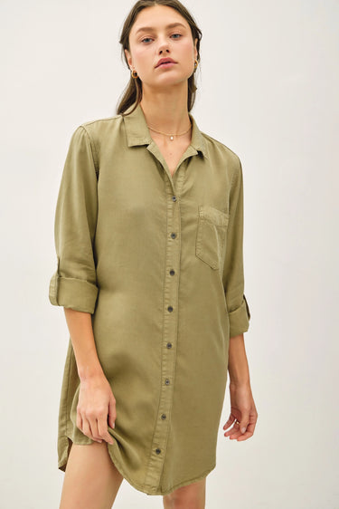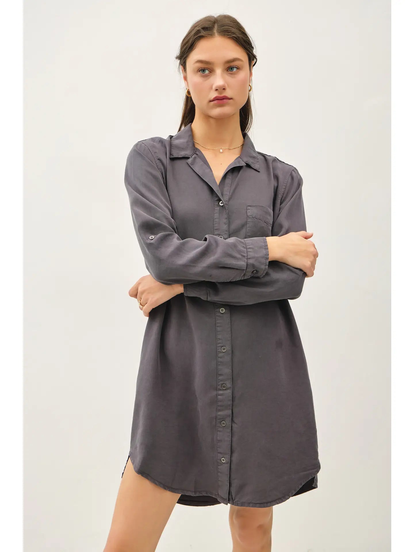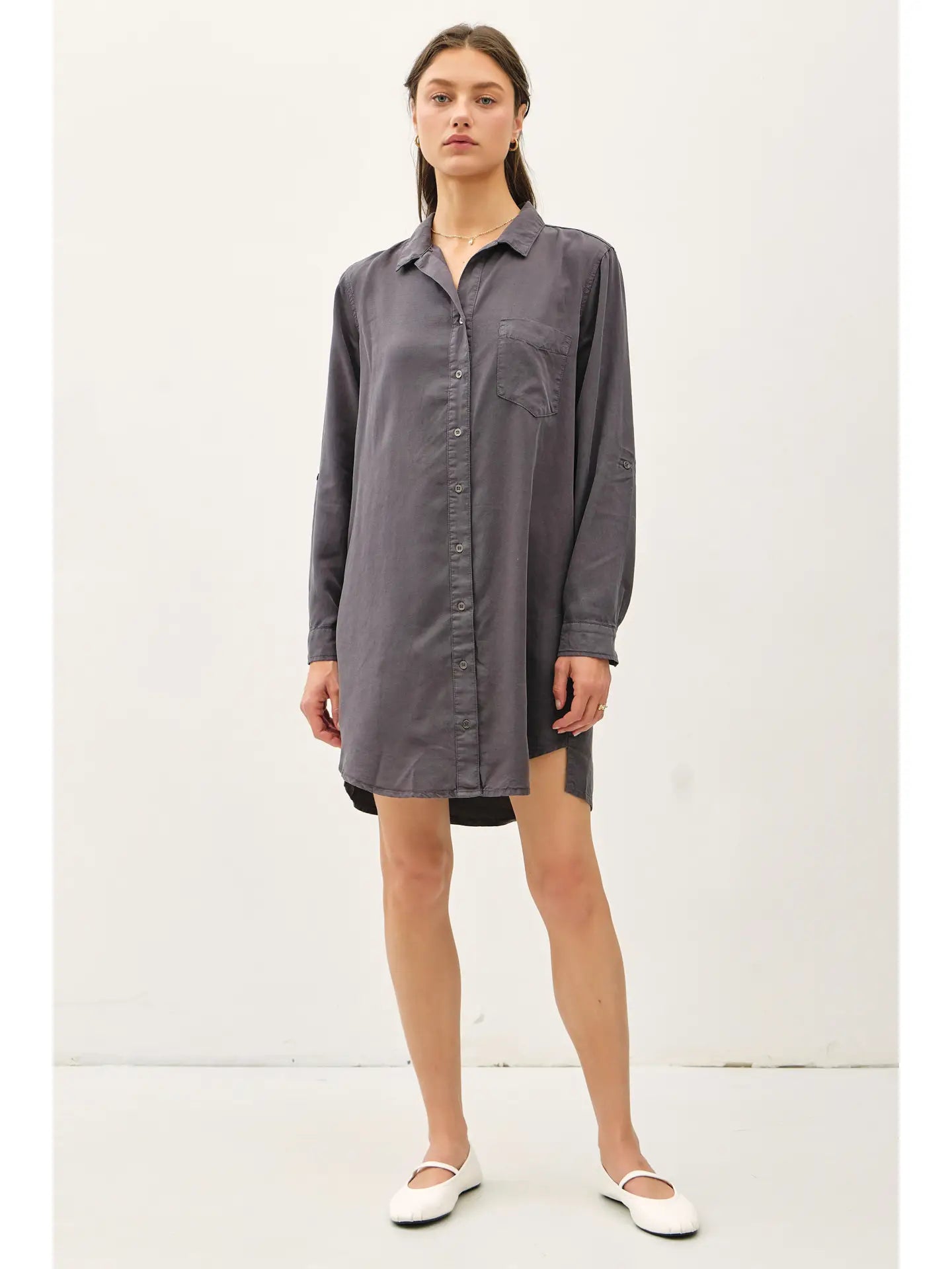 The Camden Shirt Dress is the perfect blend of casual comfort and polished style. Made from soft, breathable Tencel, this button-down dress features a classic collar, chest patch pocket, and functional side pockets for everyday ease. Long sleeves with roll-up tabs give you versatile styling, while the high-low hem and rounded bottom create a flattering, modern finish. Whether worn solo with sandals or layered over leggings and boots, this dress is a true wardrobe multitasker.