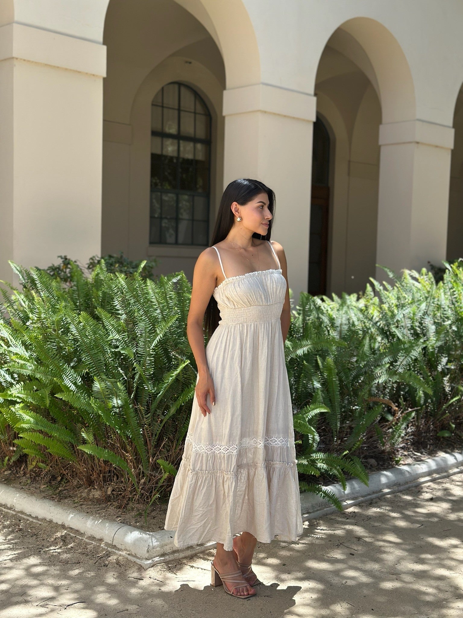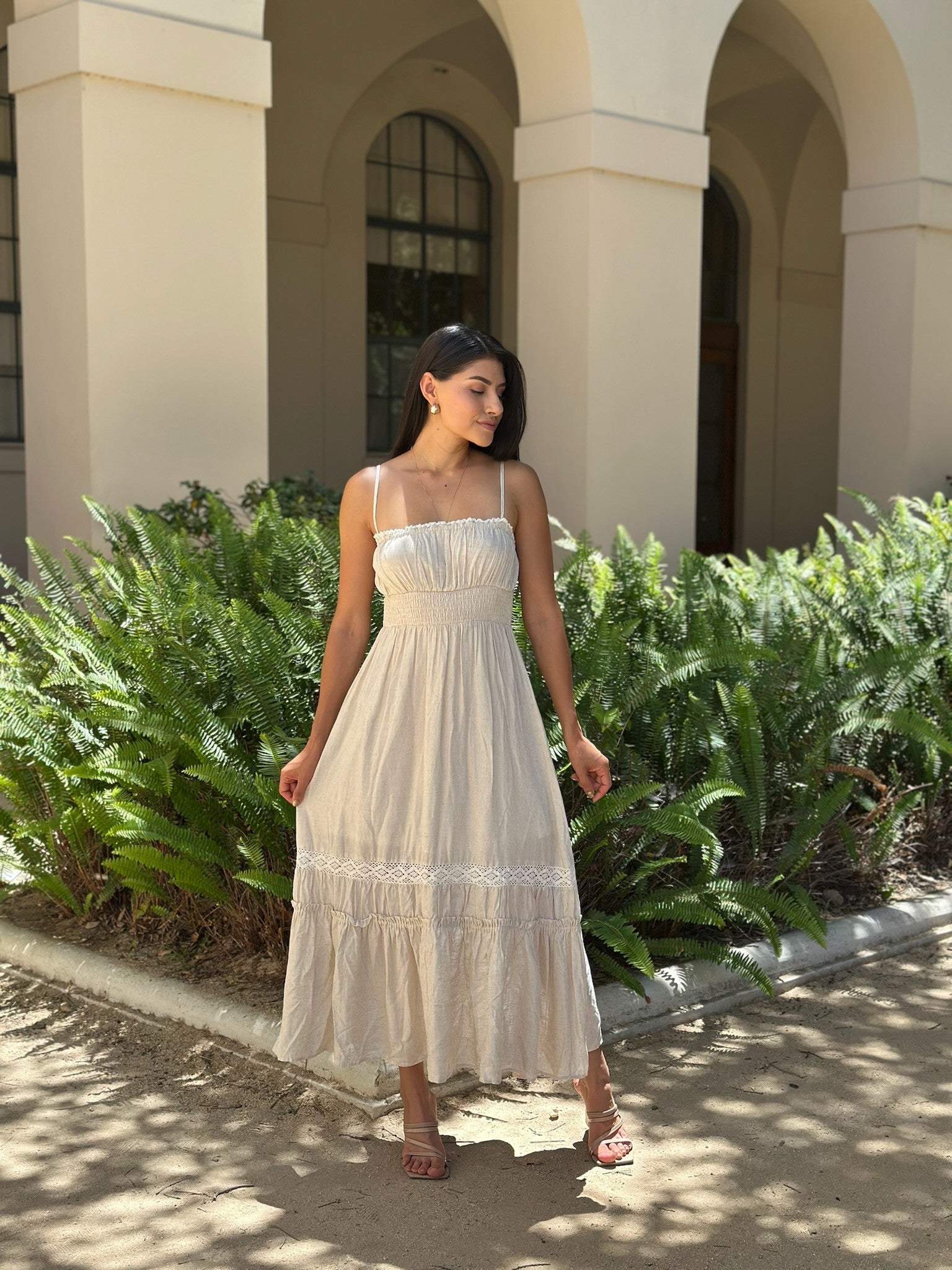 The Lila Smocked Maxi Dress is giving soft romance and effortless elegance. Featuring a smocked bodice with delicate adjustable straps, this dress flatters while keeping you comfortable all day long. The flowy maxi skirt is finished with lace inset details and a tiered ruffle hem that moves beautifully with every step. Light and breezy, it’s perfect for garden parties, beach strolls, or any day you want to feel effortlessly put together.