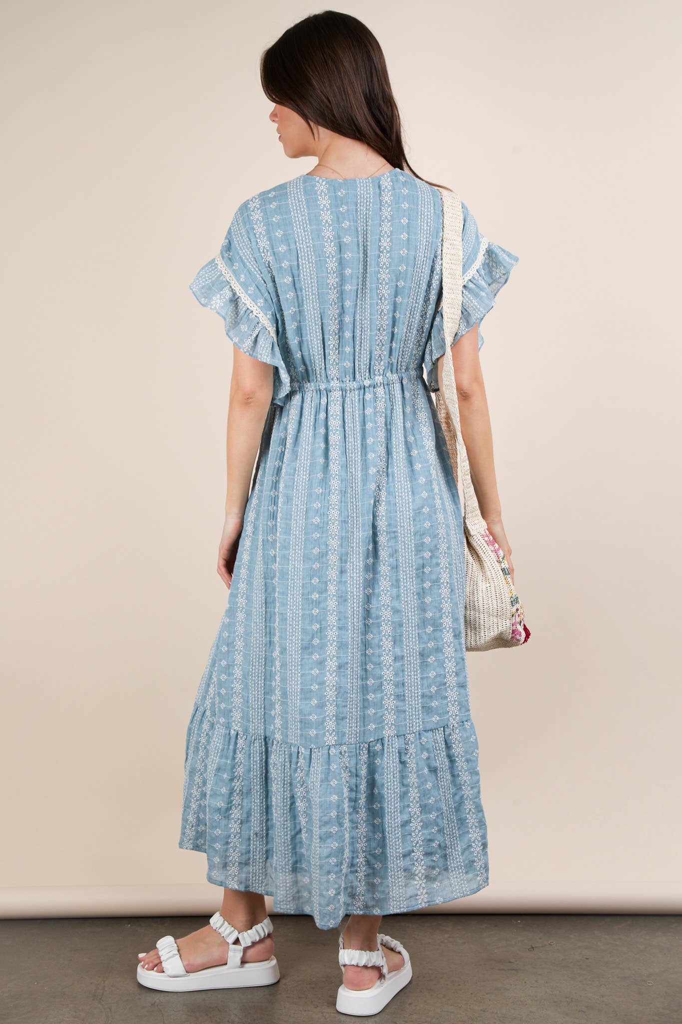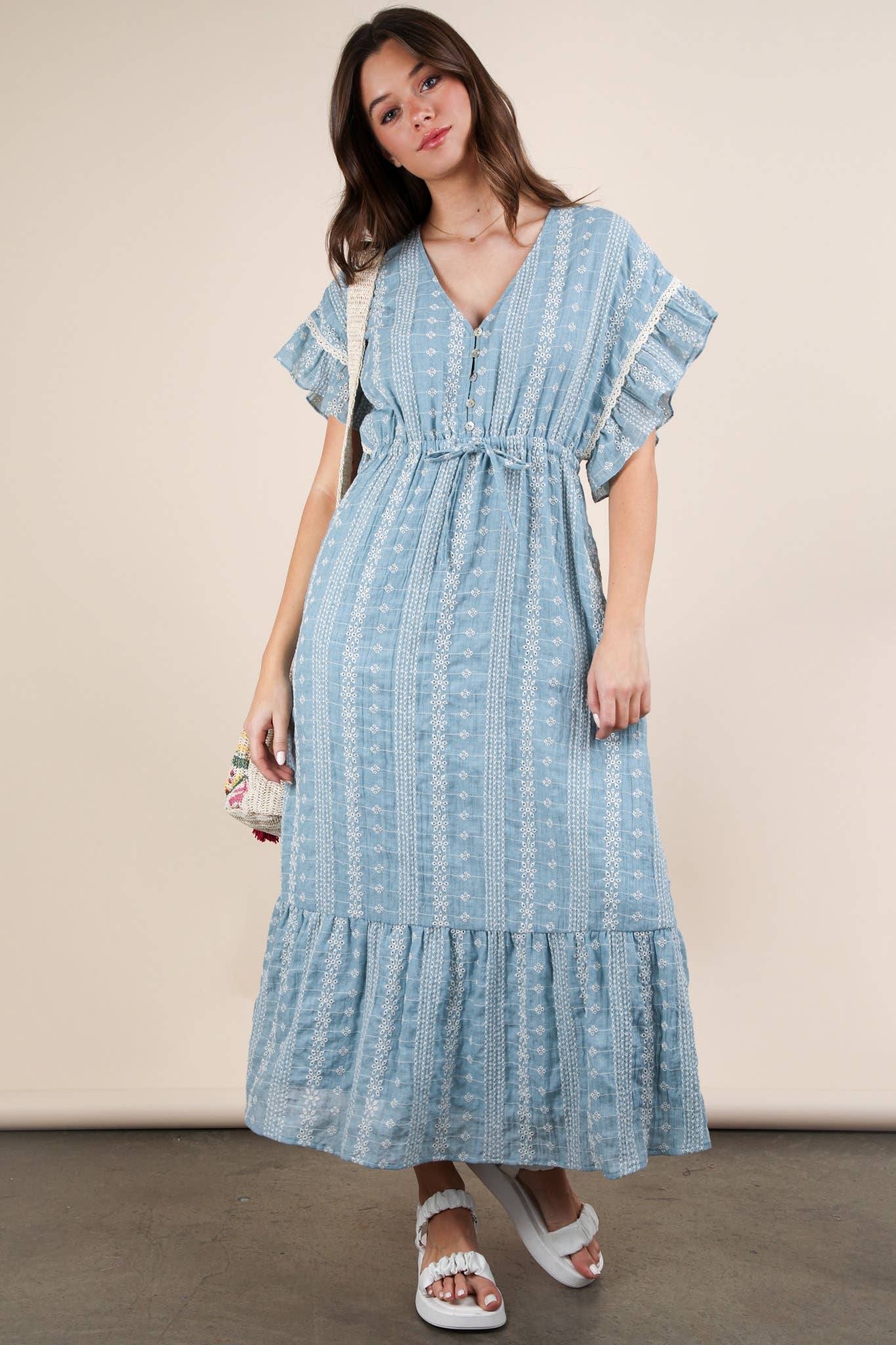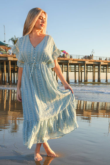 Free-spirited and feminine, the Saffron Boho Midi Dress is a true statement piece. Featuring delicate embroidery, a ruffled hem, and a button-down front, she’s designed with a flattering V-neckline and short sleeves. The adjustable waist drawstring cinches just right, while the lightweight lining keeps her easy and comfortable. Perfect for festivals, brunch, or sunset strolls.