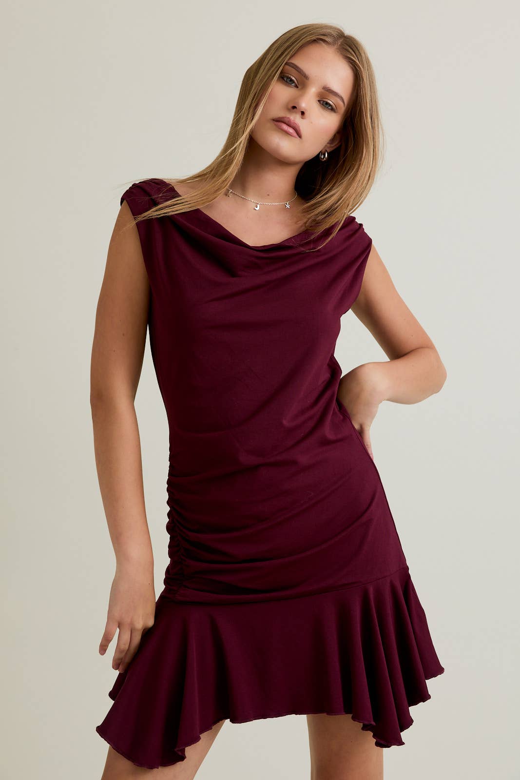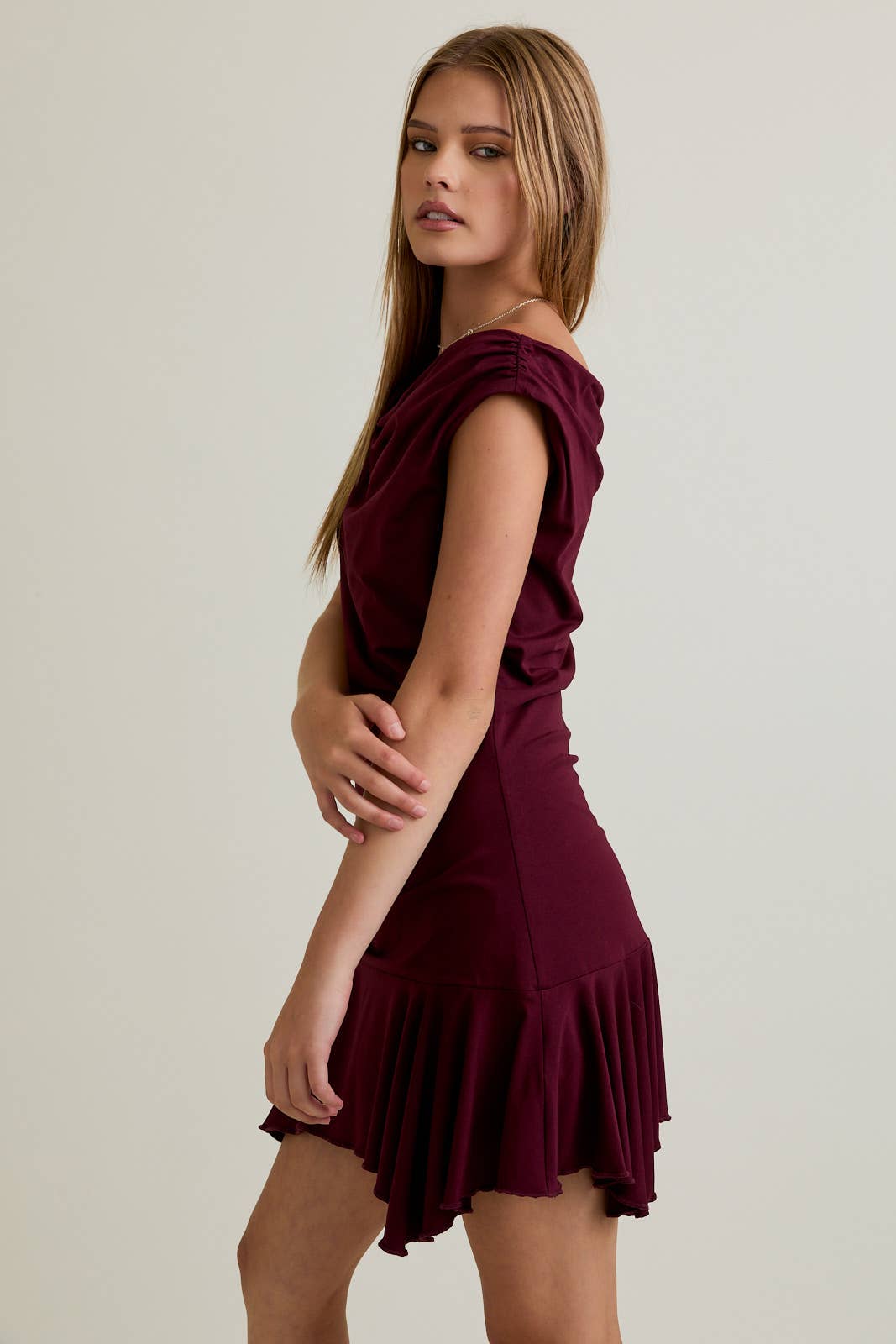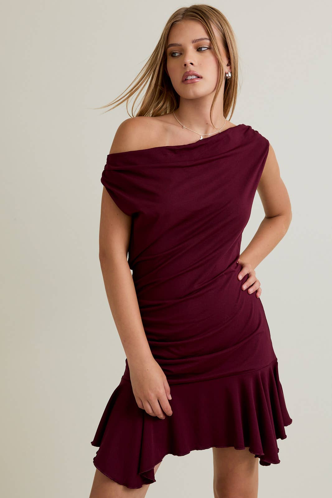 Bold and feminine, the Vivienne Ruffle Dress is designed to make an entrance. With its off-shoulder neckline, flattering ruching throughout, and playful ruffle hem, she’s the perfect mix of sultry and chic. The deep burgundy hue makes her a standout for date nights, parties, or any event where you want to turn heads.
