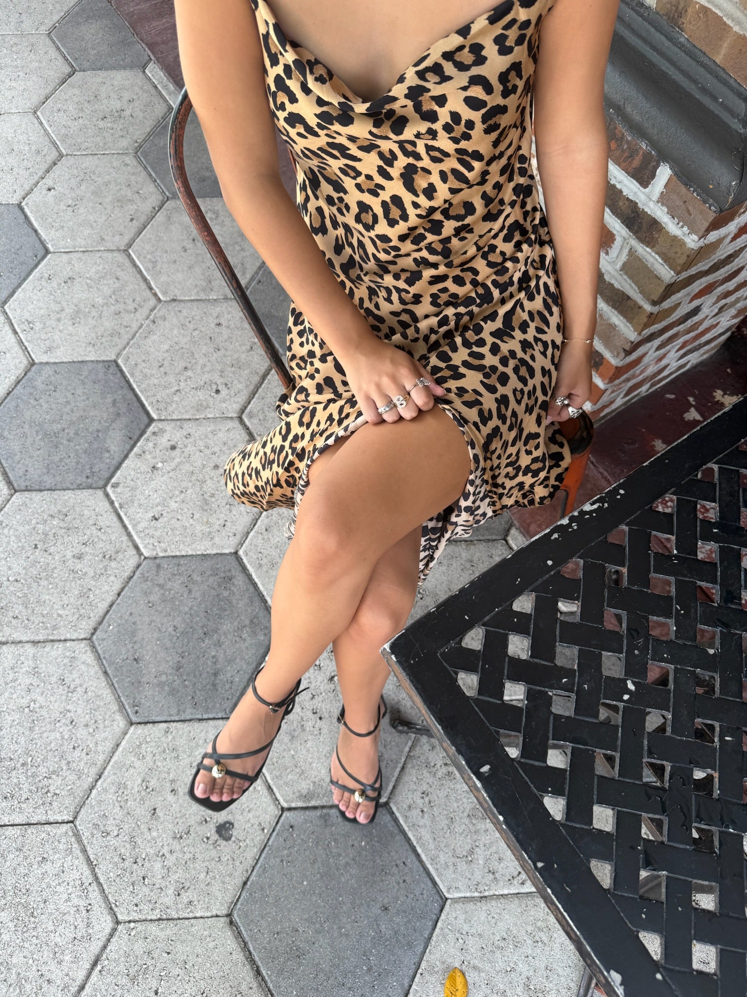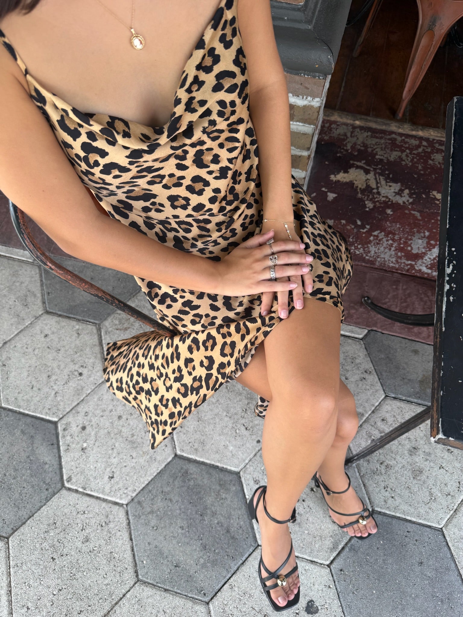 Sultry and sleek, the Selene Leopard Midi Dress is made to turn heads. Designed in a satin-feel metallic fabric, she features a soft cowl neckline, delicate spaghetti straps, and a bold leopard print that shines from every angle. The midi length with a flirty front slit makes her perfect for date nights, parties, or a night out with the girls.