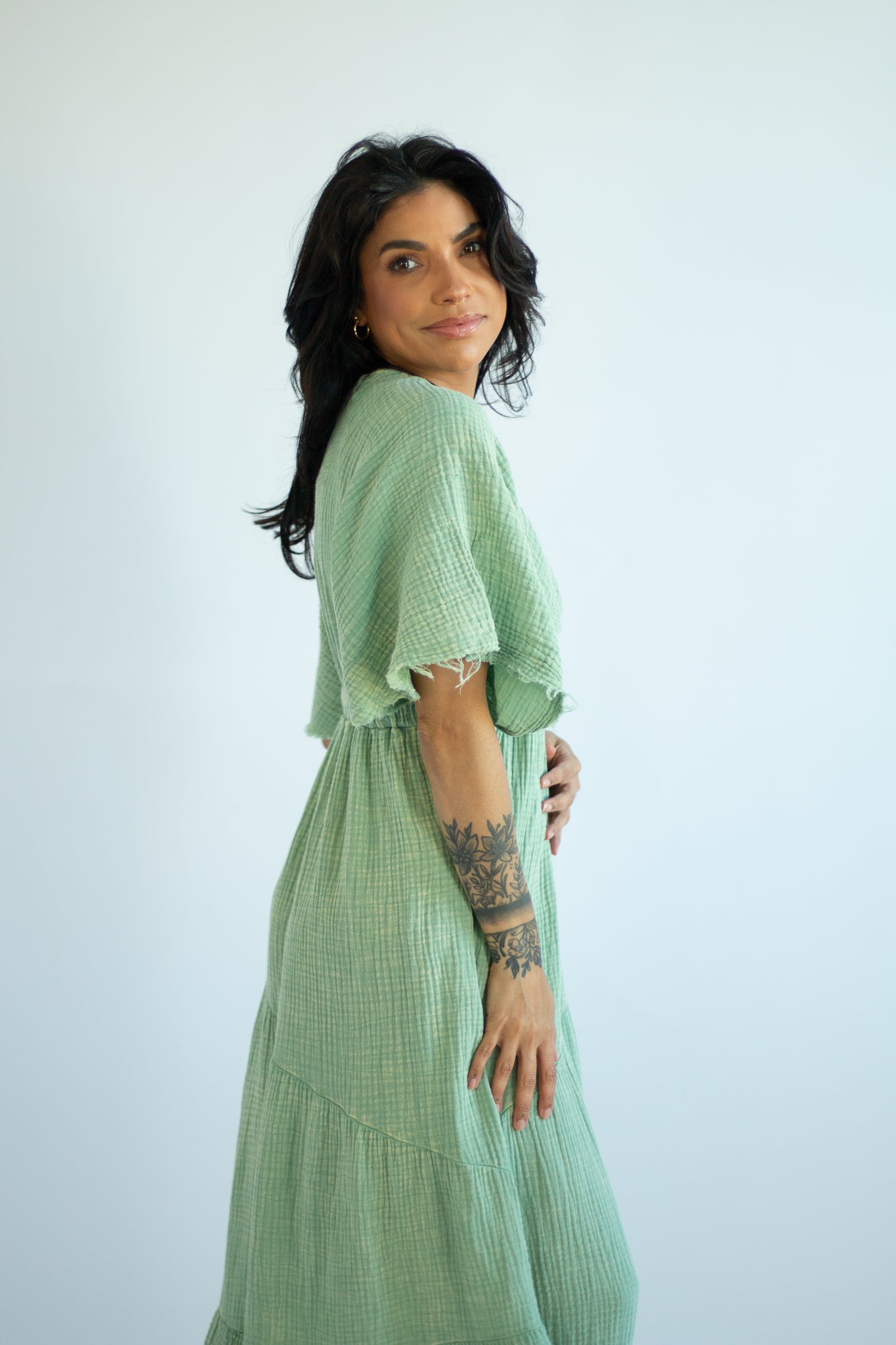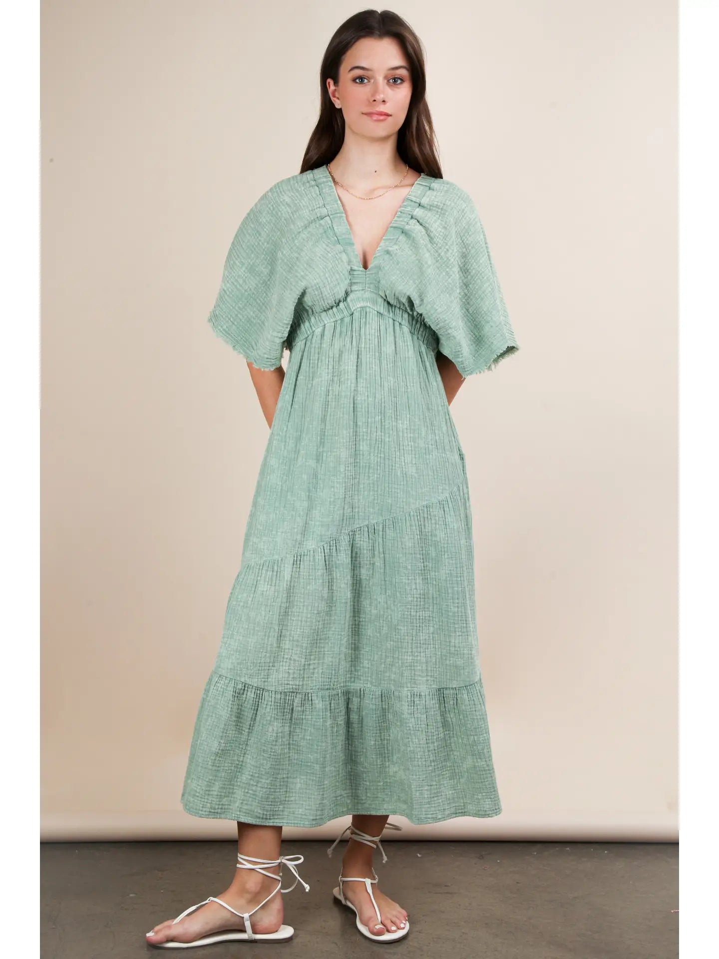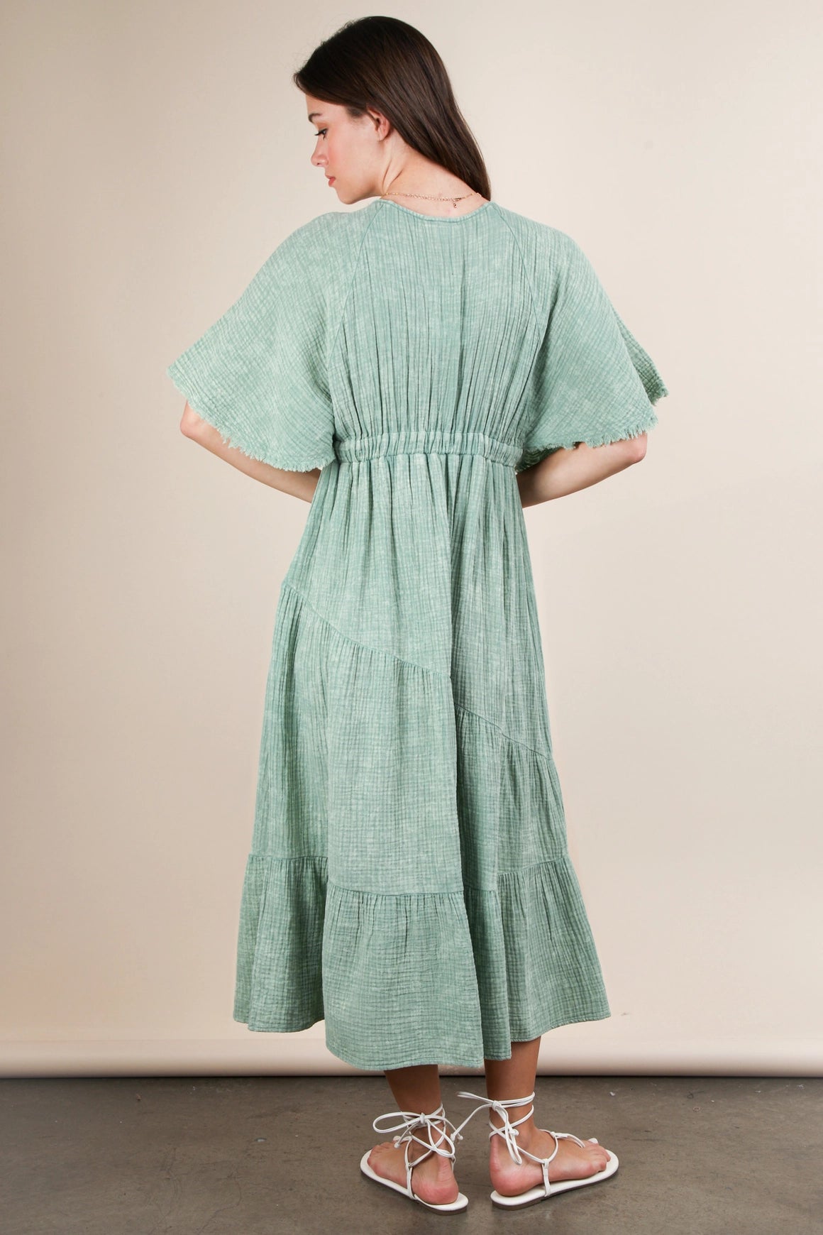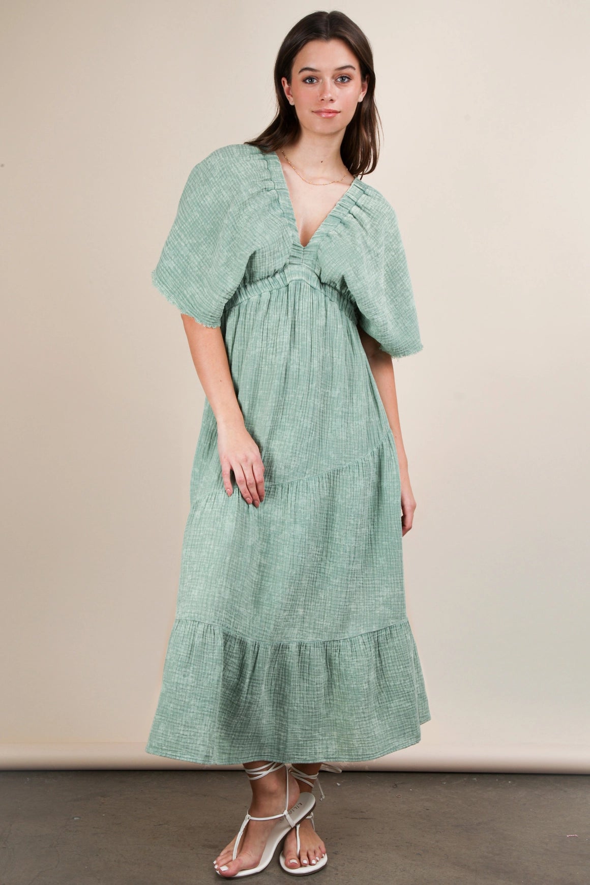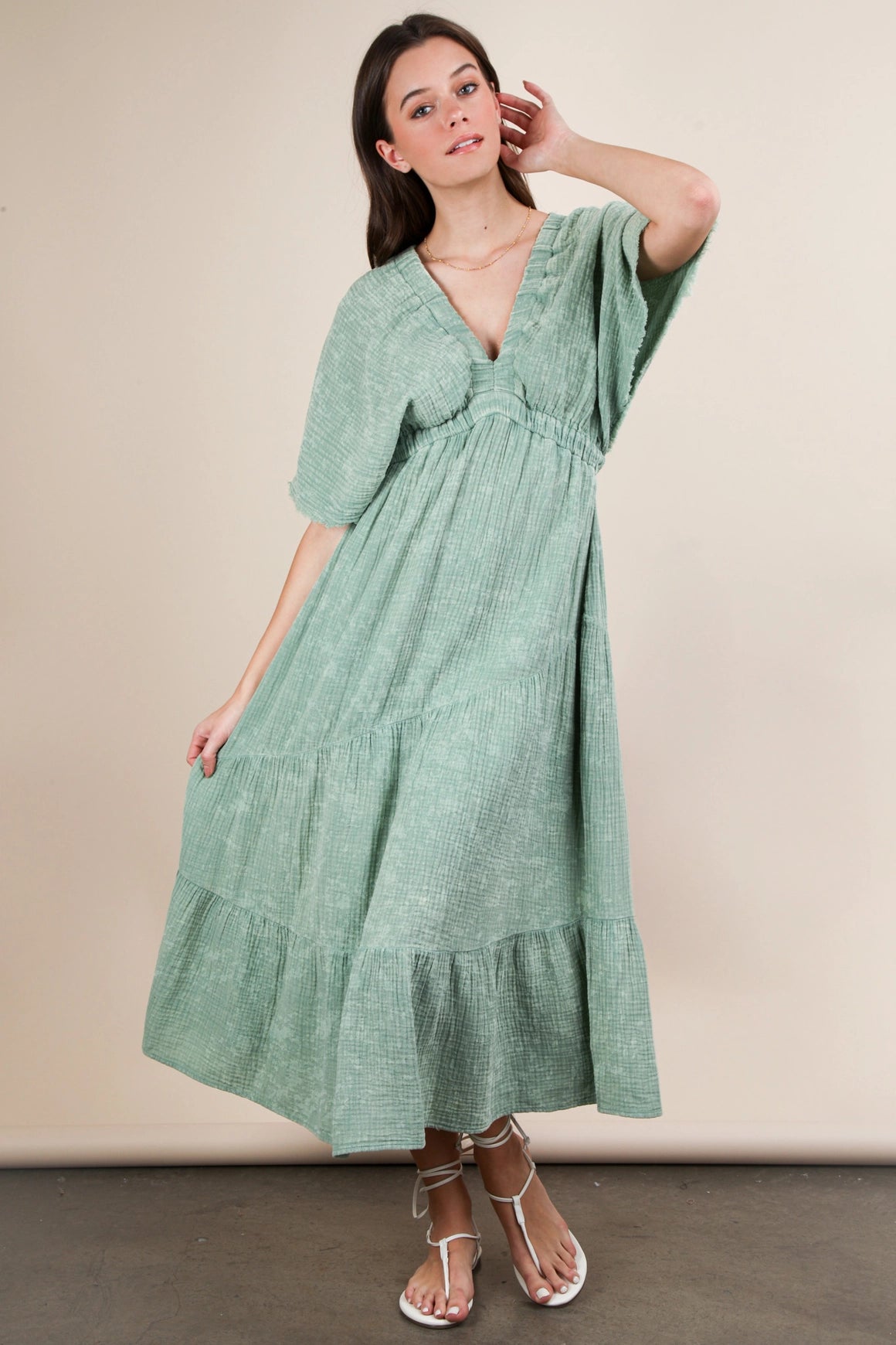Effortless with a touch of edge, the Serenity Dress is your new everyday statement. Designed in a soft mineral-washed fabric, she features an elastic V-neckline, short sleeves, and raw-edge detailing throughout. The asymmetrical tiered layers and shirring details give her that perfectly relaxed yet elevated vibe—making Marigold the dress you’ll live in from coffee runs to weekend plans.