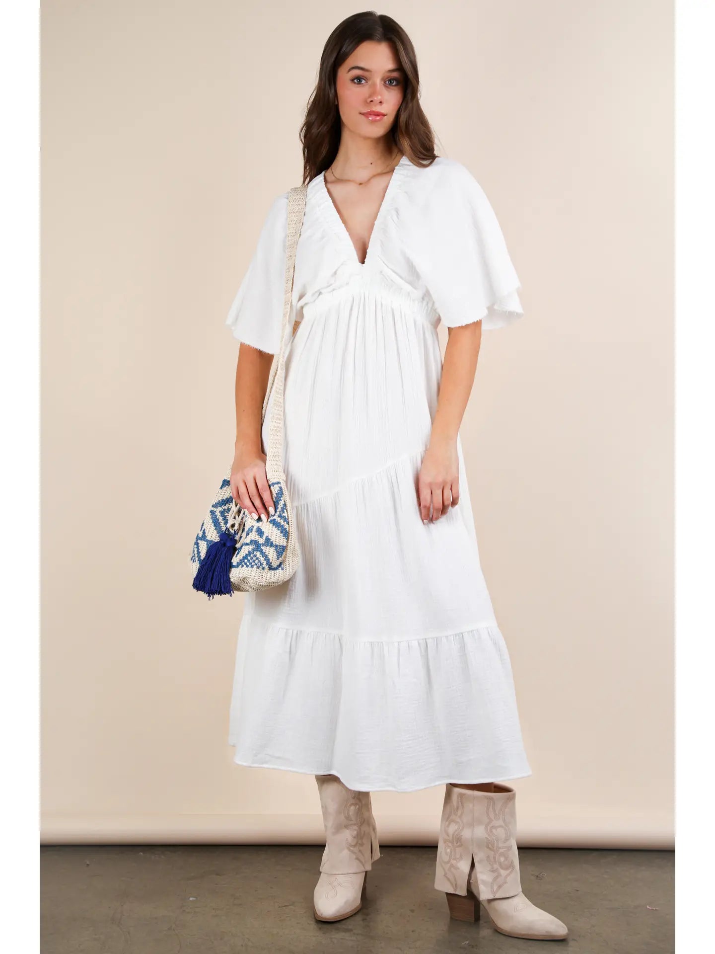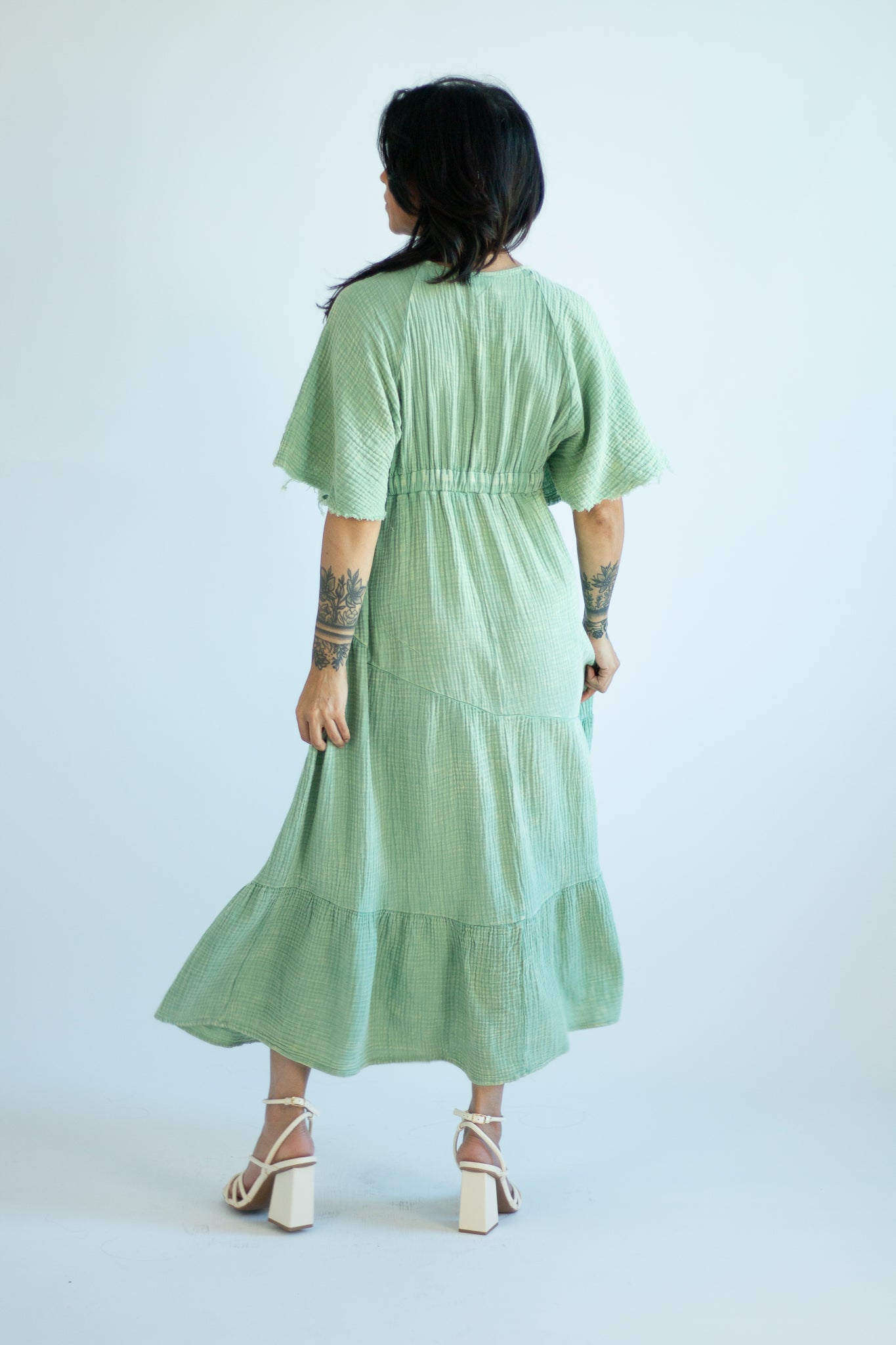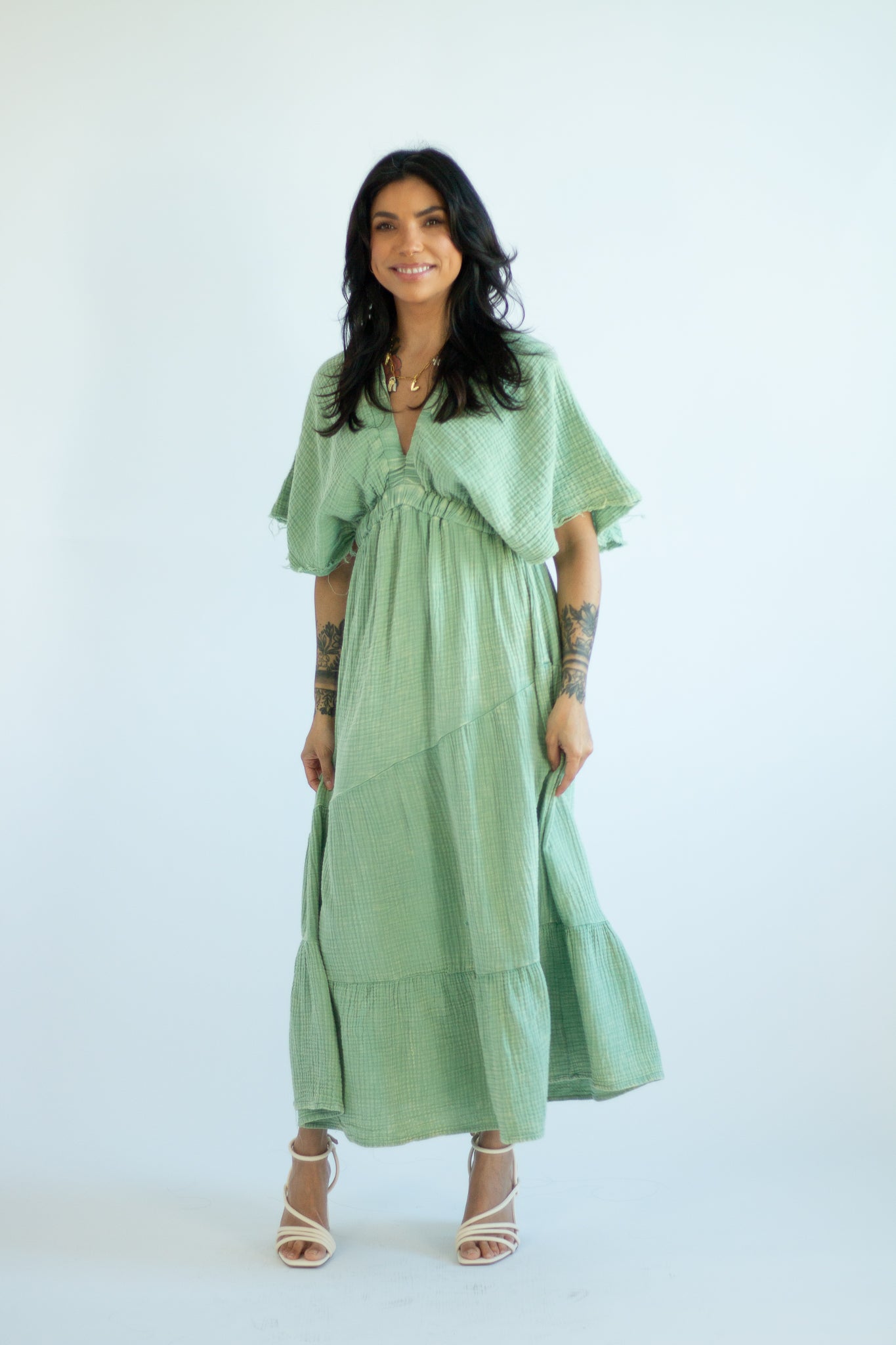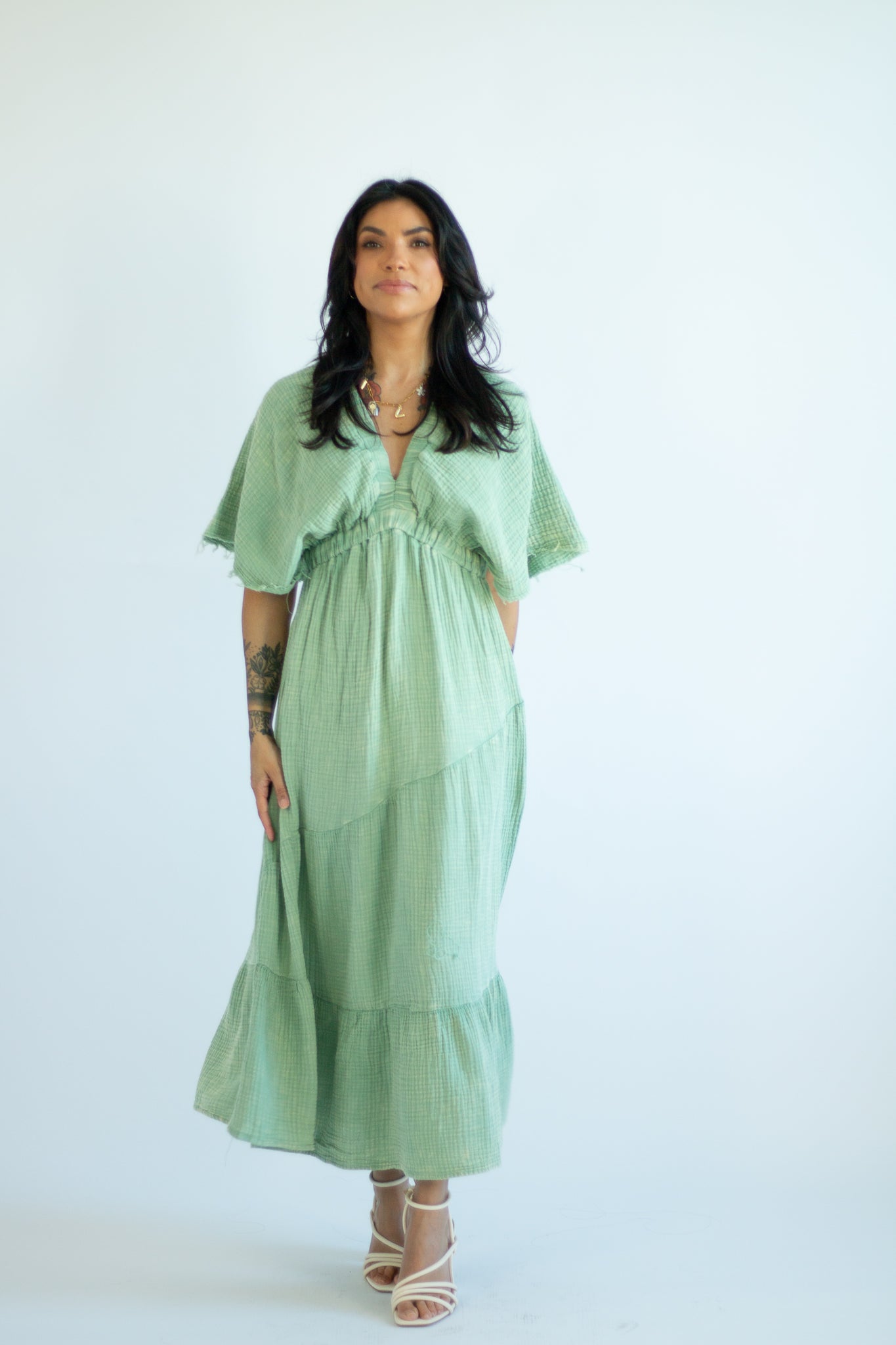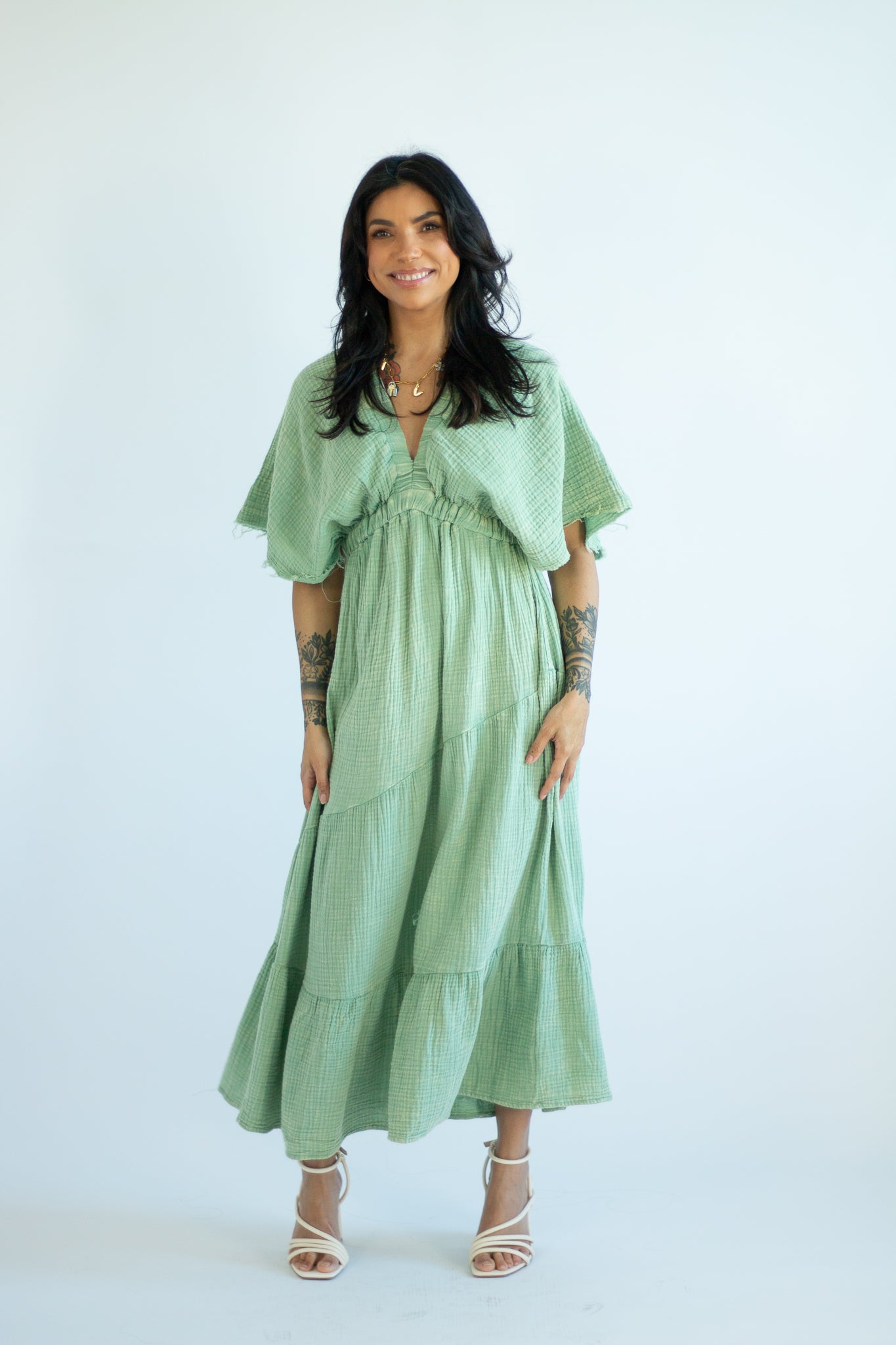 Effortless with a touch of edge, the Serenity Dress is your new everyday statement. Designed in a soft mineral-washed fabric, she features an elastic V-neckline, short sleeves, and raw-edge detailing throughout. The asymmetrical tiered layers and shirring details give her that perfectly relaxed yet elevated vibe—making Marigold the dress you’ll live in from coffee runs to weekend plans.