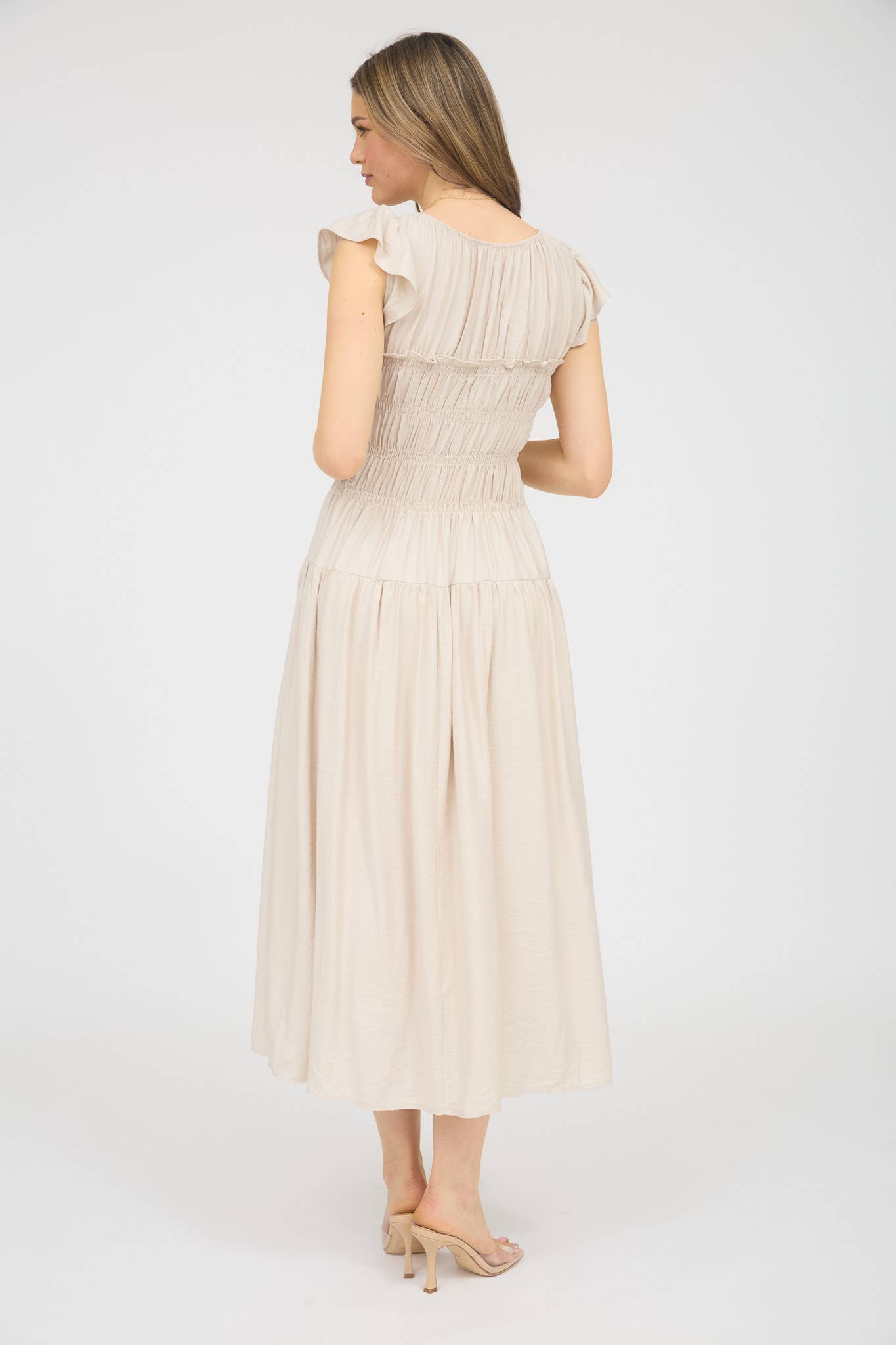Effortless and romantic, the Maren Midi Dress is a timeless piece you’ll want in every color. Designed with a flattering scoop neckline, ruffle sleeves, and a front tie detail, she’s finished with a shirred bodice that hugs just right before flowing into an easy A-line skirt. Fully lined for comfort, she’s the perfect pick for weddings, brunch, or sunset strolls.