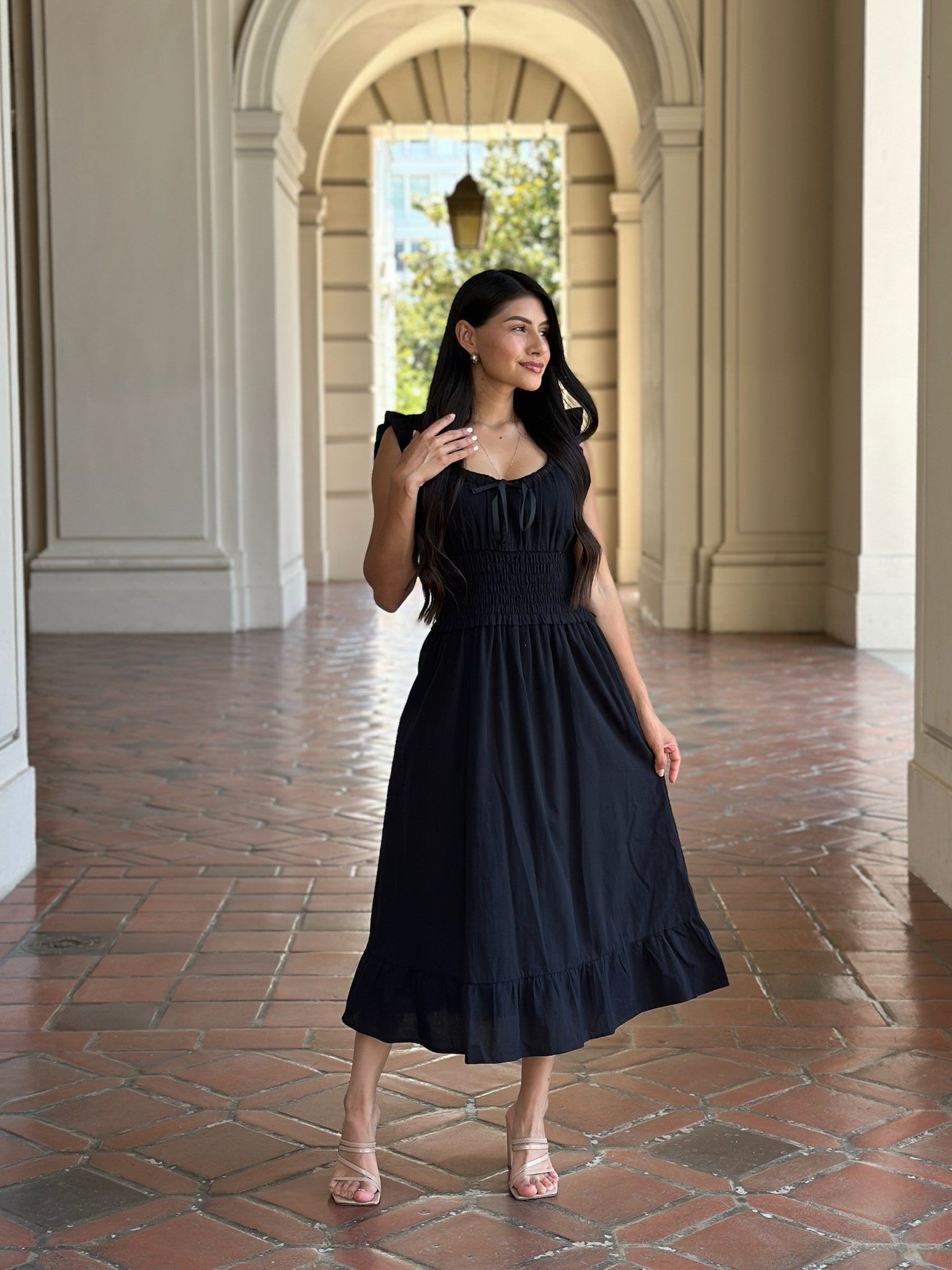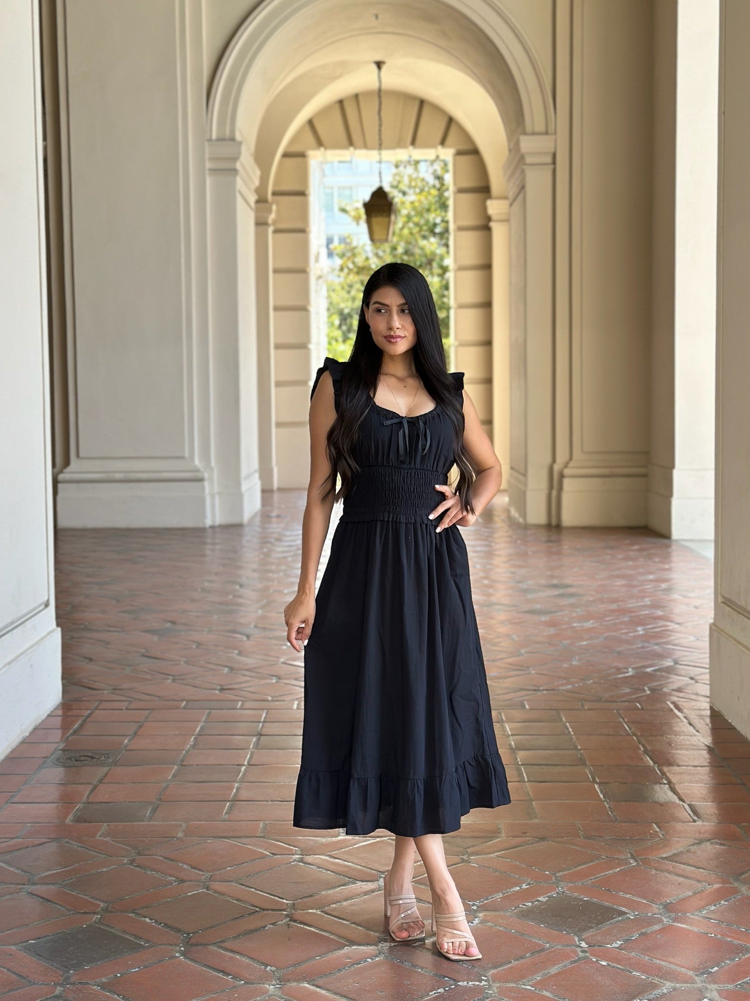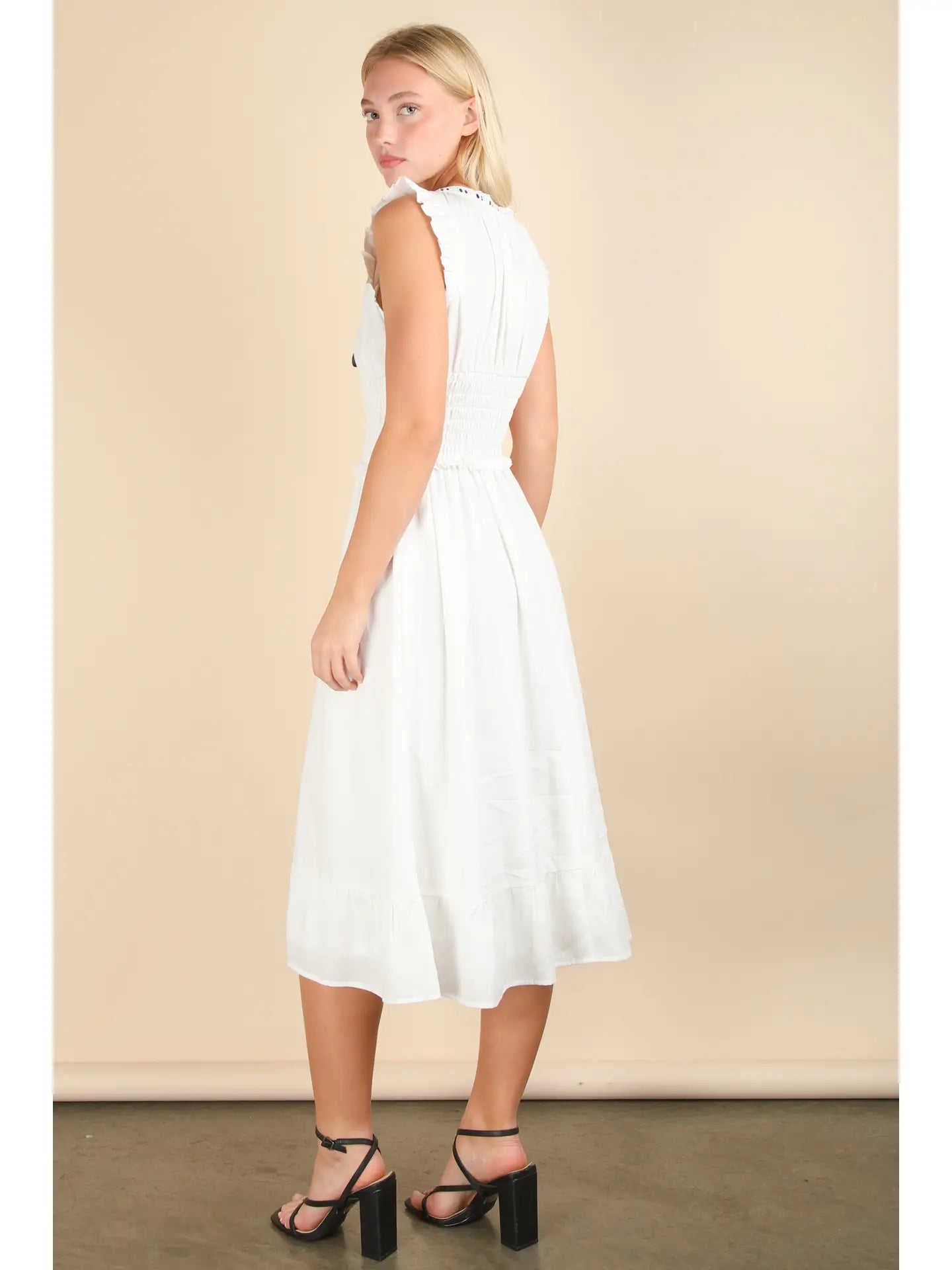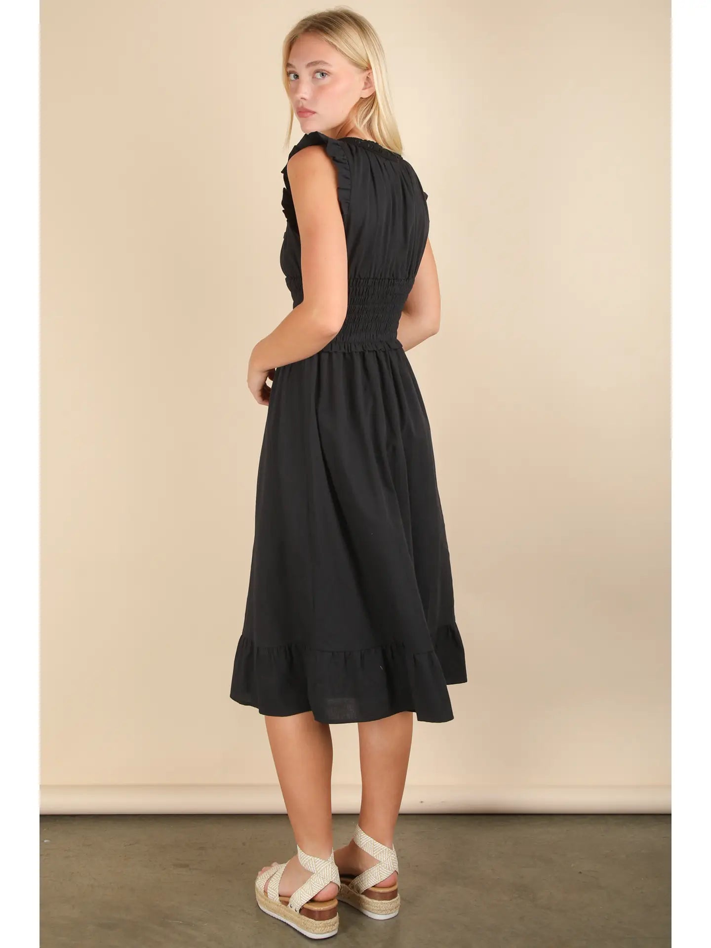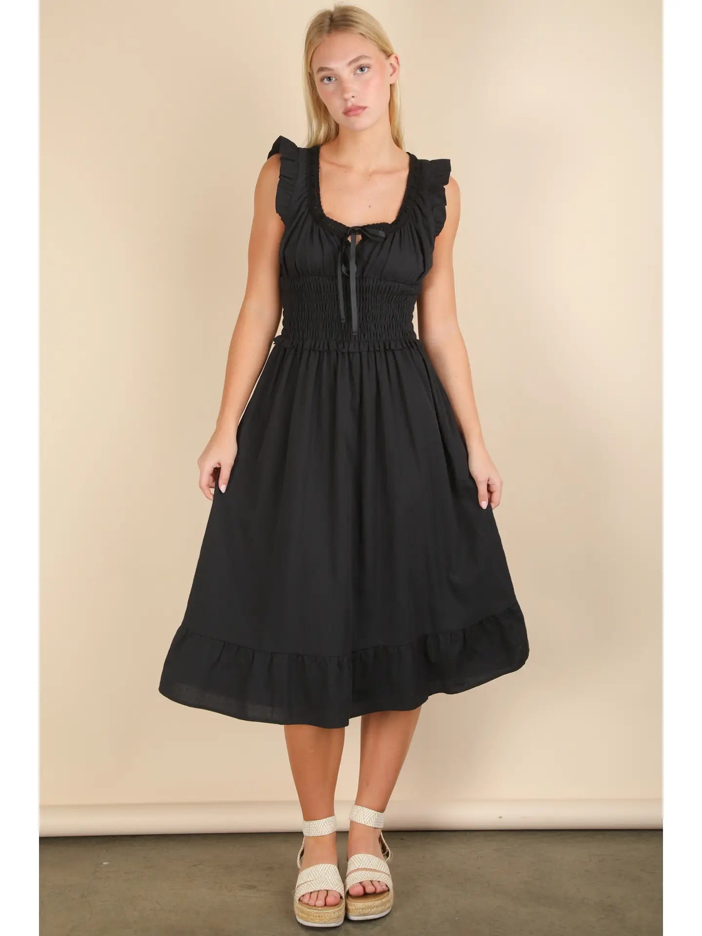 The Timeless Smocked Midi Dress is that effortlessly chic piece your wardrobe needs. Designed with a flattering scoop neckline and ruffle-trimmed sleeves, this dress features a smocked waist that cinches you in while keeping things comfortable. The flowy A-line skirt finishes with a ruffle hem for a touch of movement and romance. Fully lined and made from breathable cotton, it’s the perfect balance of polished and relaxed—ideal for brunch, date nights, or daytime events.