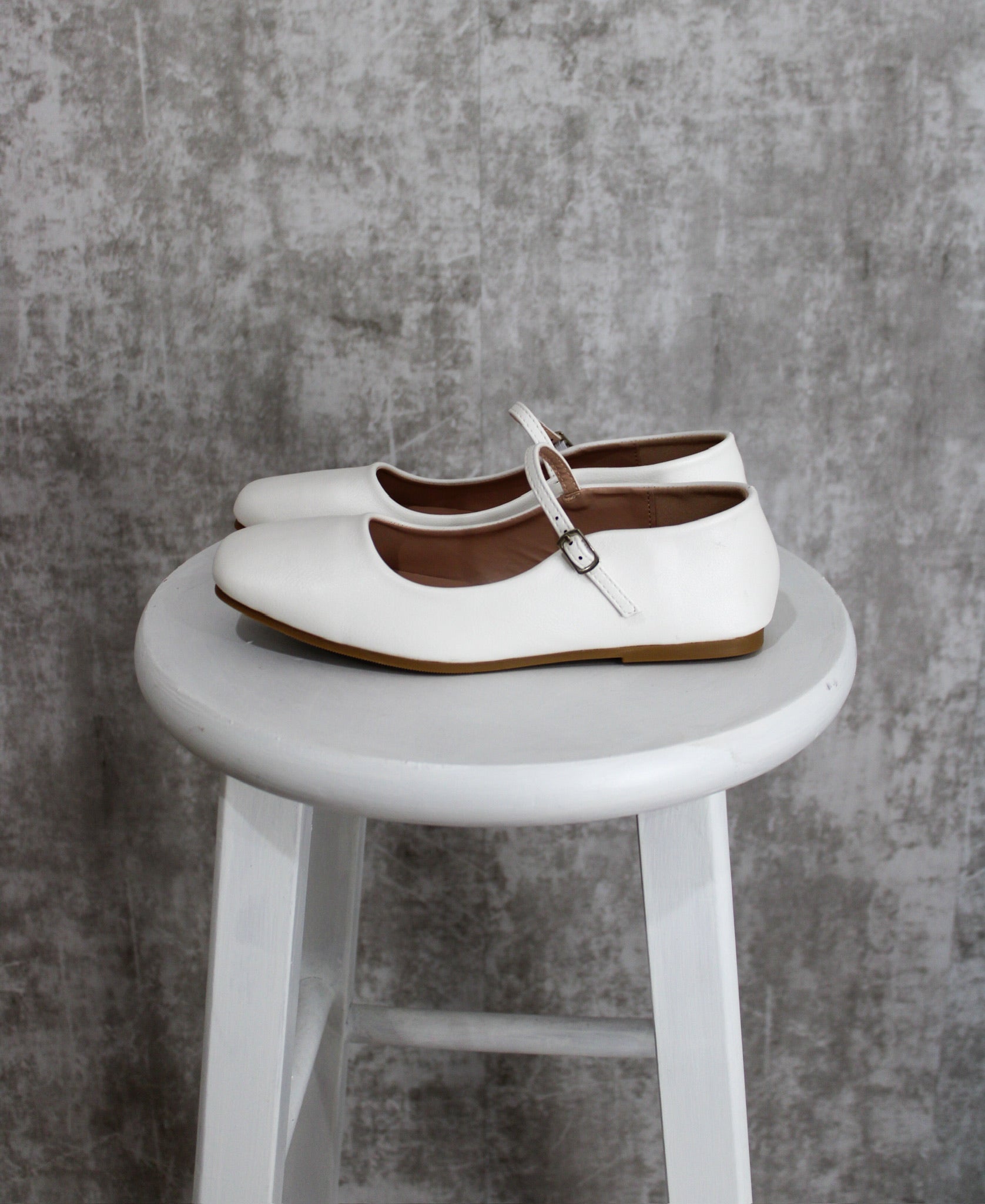 Our Gerri Flats feature a classic ballet cut, single mary jane strap, adjustable buckle closure, squared toe and soft nubuck vegan leather. Pair with everyting you own! Also available in black.