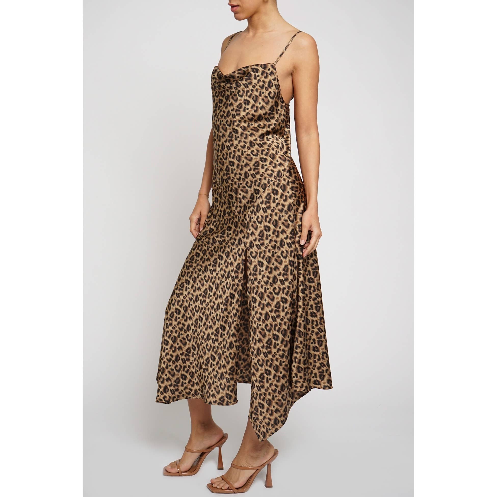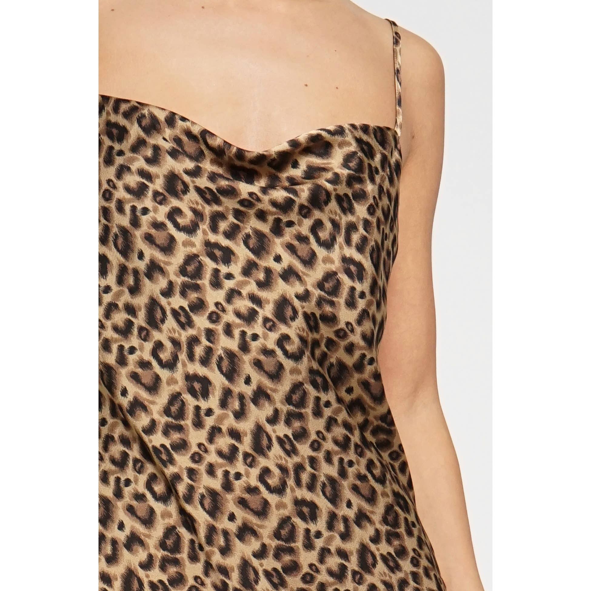 Sultry and sleek, the Selene Leopard Midi Dress is made to turn heads. Designed in a satin-feel metallic fabric, she features a soft cowl neckline, delicate spaghetti straps, and a bold leopard print that shines from every angle. The midi length with a flirty front slit makes her perfect for date nights, parties, or a night out with the girls.