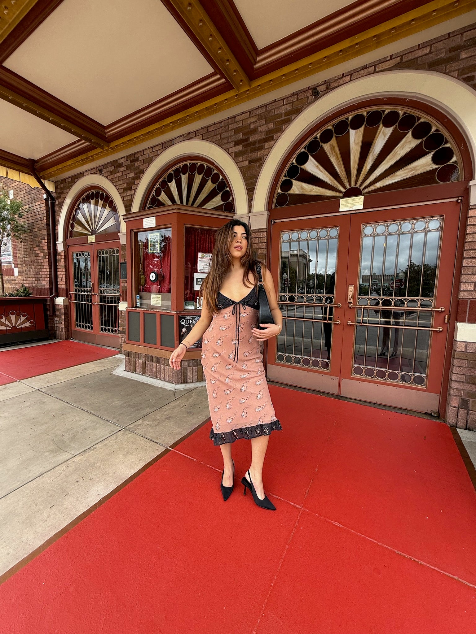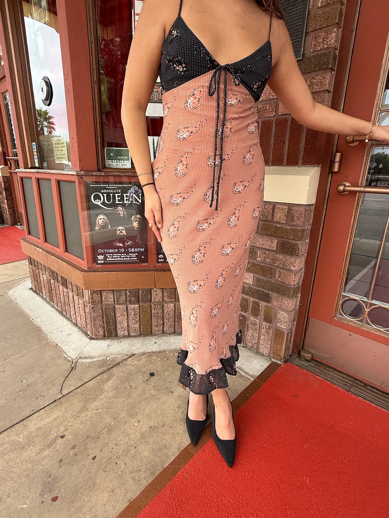The Verona Nights Midi Dress is where vintage romance meets modern femininity. Featuring a delicate paisley print and soft ruffled hem, this slip-style dress was made for golden hour dinners and weekend getaways. The contrasting polka dot bust and hemline add a playful, editorial touch, while the tie-front neckline and adjustable straps make it effortlessly flattering. Crafted from a lightweight, silky fabric, this piece moves beautifully with every step — perfect for layering under a cropped cardigan or pairing with boots for fall.