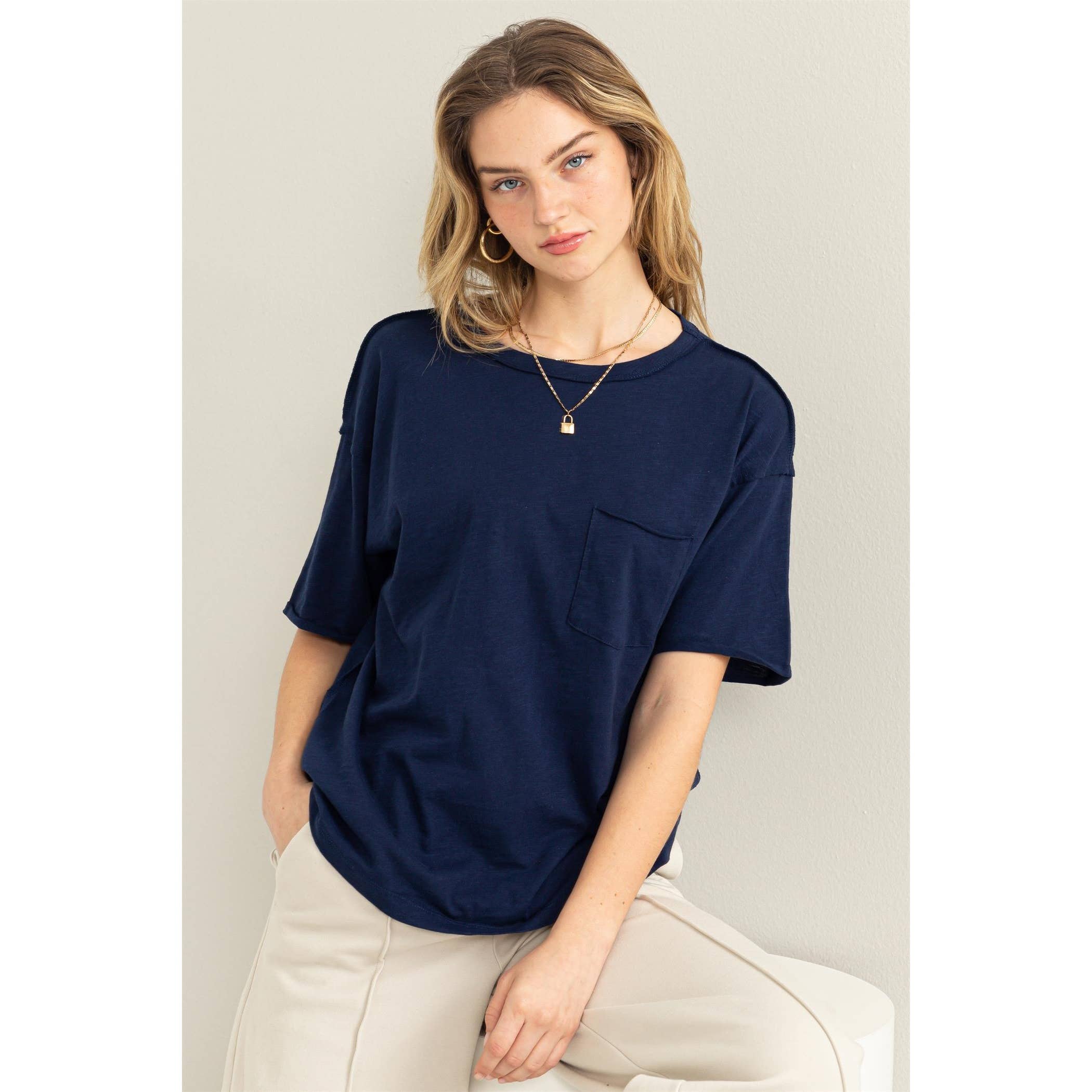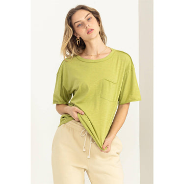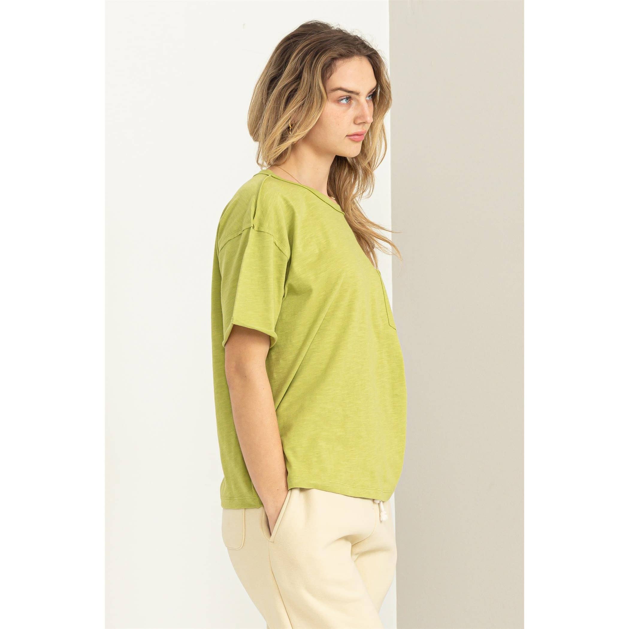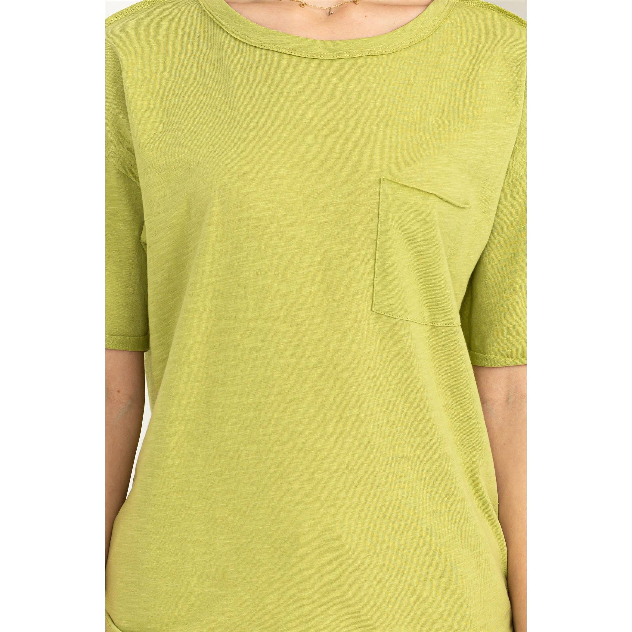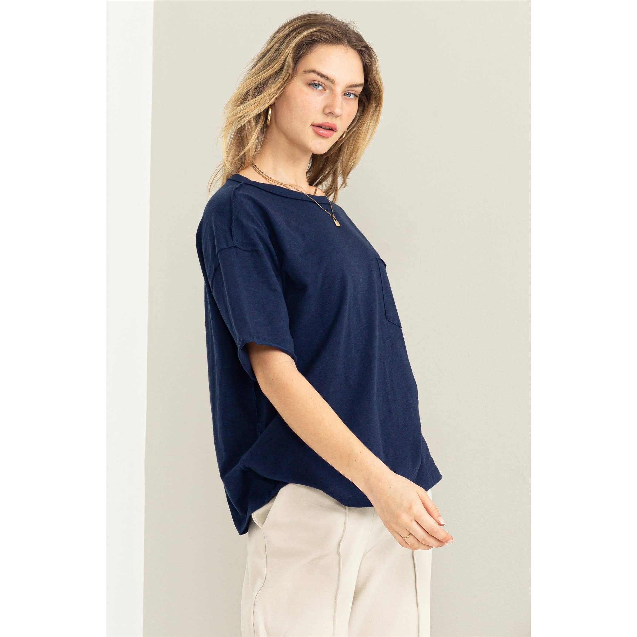 Featuring A Round Neckline, Drop Shoulders, And Short Sleeves. Designed With A Loose-Fit Bodice And Finished With A Functional Front Patch Pocket. Constructed From Lightweight Fabric, Suitable For Everyday Casual Styling.