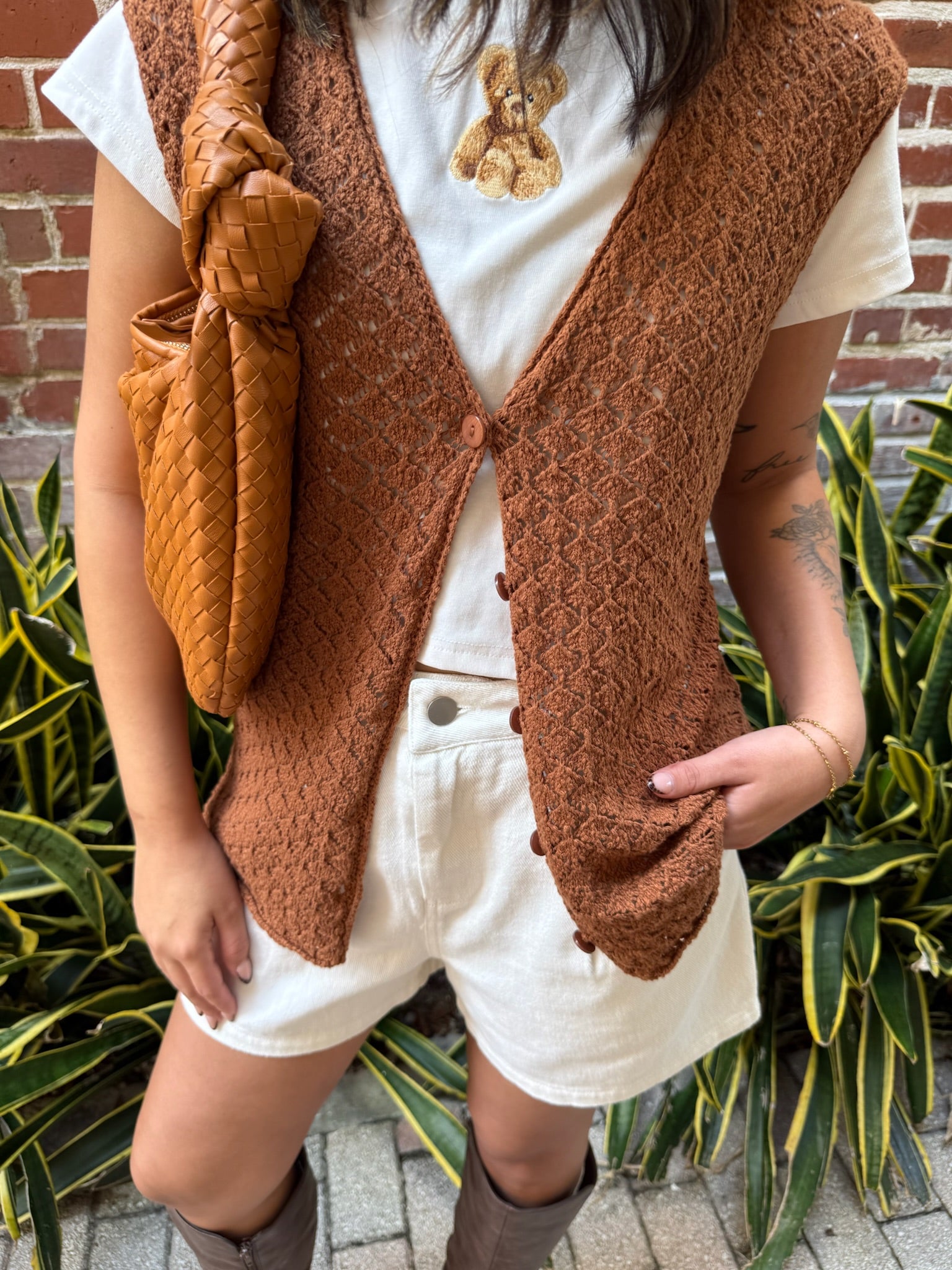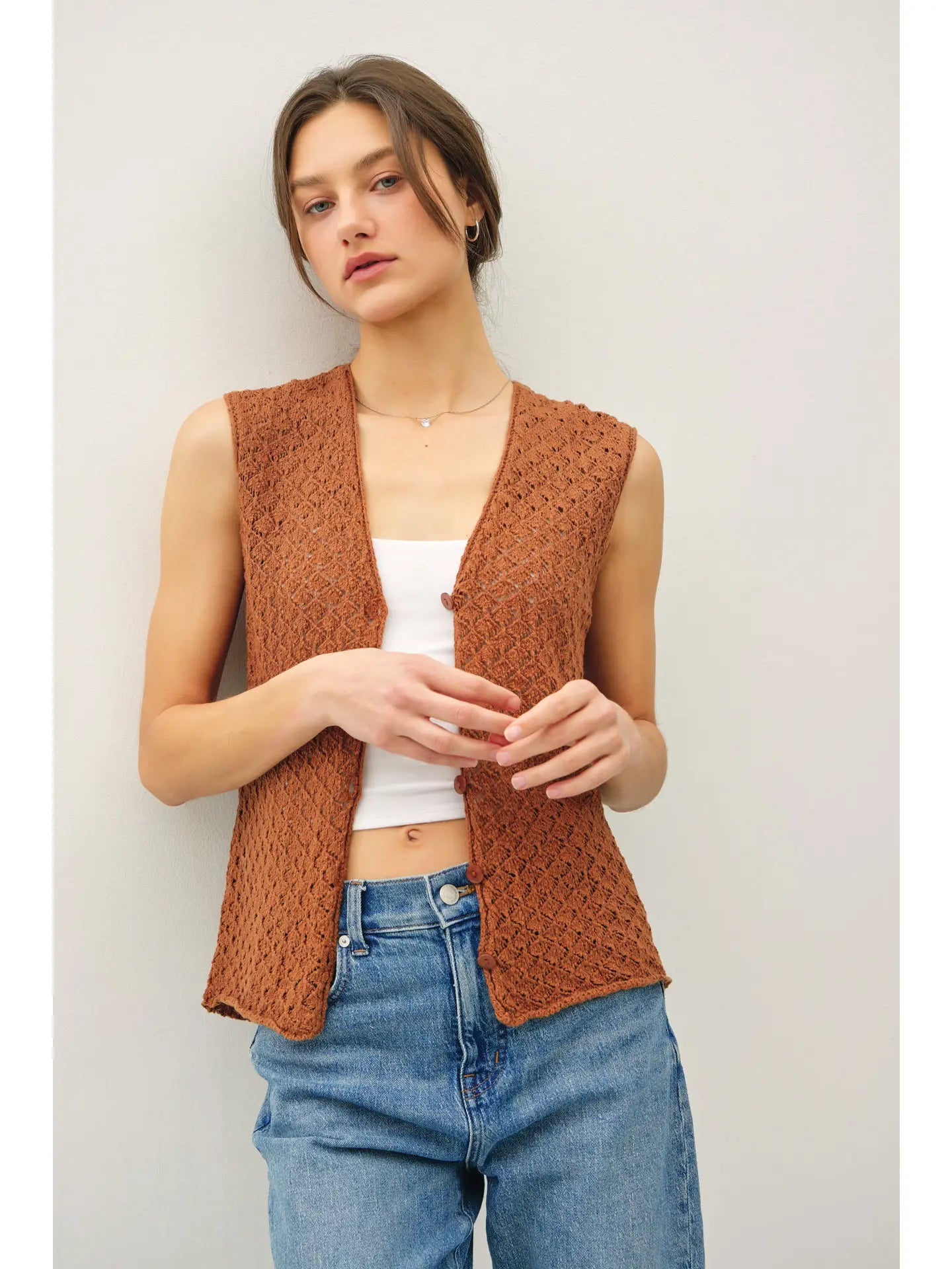 The Elodie Knit Vest is the perfect lightweight layer for every season. Designed with a soft knit texture, this versatile piece features a V-neckline, sleeveless cut, and a button-up front that can be styled open or closed. The cropped, sweater-vest silhouette makes it easy to pair with high-waisted denim, flowy skirts, or layered over your favorite blouses. Effortless, chic, and endlessly wearable—this is a must-have staple for any wardrobe.