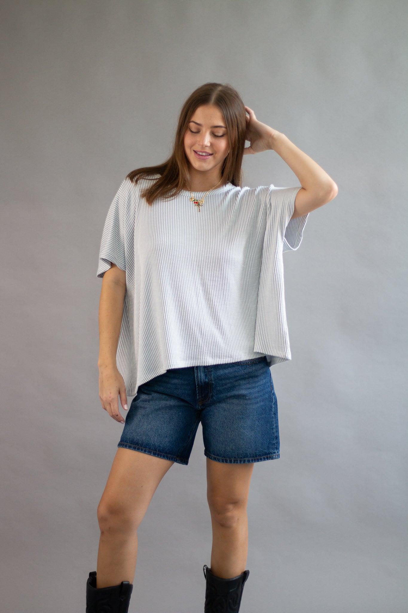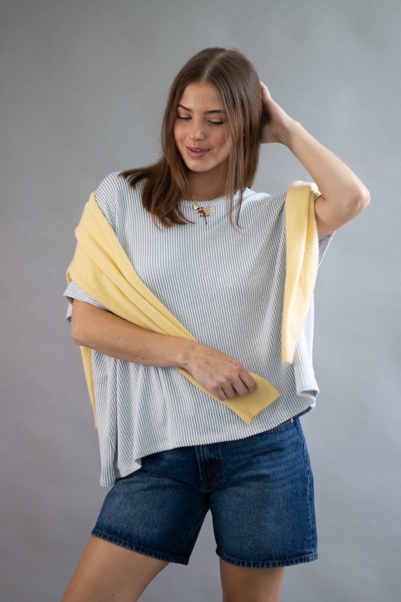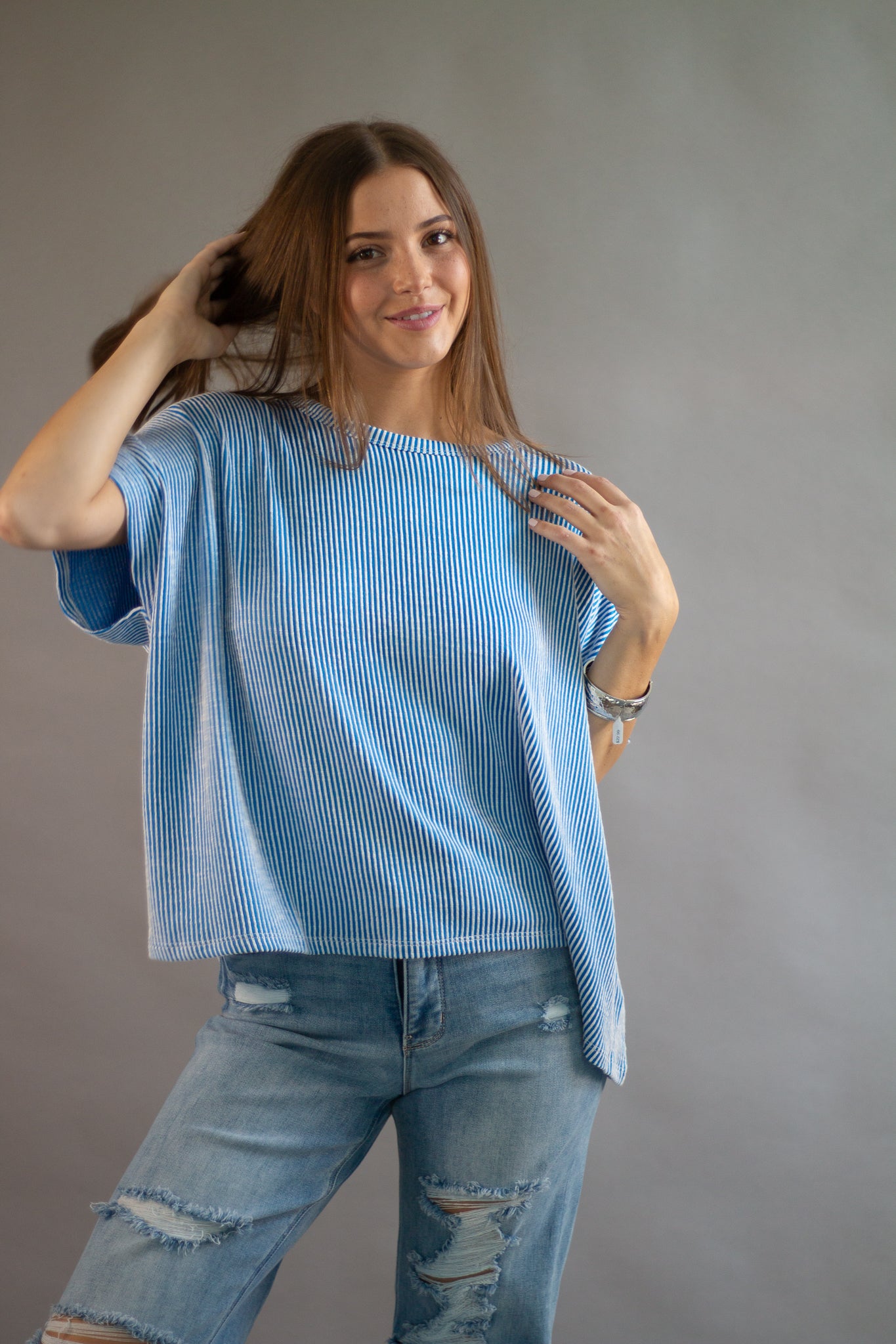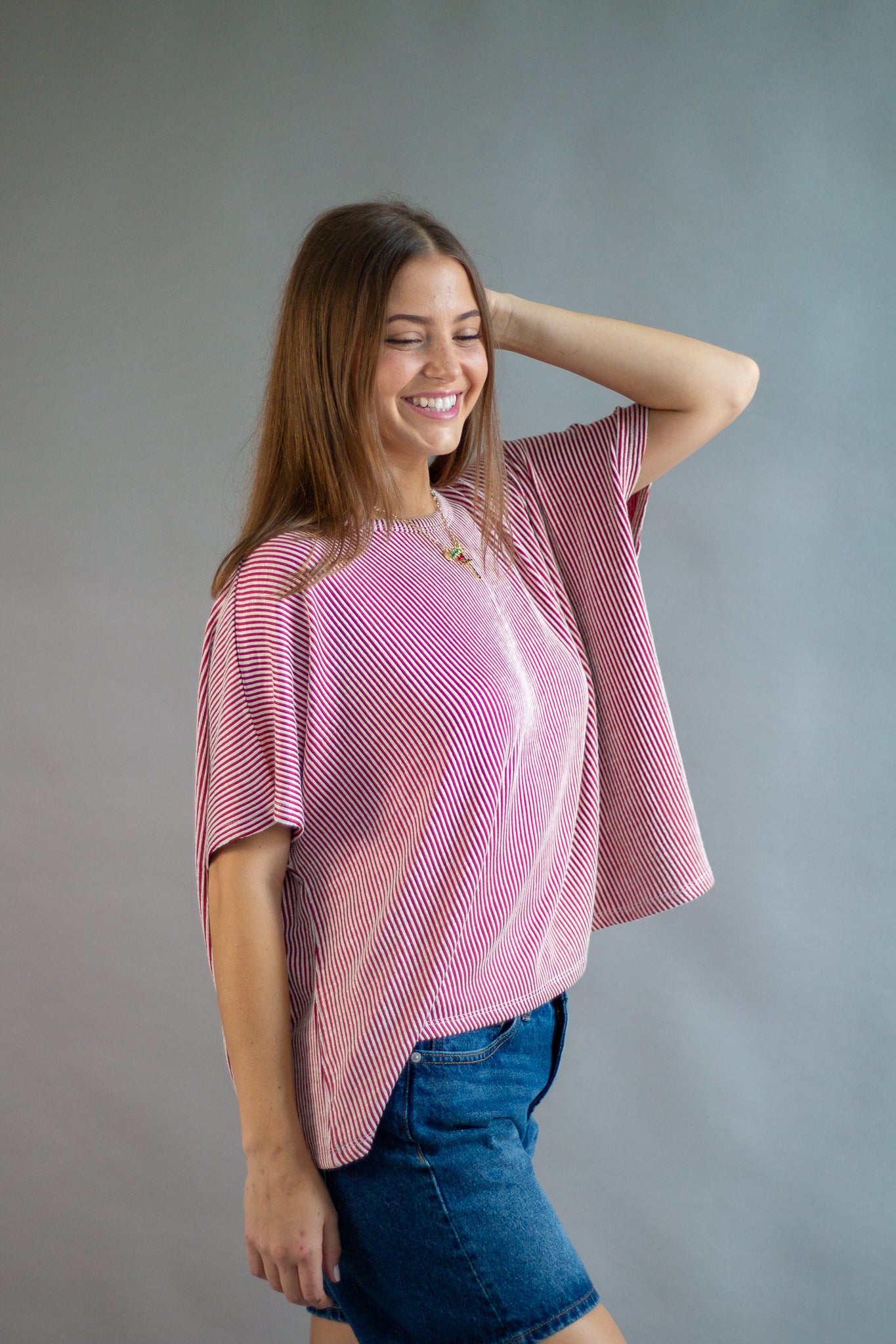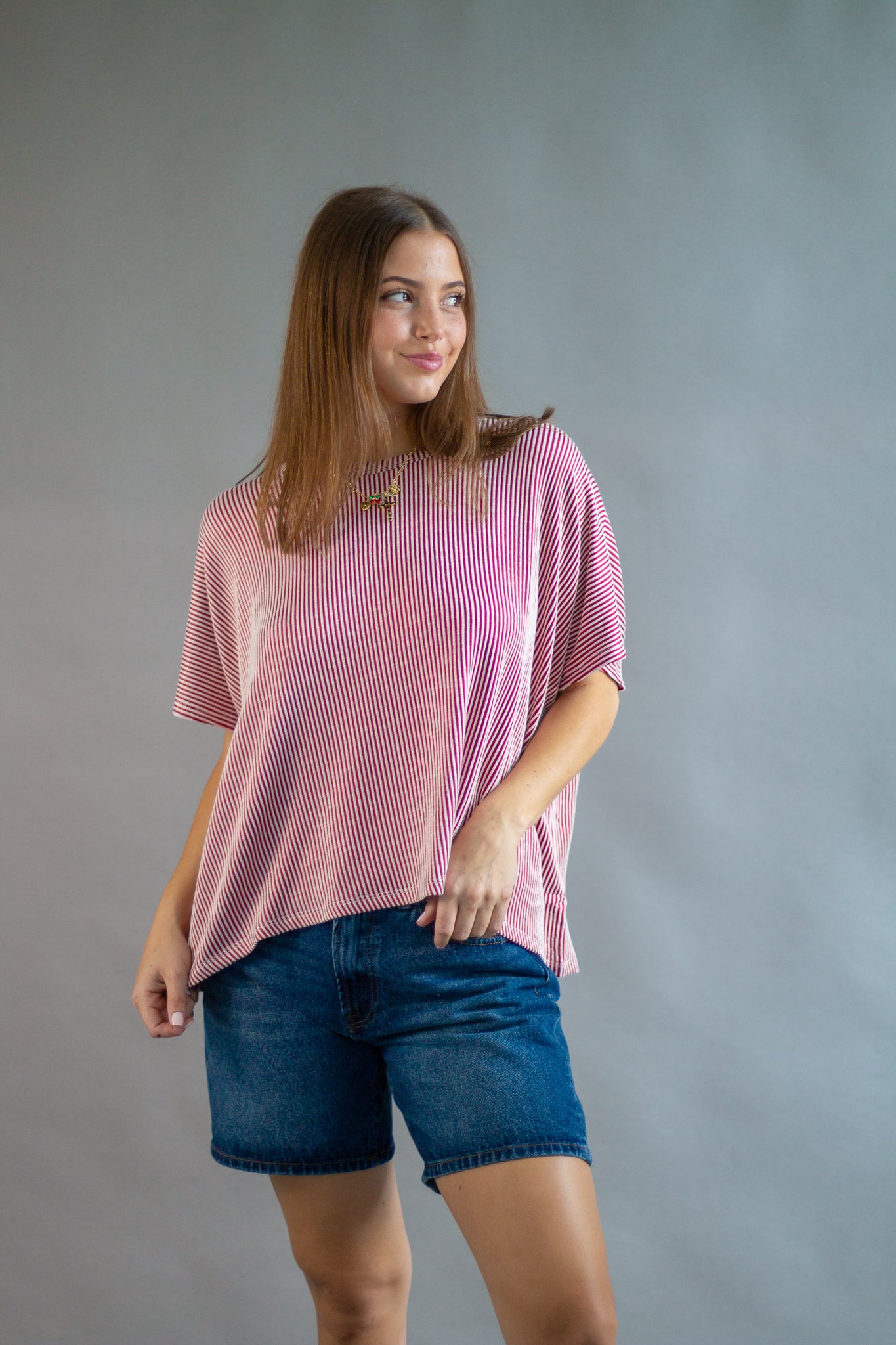 Our Finley Top is a ribbed textured, oversized fit with a short sleeve. Lots of strech and striped contrast detail.