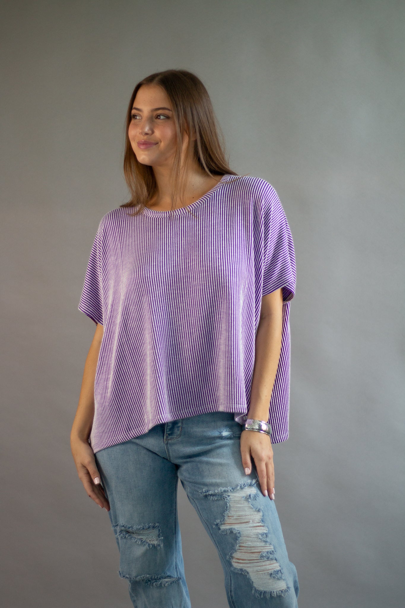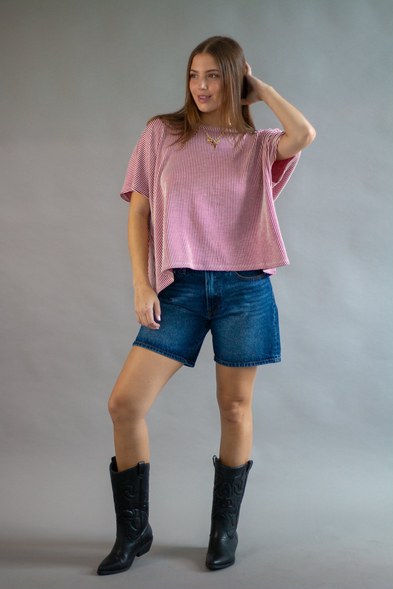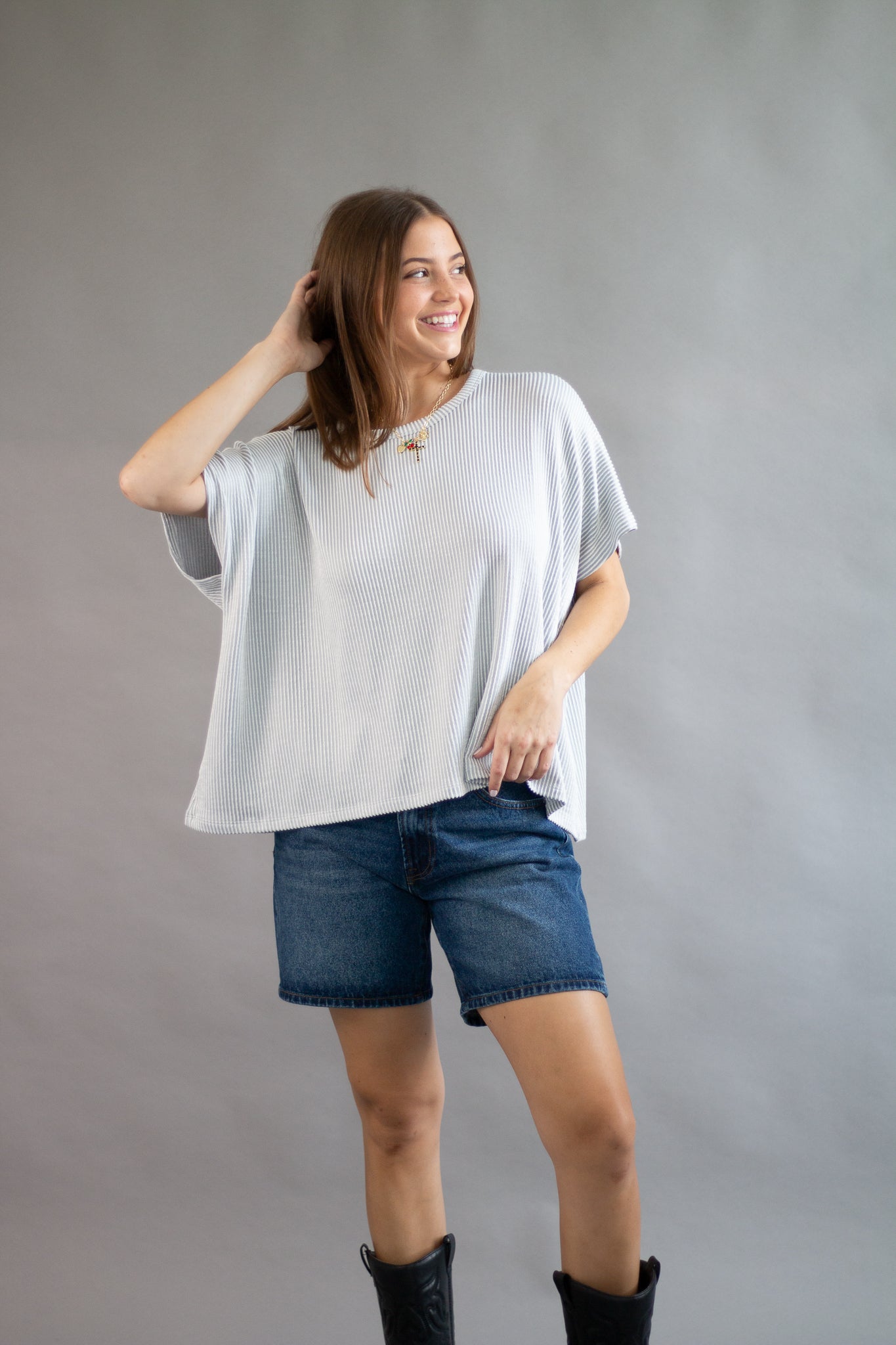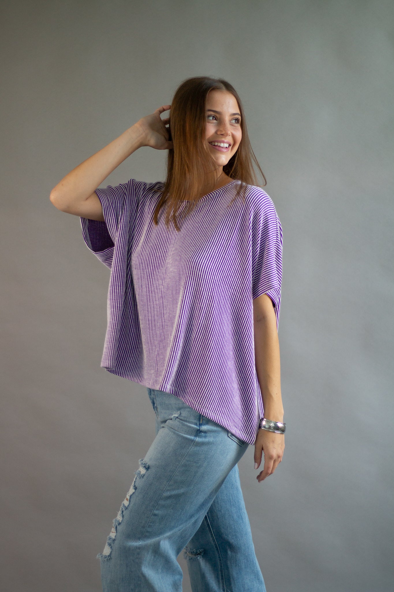 Our Finley Top is a ribbed textured, oversized fit with a short sleeve. Lots of strech and striped contrast detail.