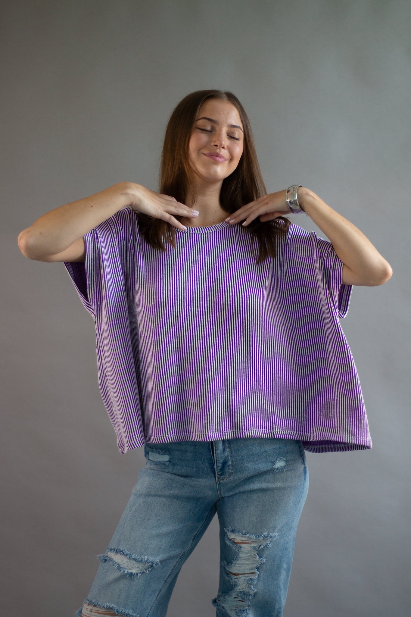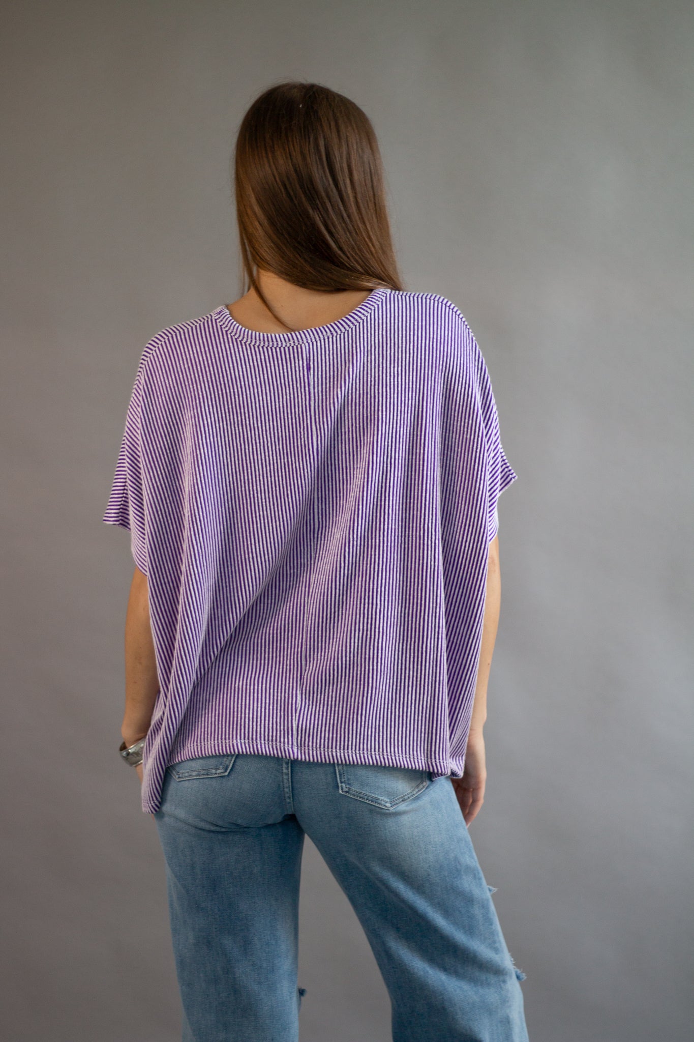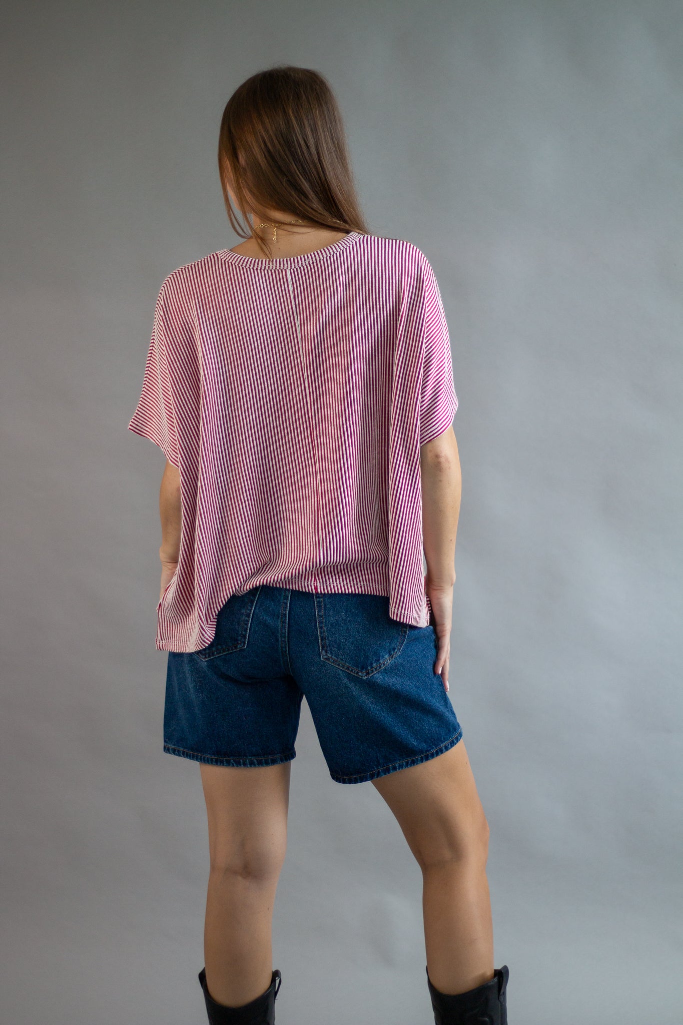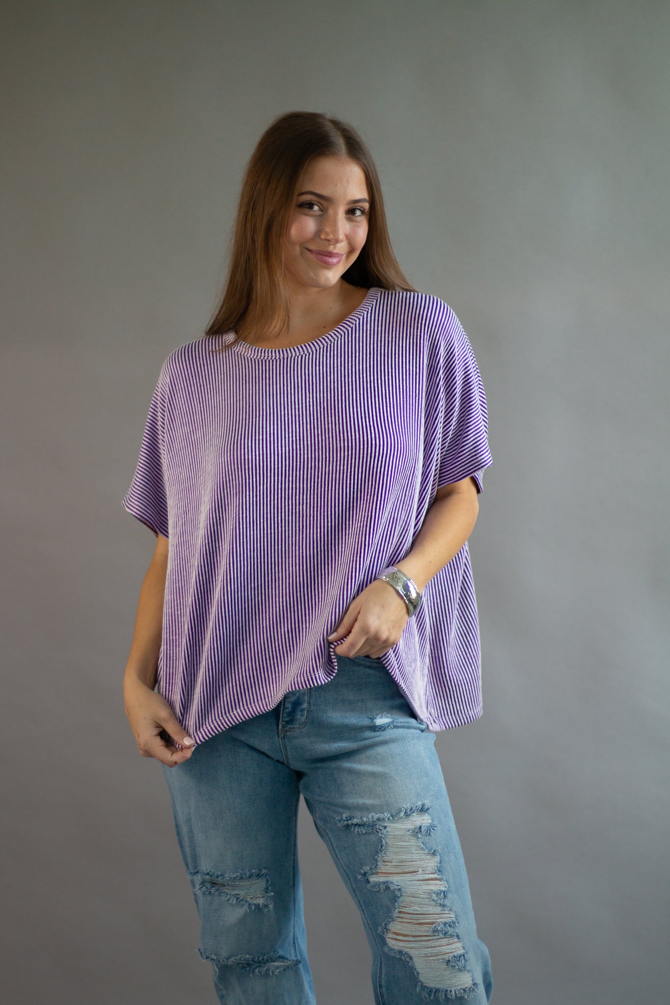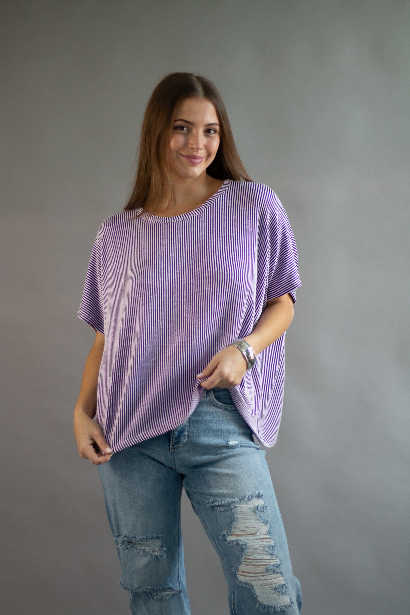 Our Finley Top is a ribbed textured, oversized fit with a short sleeve. Lots of strech and striped contrast detail.