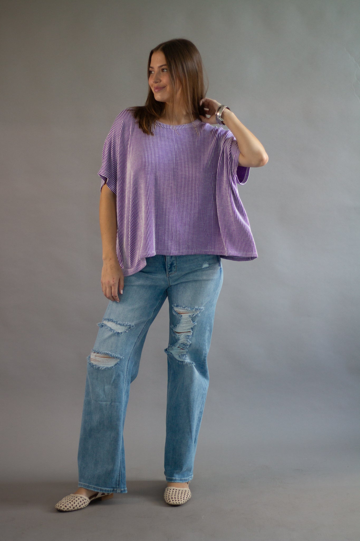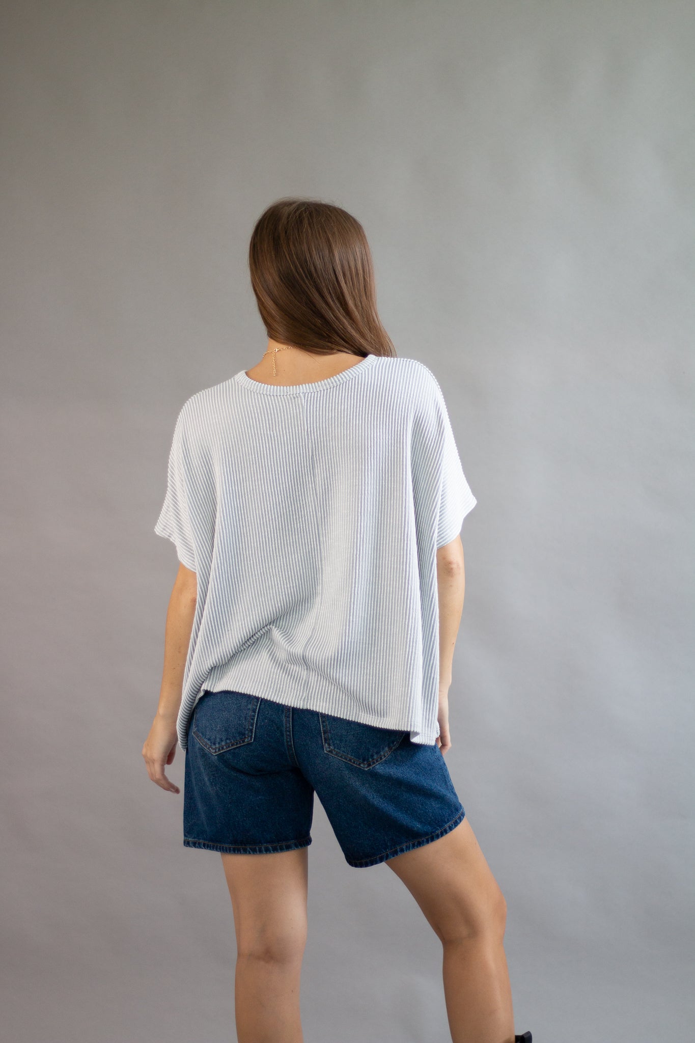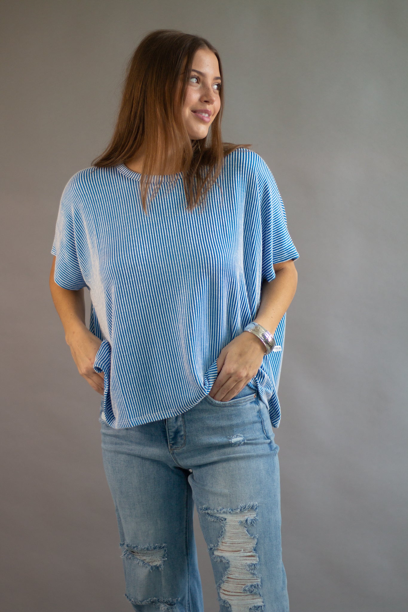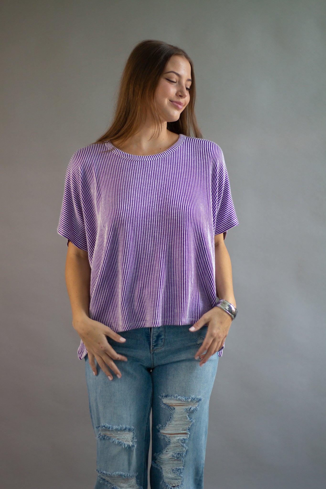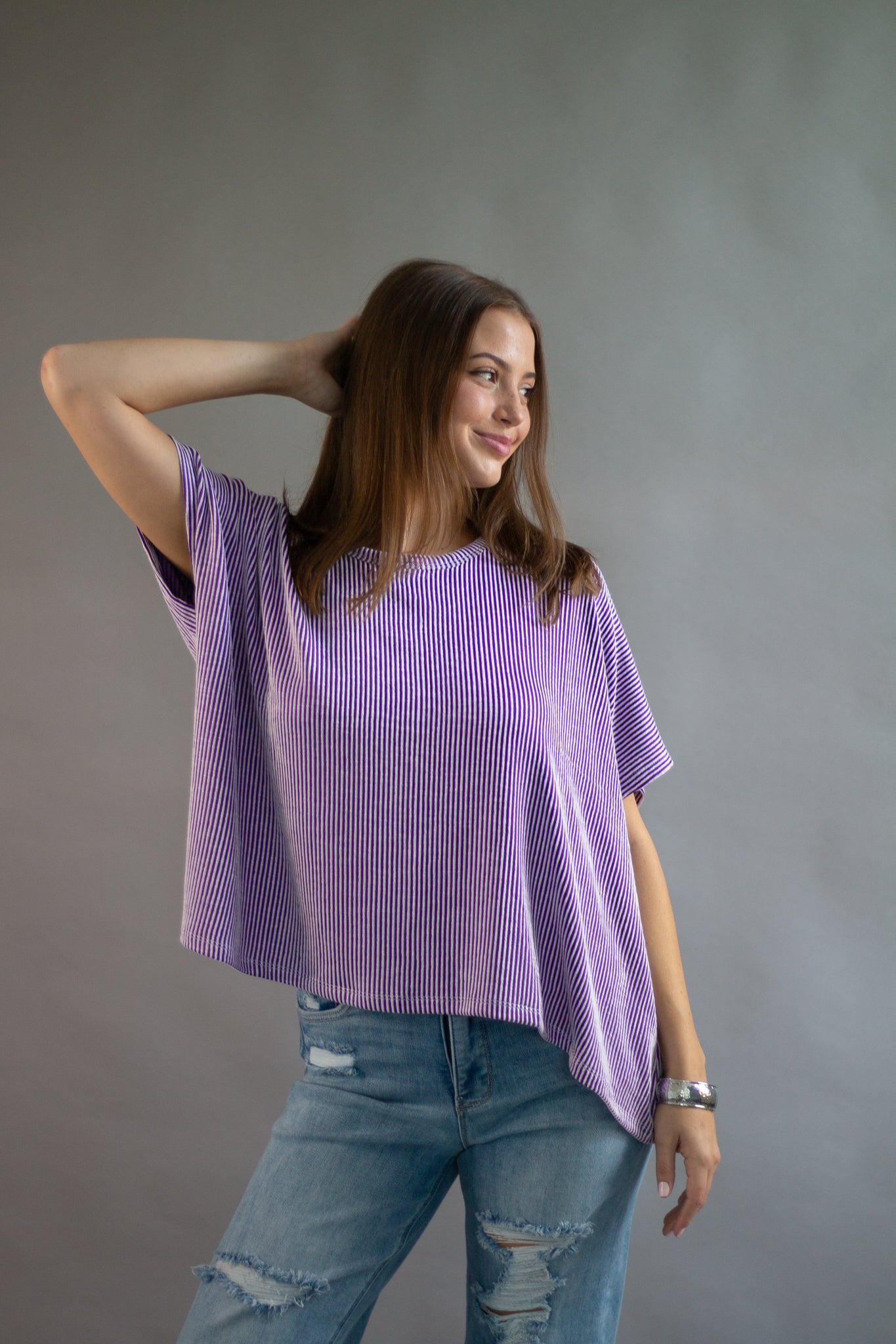 Our Finley Top is a ribbed textured, oversized fit with a short sleeve. Lots of strech and striped contrast detail.