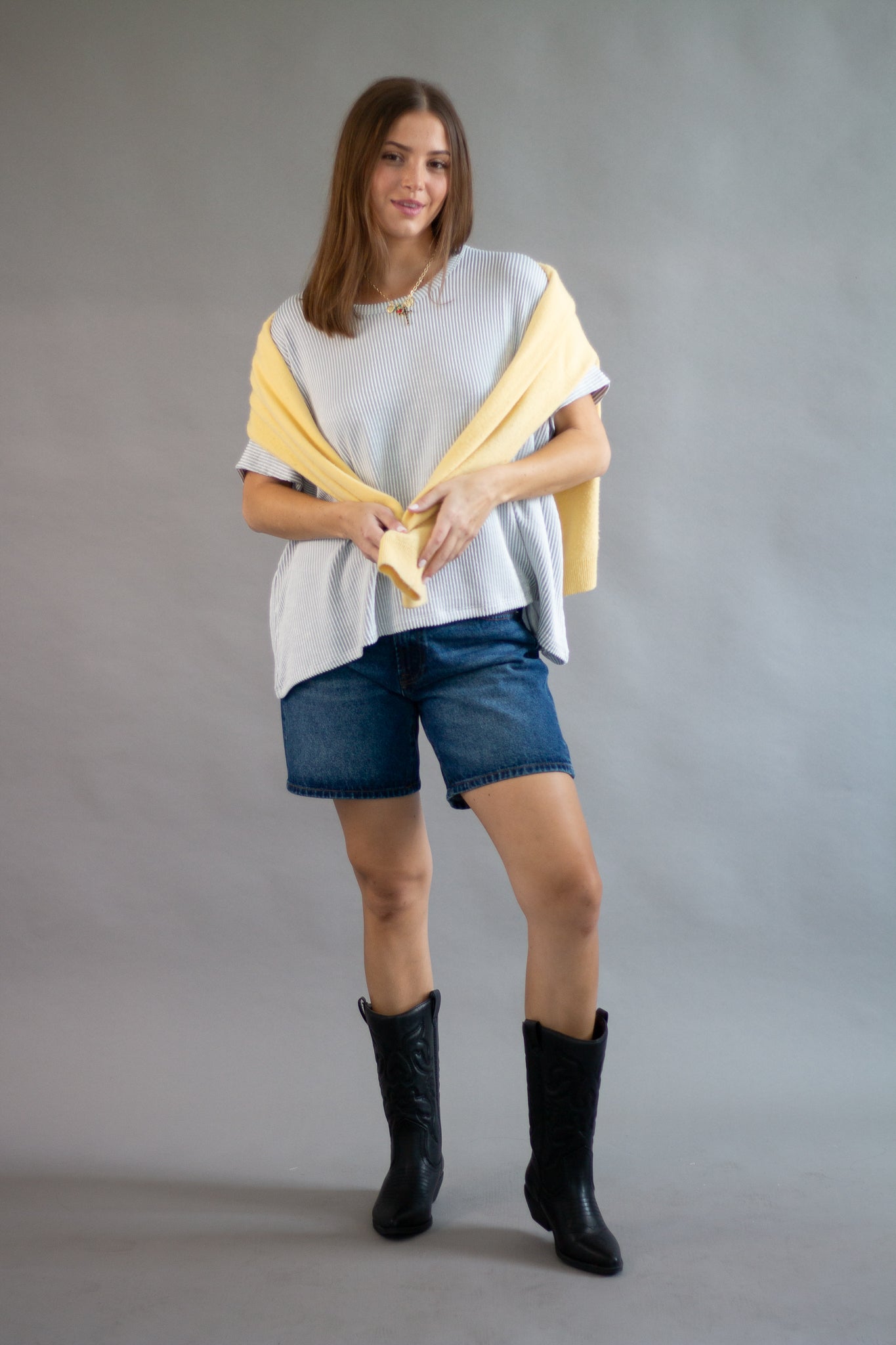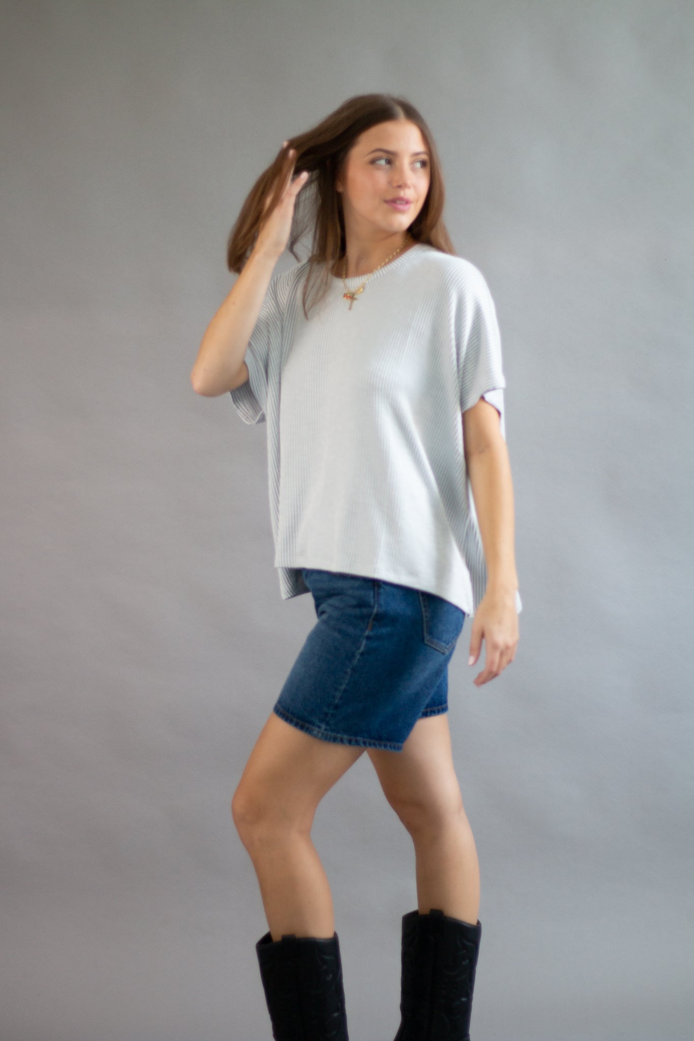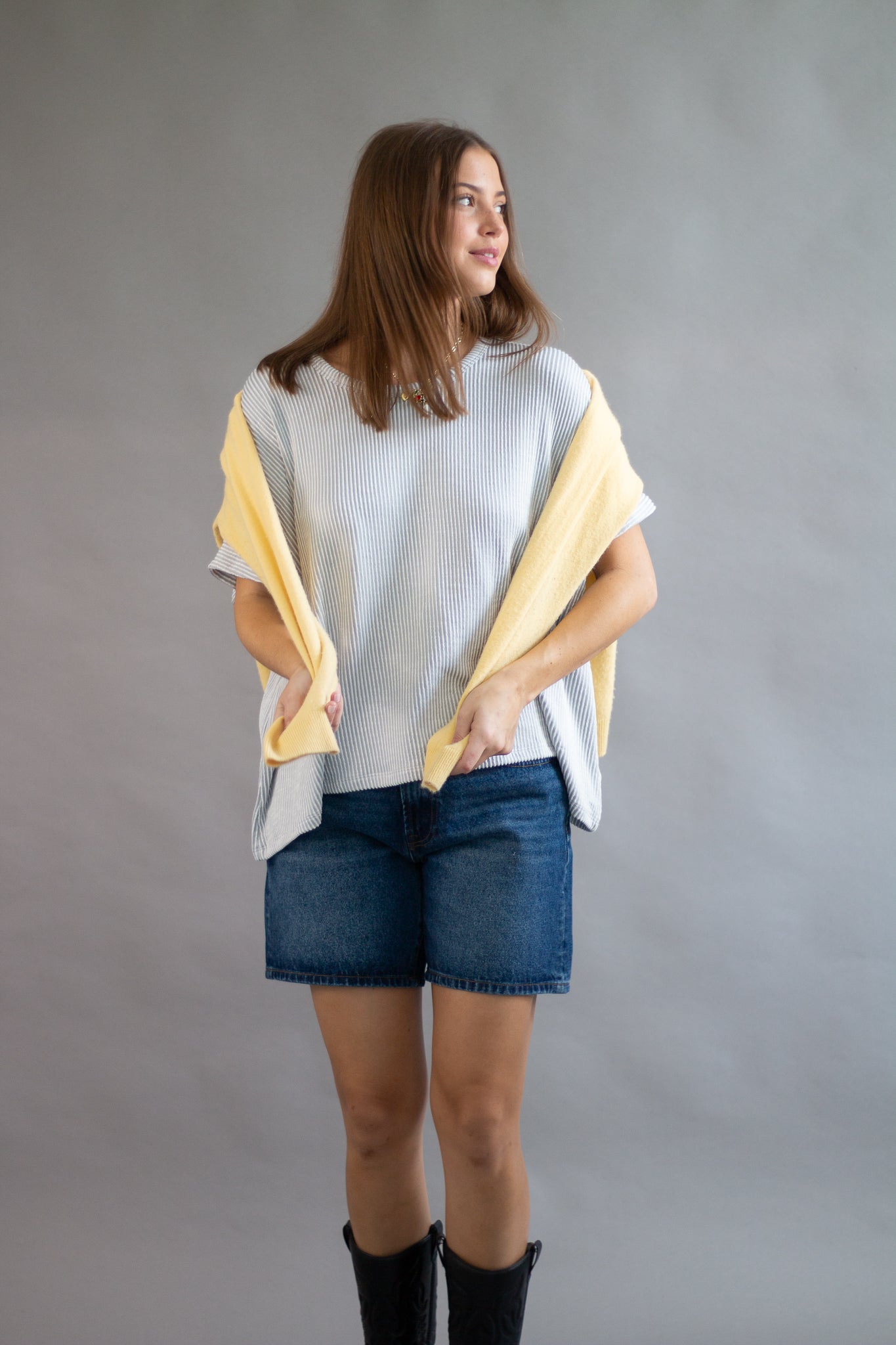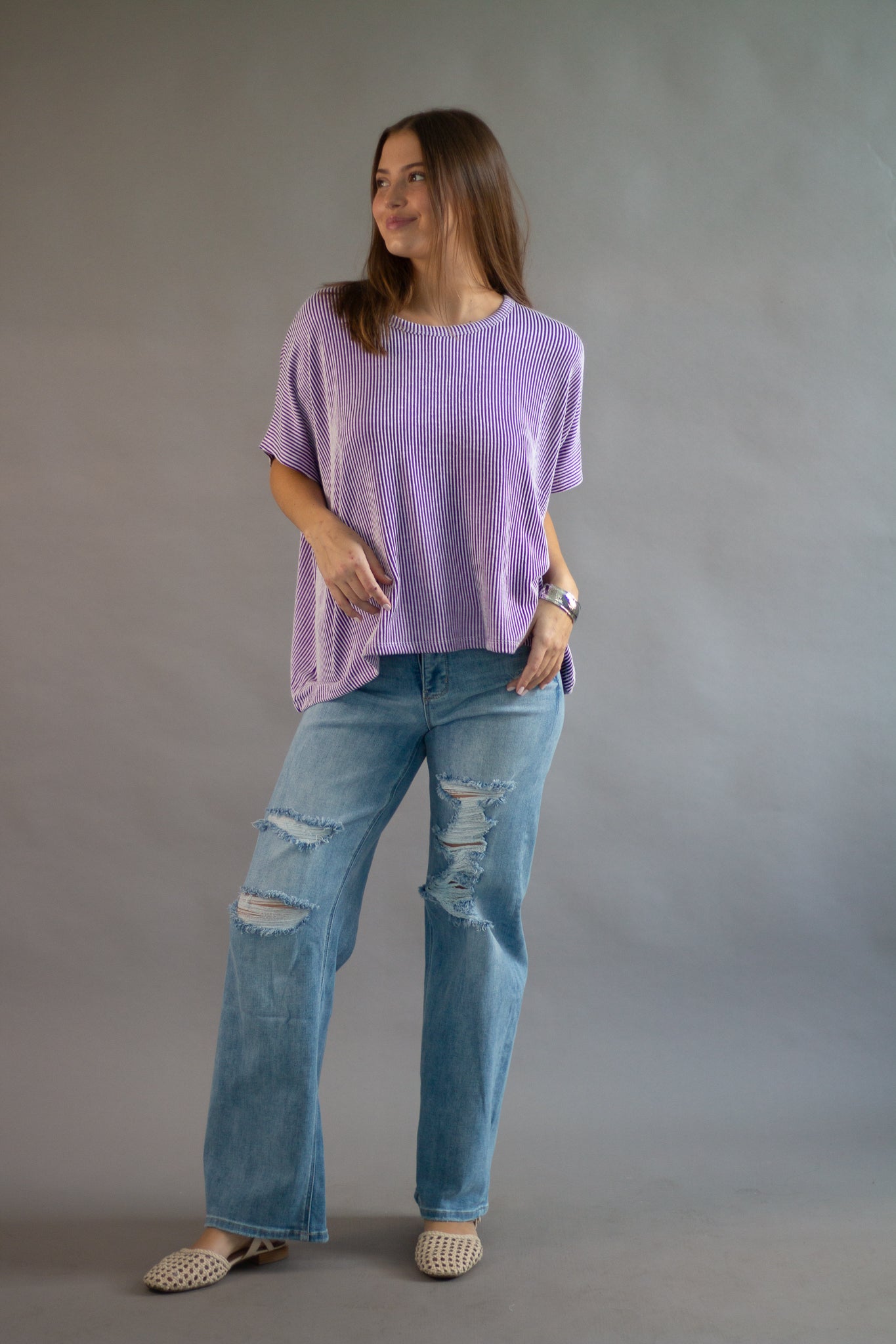Our Finley Top is a ribbed textured, oversized fit with a short sleeve. Lots of strech and striped contrast detail.