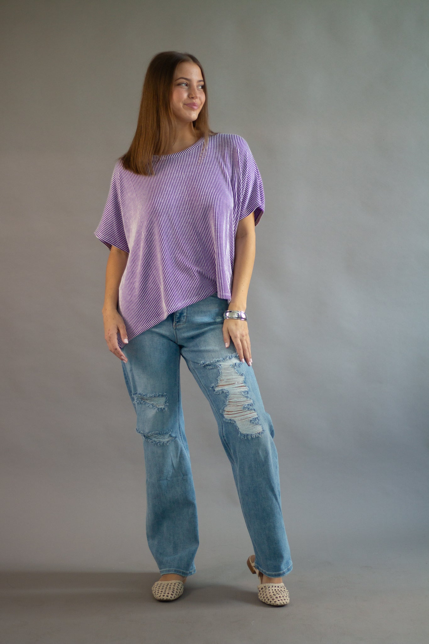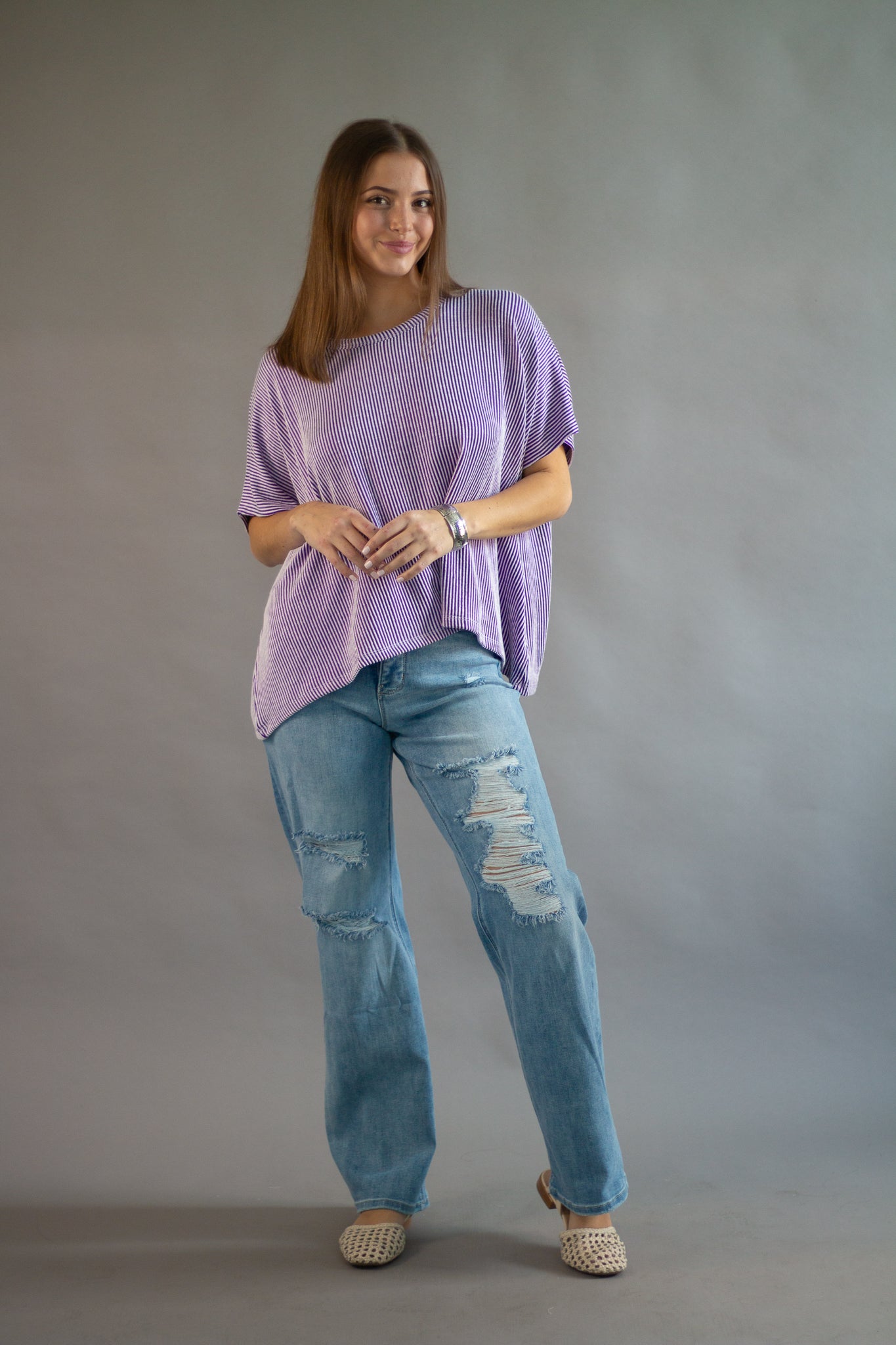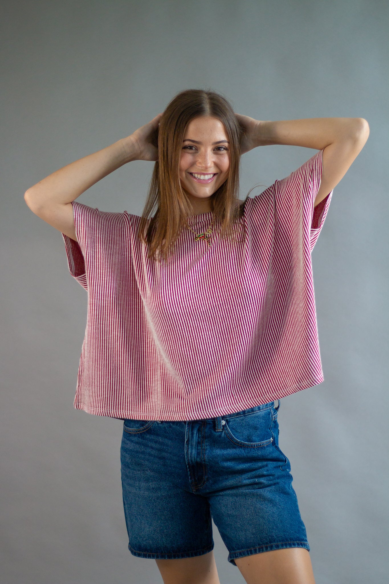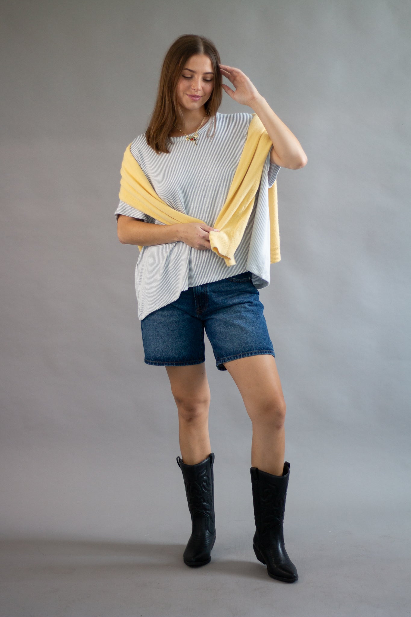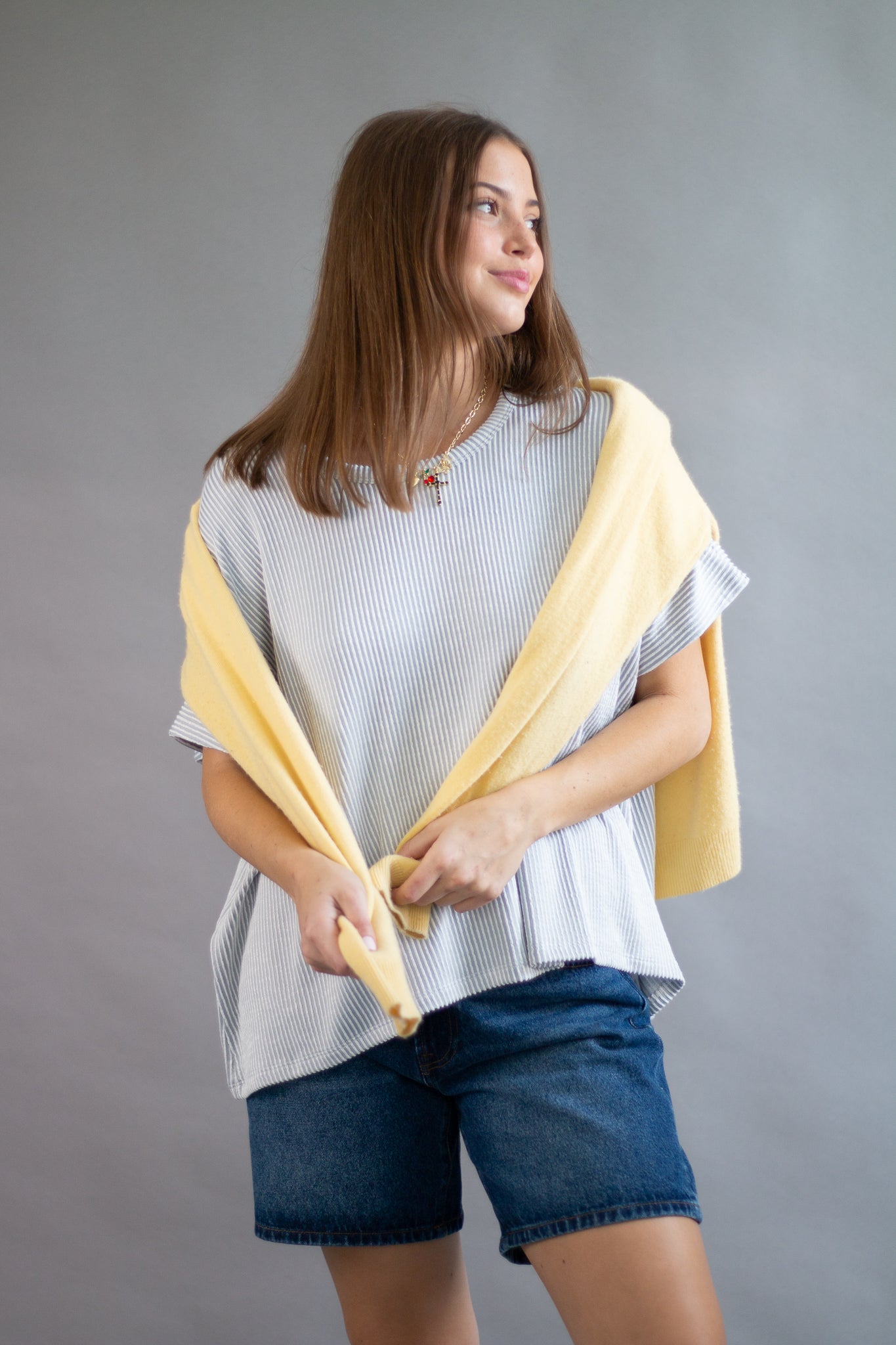 Our Finley Top is a ribbed textured, oversized fit with a short sleeve. Lots of strech and striped contrast detail.