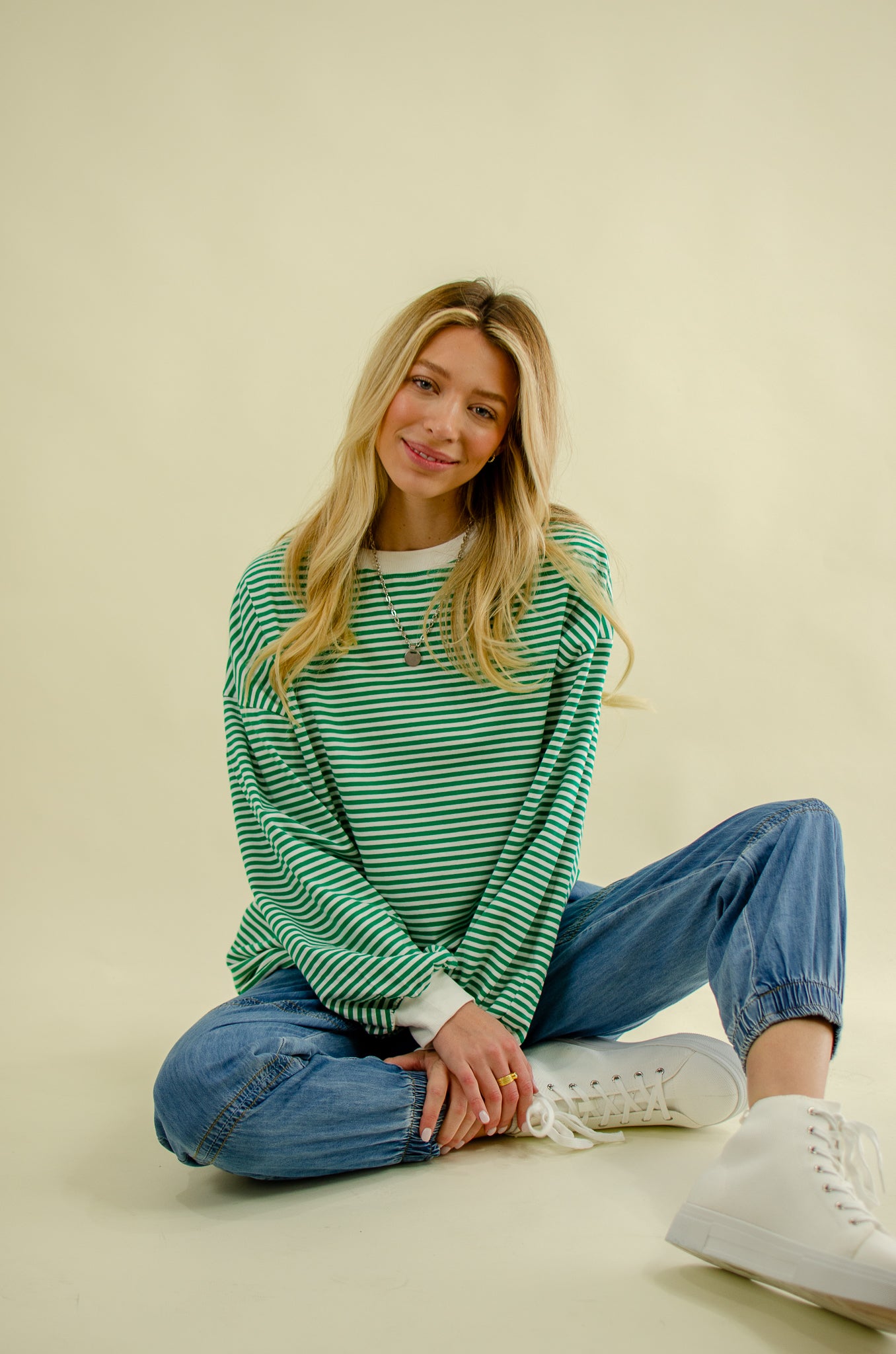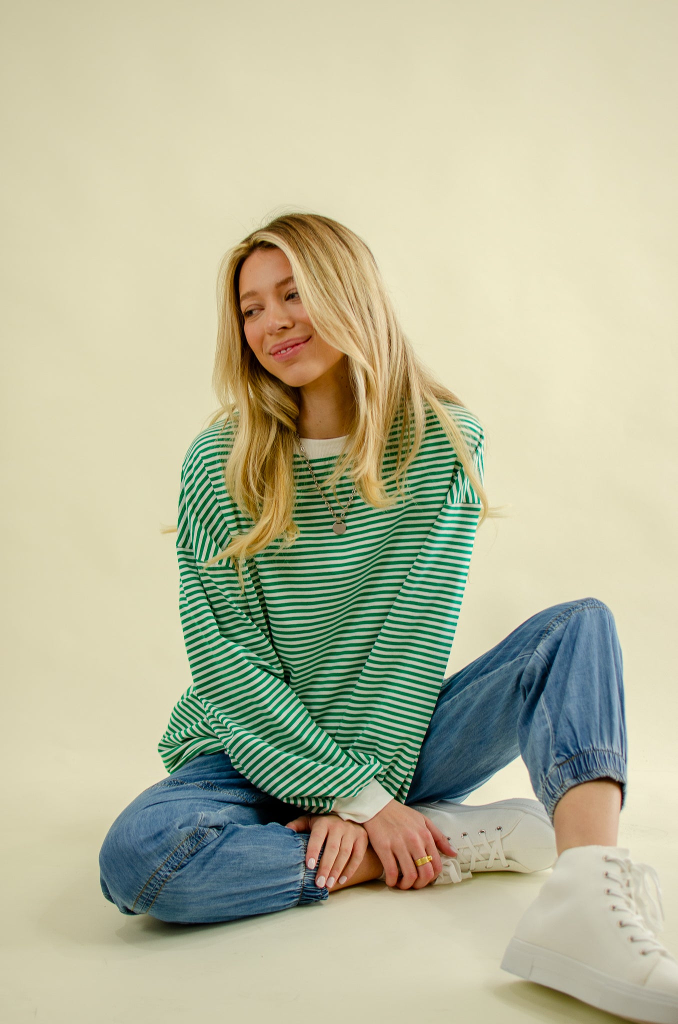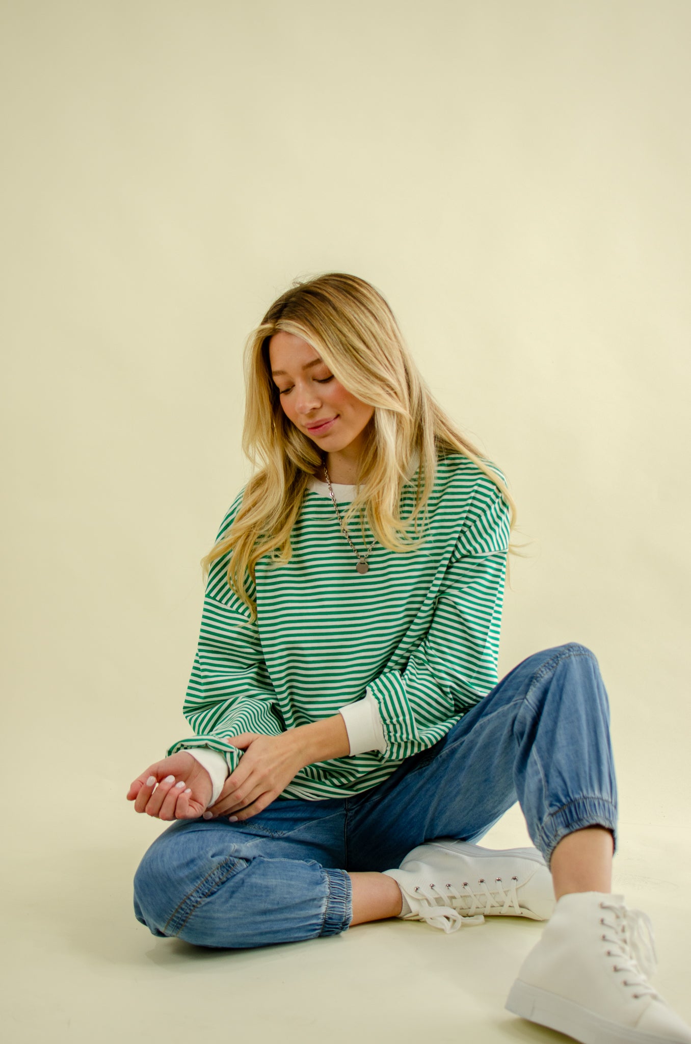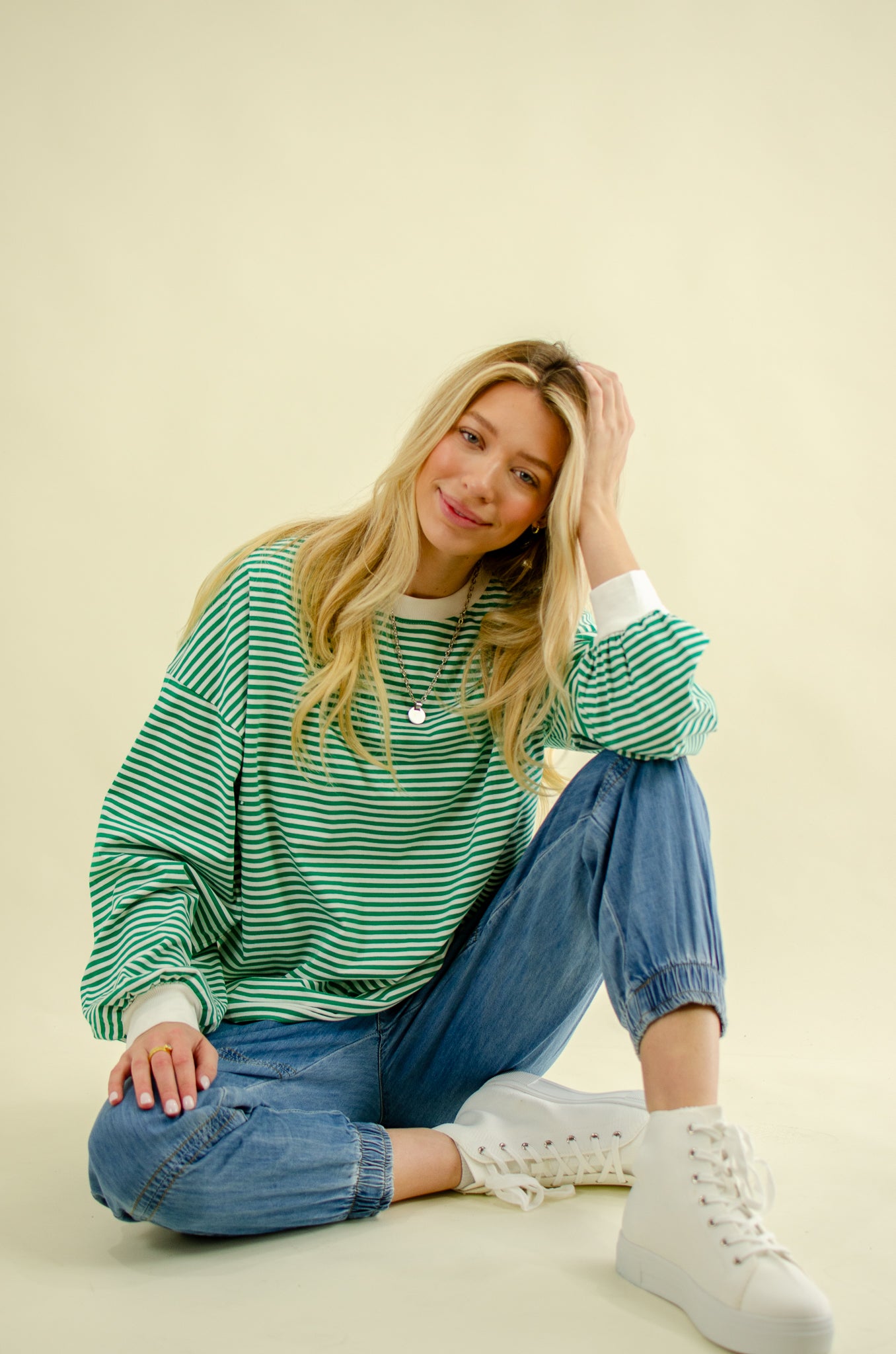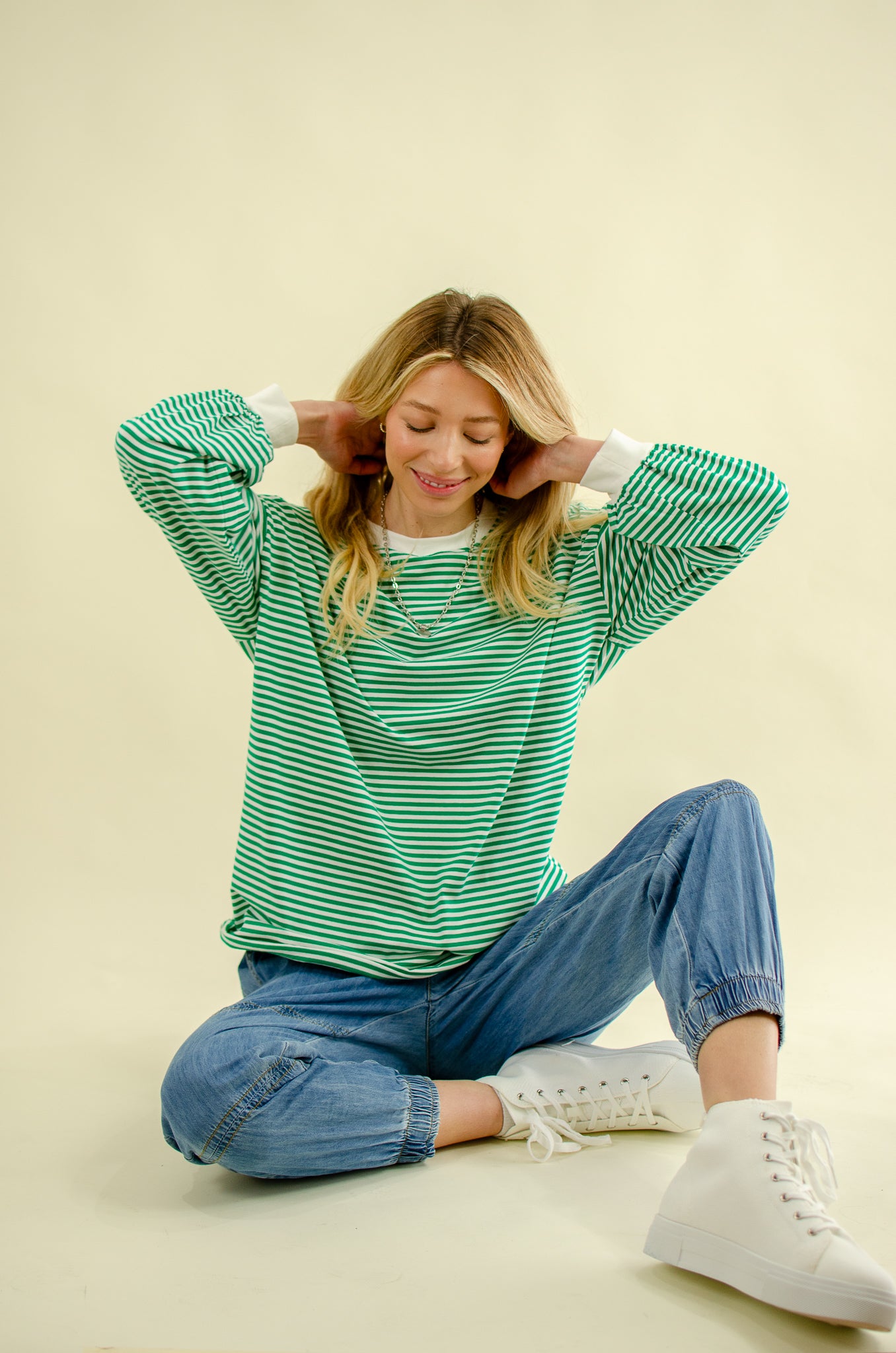 Comfy, casual and oh so cool, our Hailey Top features a classic crew neckline with contrast cuffs and a raw rolled hem. We love the baggy oversized look and trendy, preppy stripes. Wear with leggings, denim, linen and more.