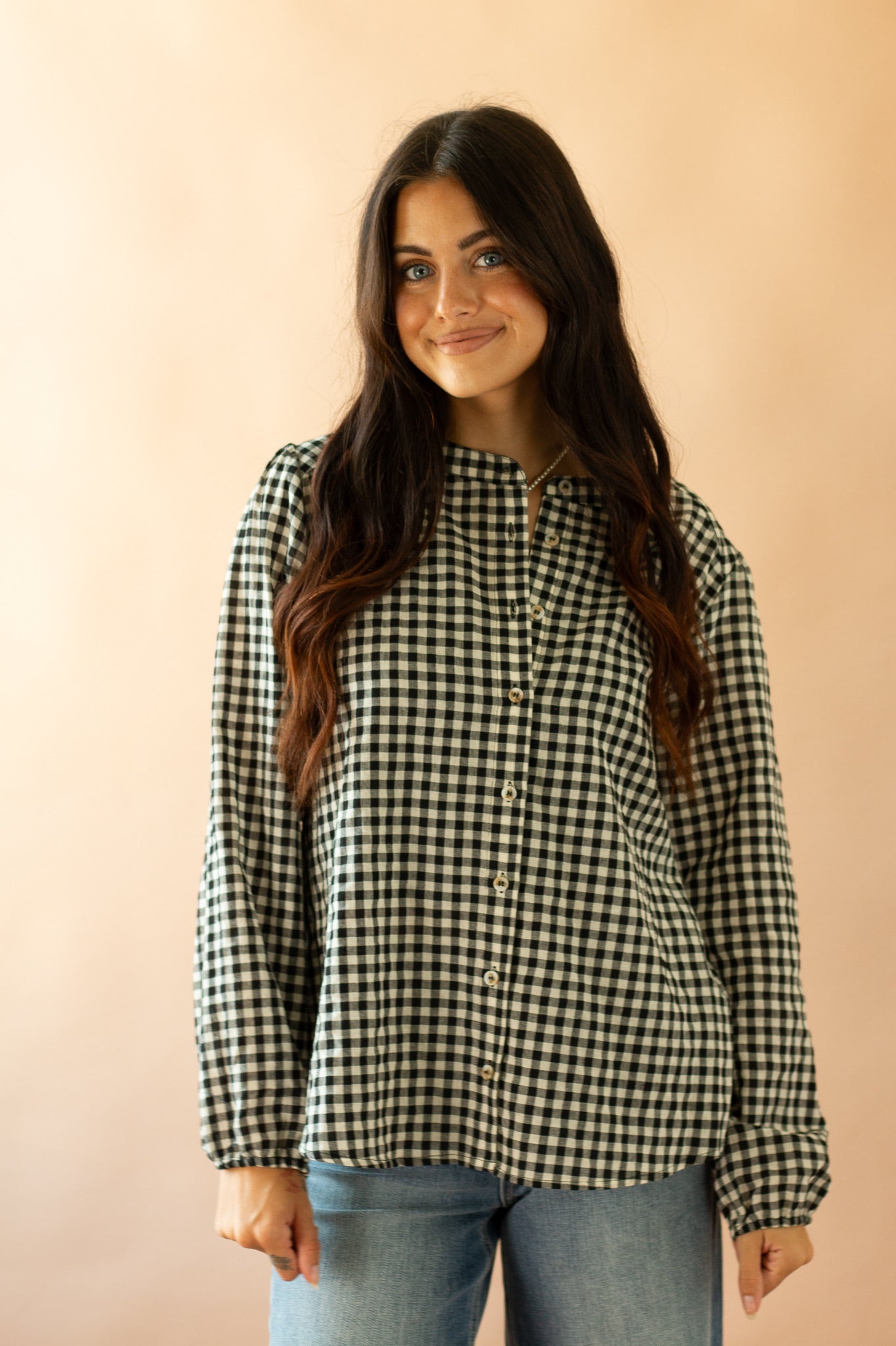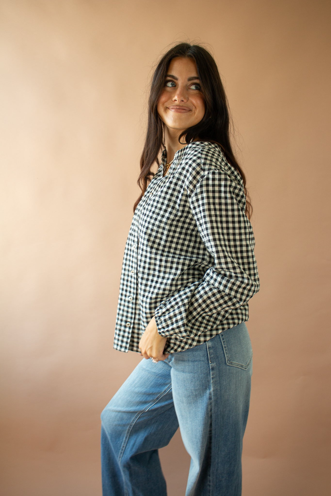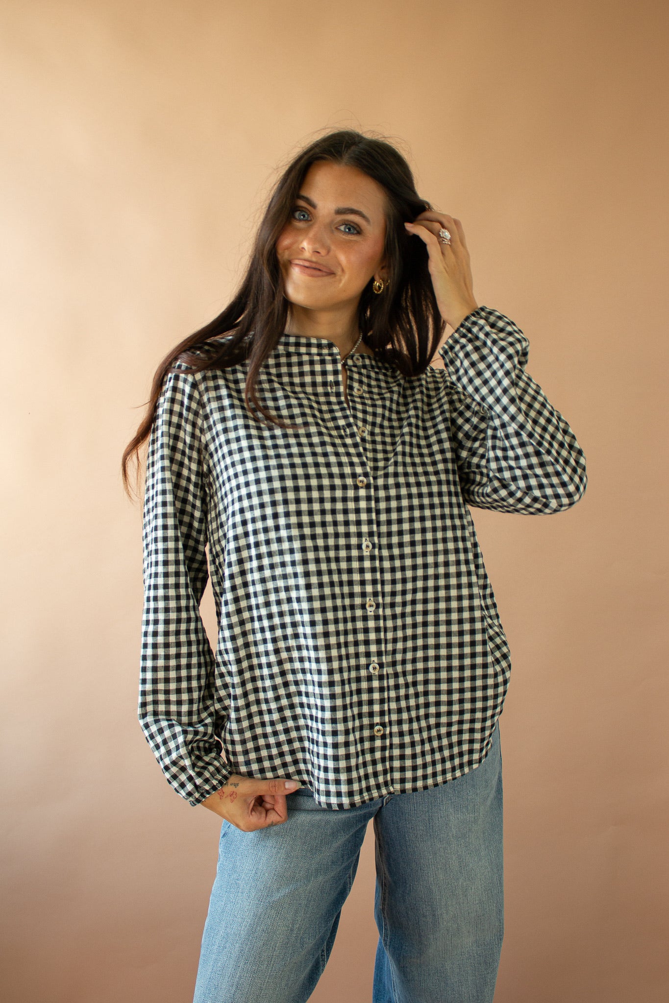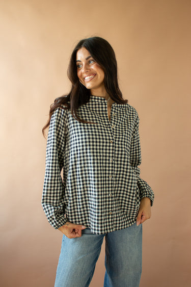 Our Layla Top features a light linen texture, full length hem, classic gingham print, high neck button front closure, elastic cuffed sleeves and endless stying options. Wear alone as an office staple or layer over tanks as a lightweight shacket.