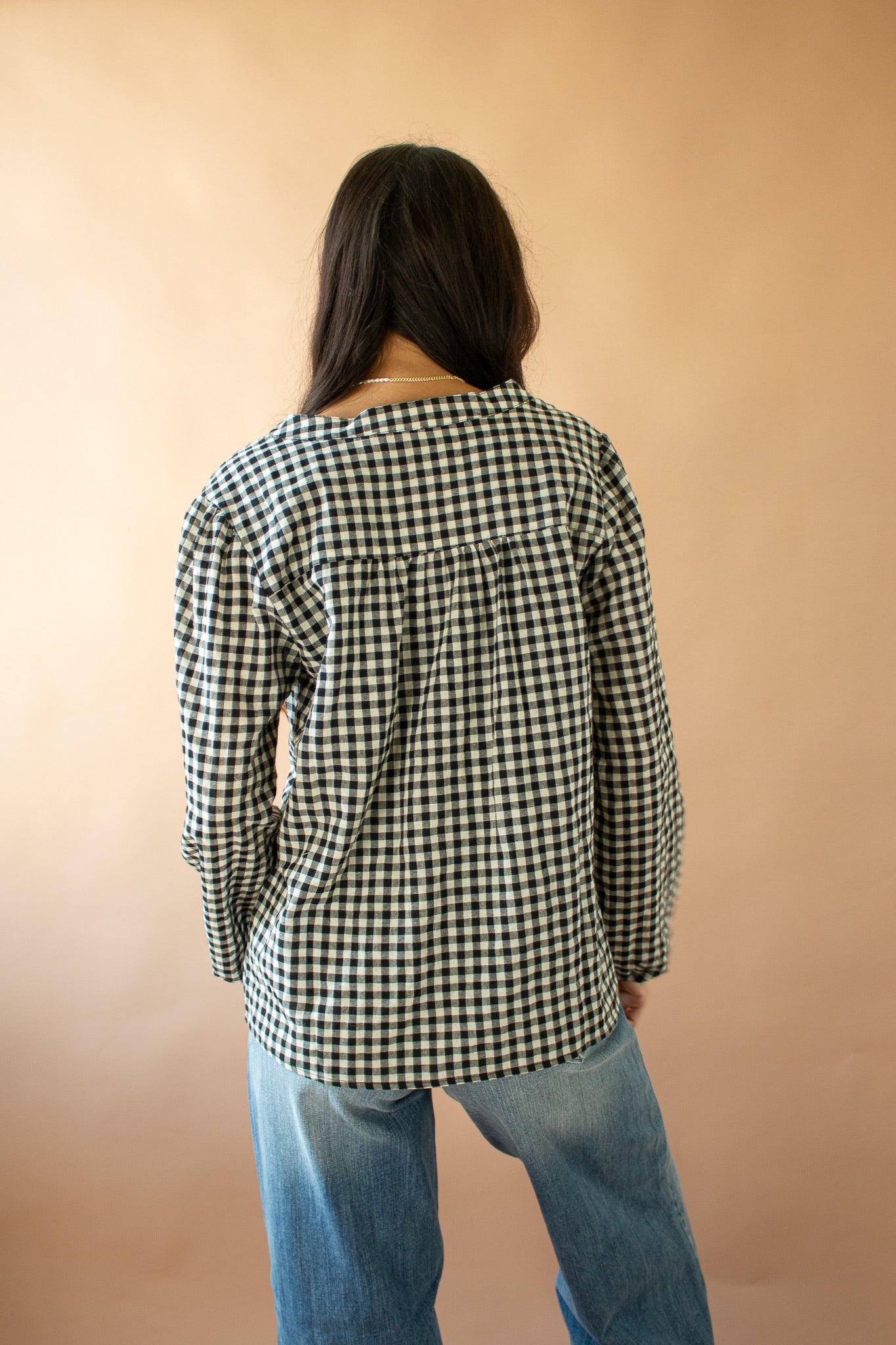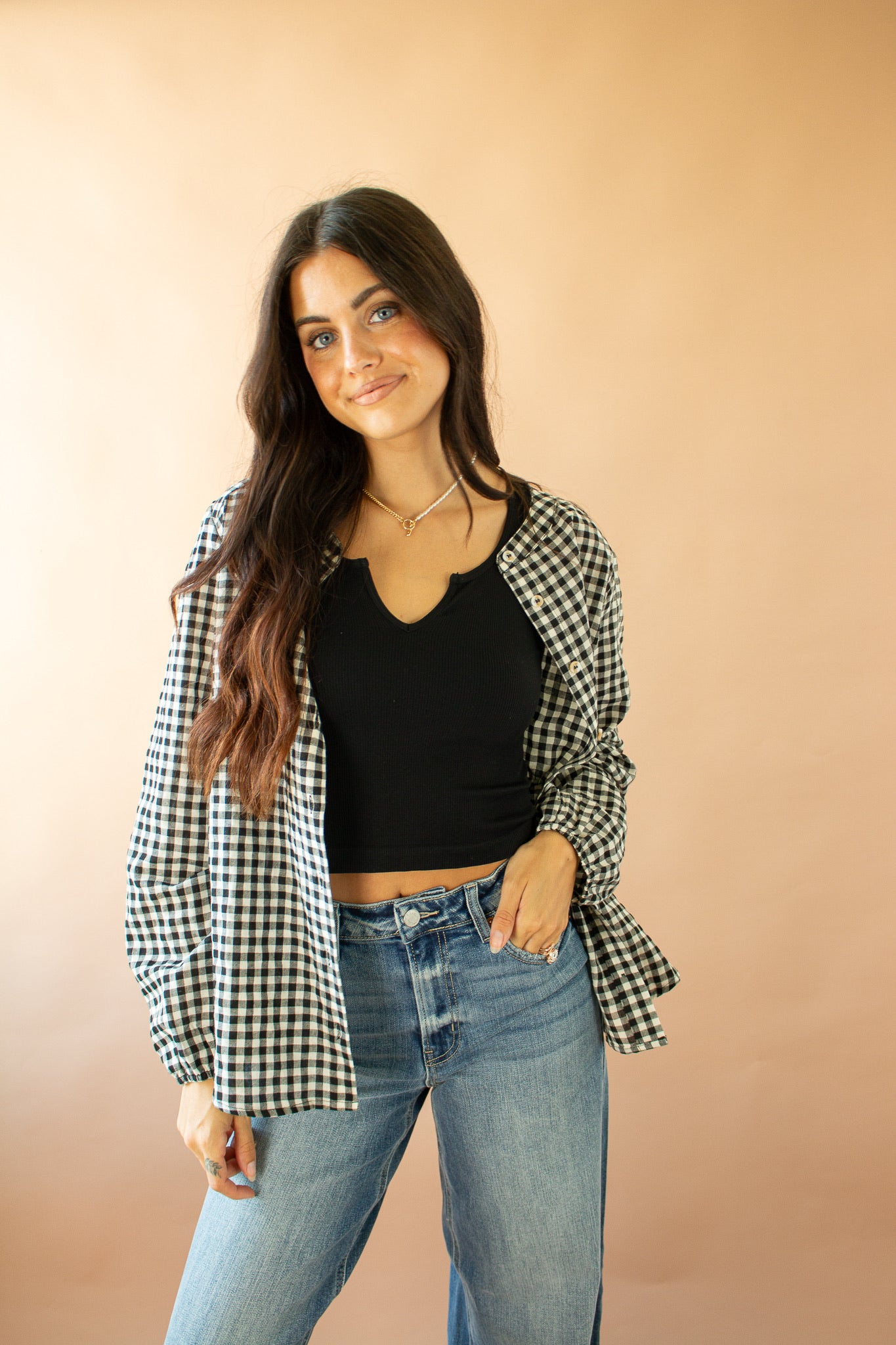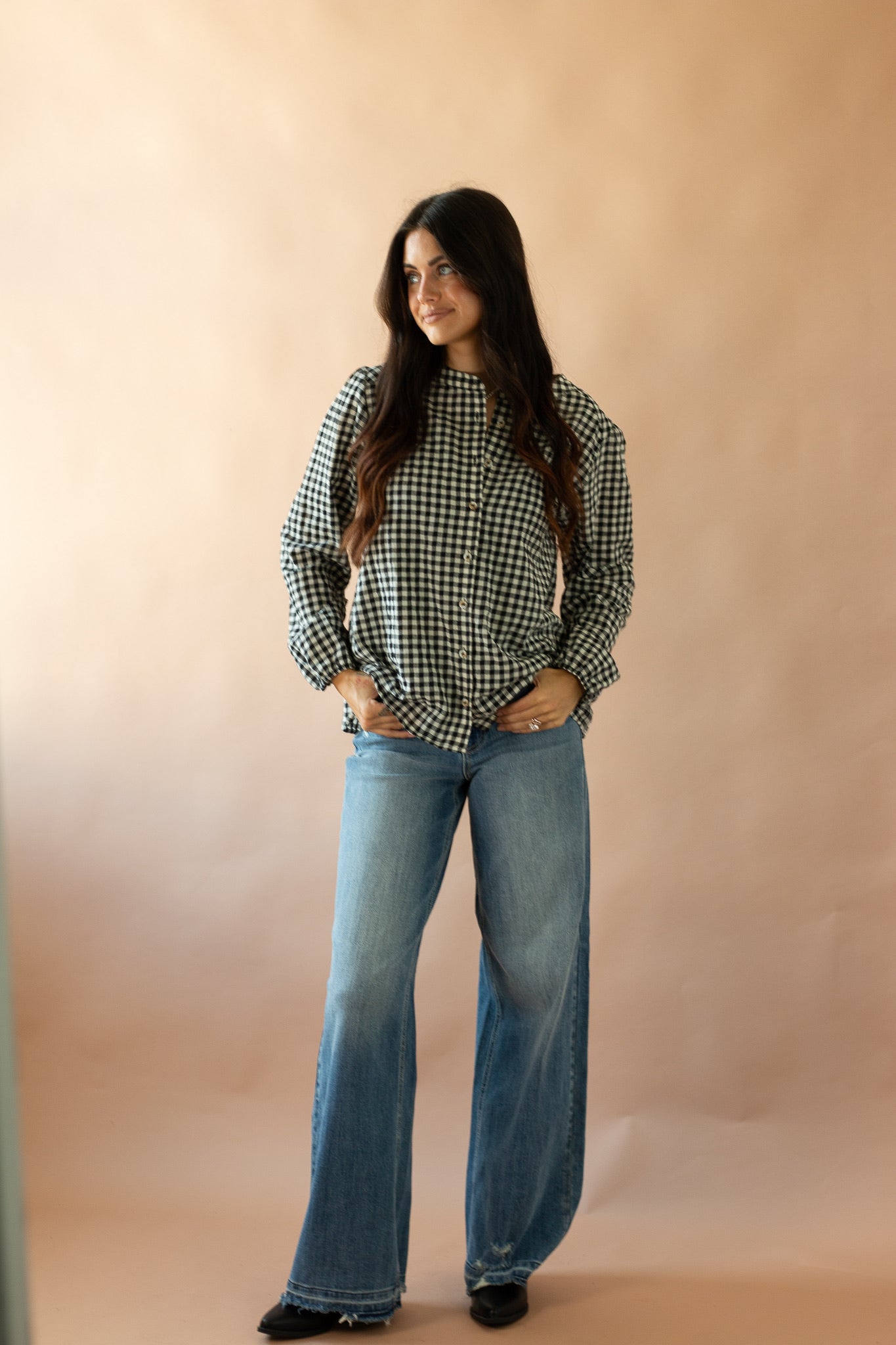 Our Layla Top features a light linen texture, full length hem, classic gingham print, high neck button front closure, elastic cuffed sleeves and endless stying options. Wear alone as an office staple or layer over tanks as a lightweight shacket.