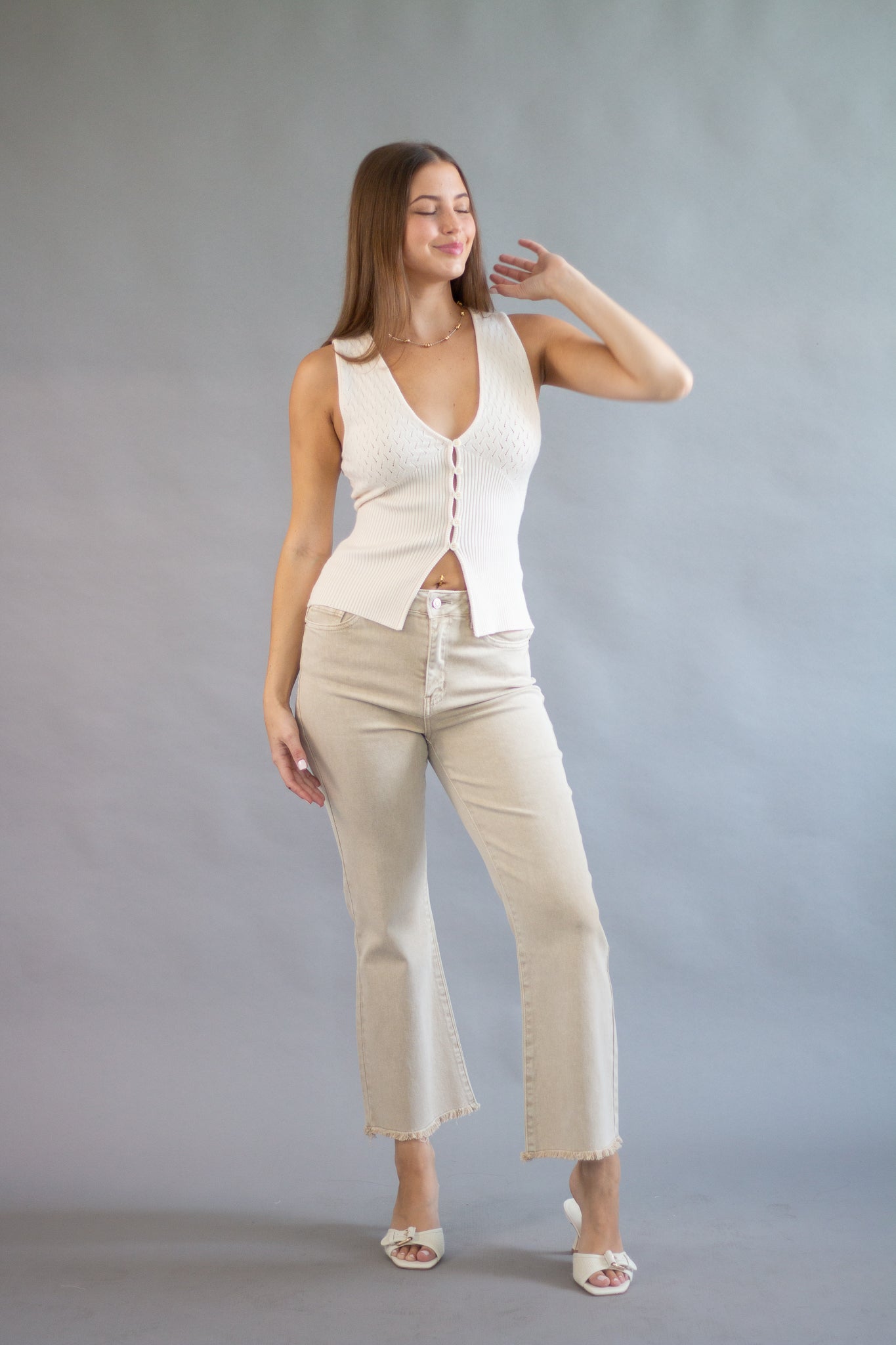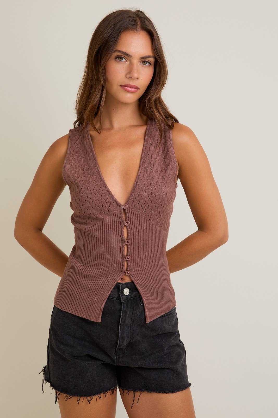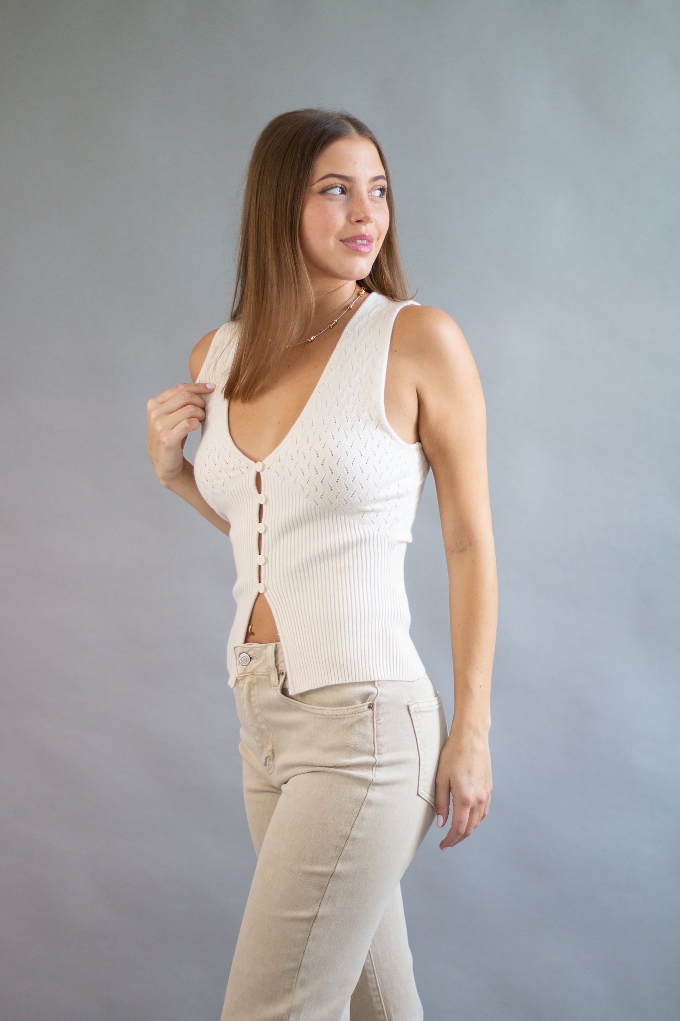 This v-neck button front vest top is a stunning staff favorite. It features a bottom slit detail for a high waist bottom to poke through or a stylish look. The pointelle detail is a chic and feminine detail.