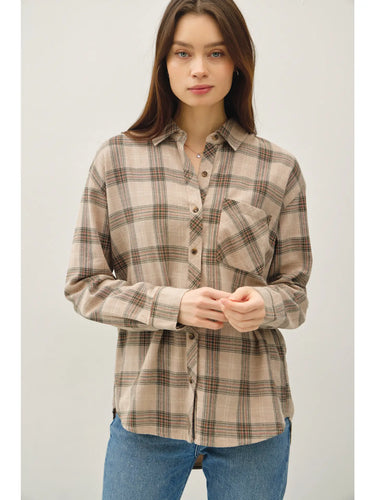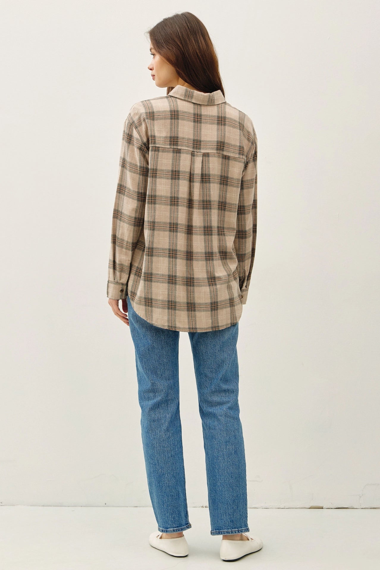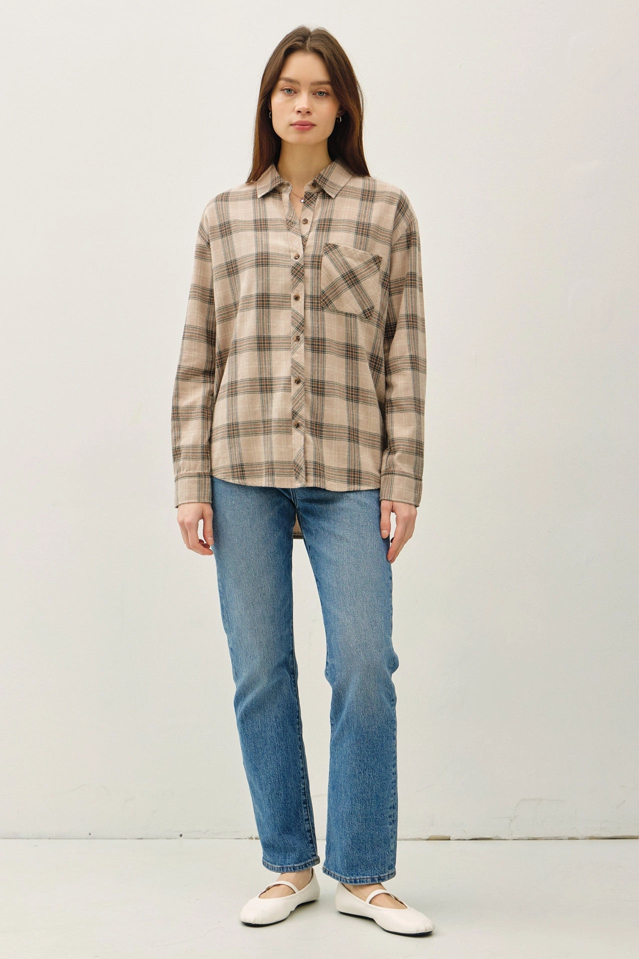 Our Taylor Plaid Top is your timeless go-to for effortless layering and everyday comfort. Crafted from soft woven fabric in a classic plaid pattern, it features a collared neckline, button-down front, and a single chest pocket for that lived-in feel. The oversized fit with drop shoulders, rounded hem, and subtle side slits makes it perfect for styling tucked, tied, or loose. A must-have for year-round styling, from casual weekends to cozy nights out.