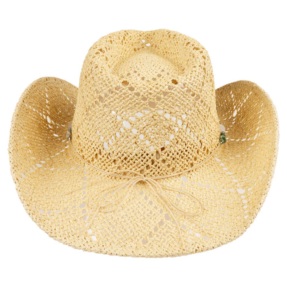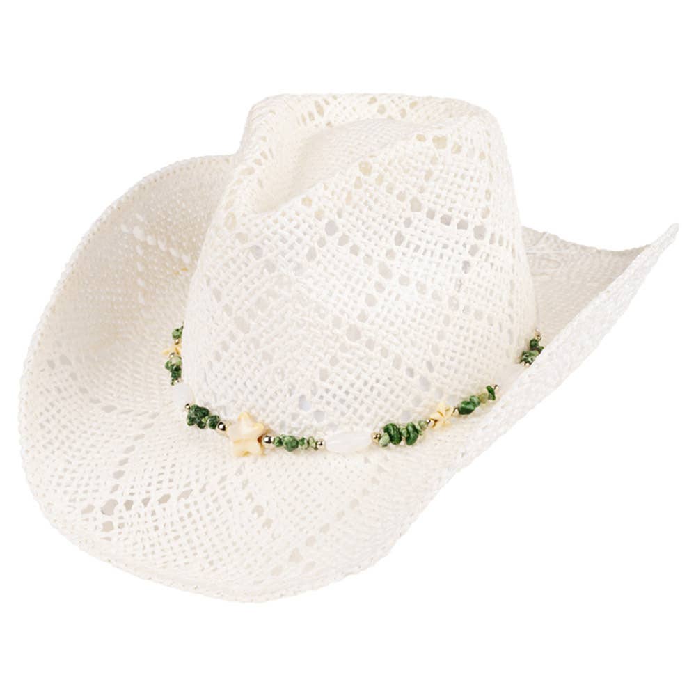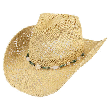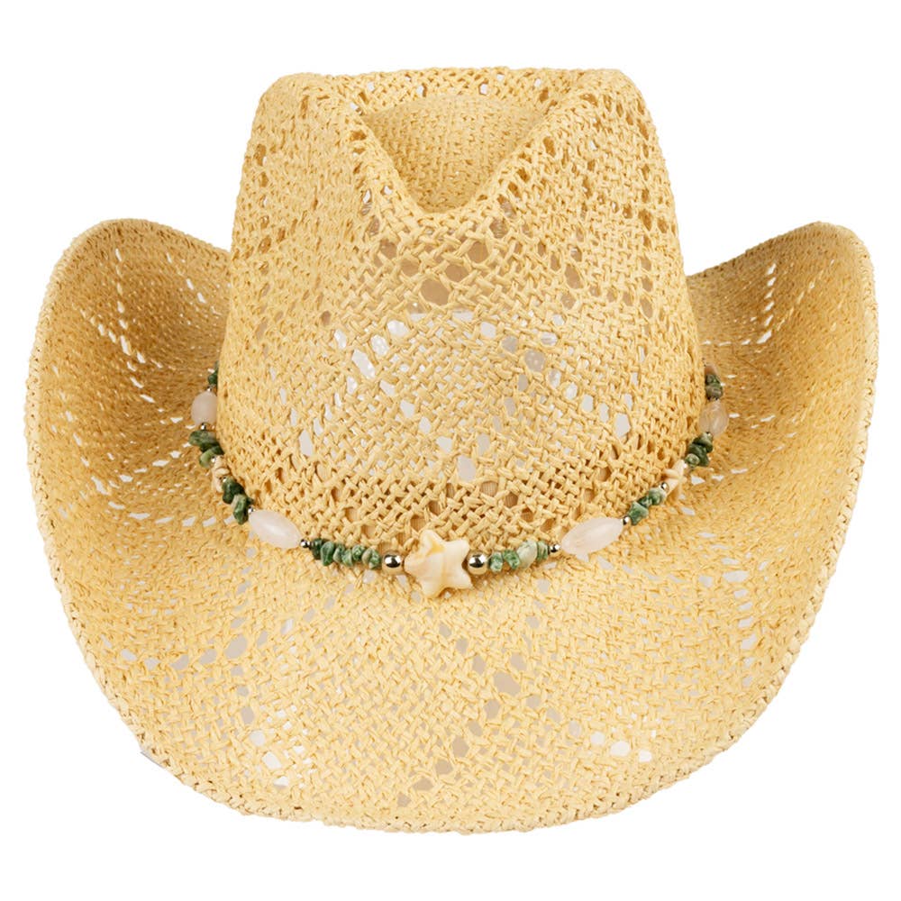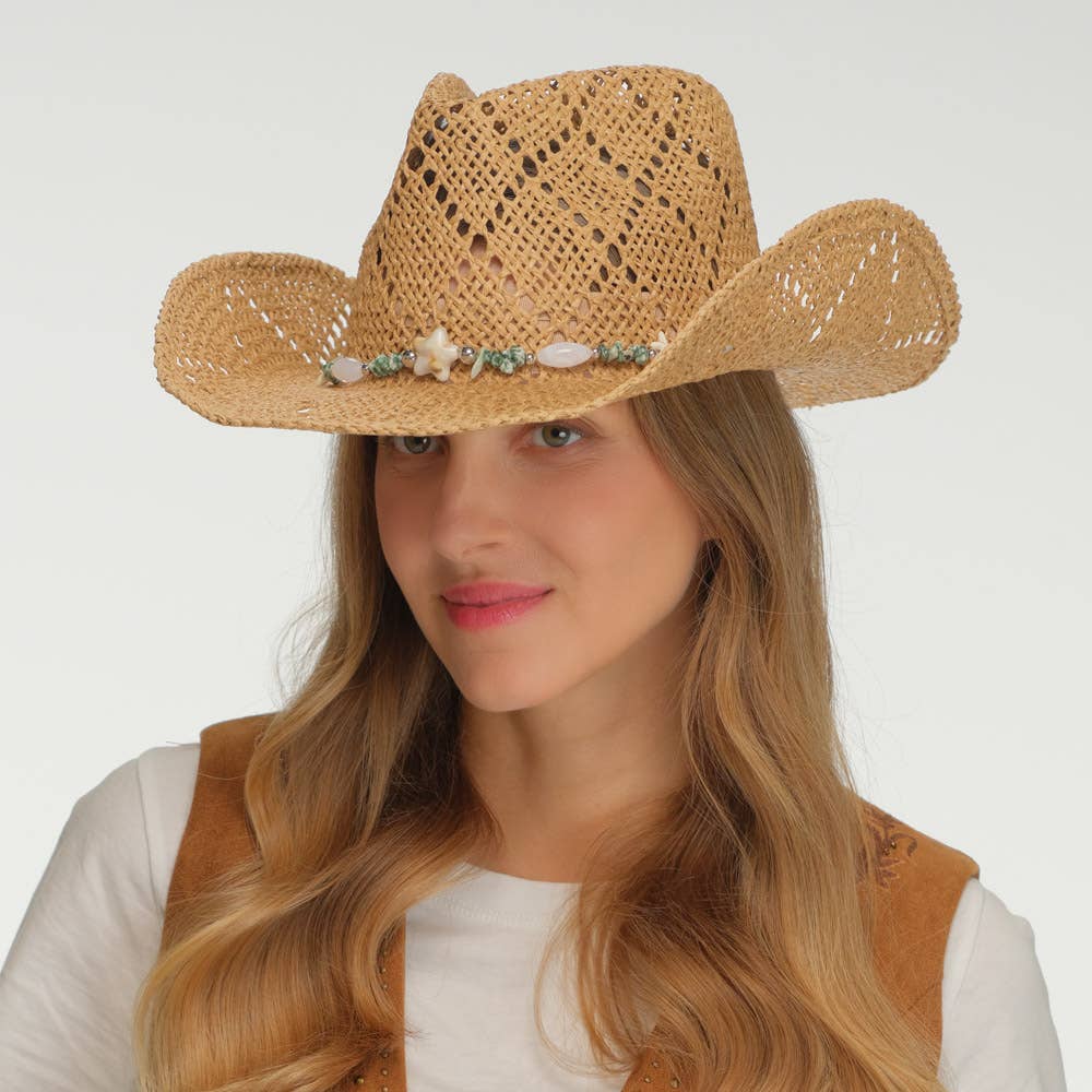 PAPER COWBOY HAT WITH STARFISH AND BEADED BAND CIRCUMFERENCE : 22 5/8 (57.5 CM) BRIM SIZE : 3 1/2 CROWN: 4 1/2 TALL 100% PAPER