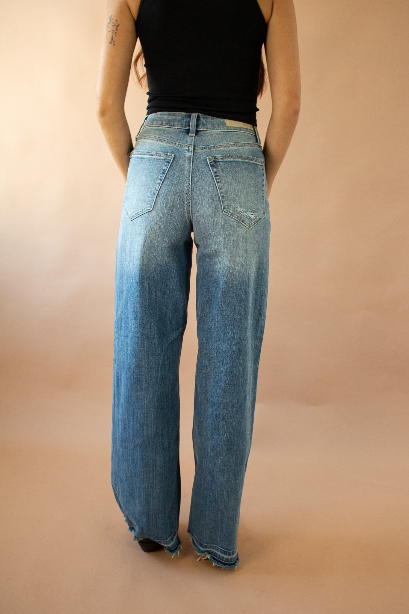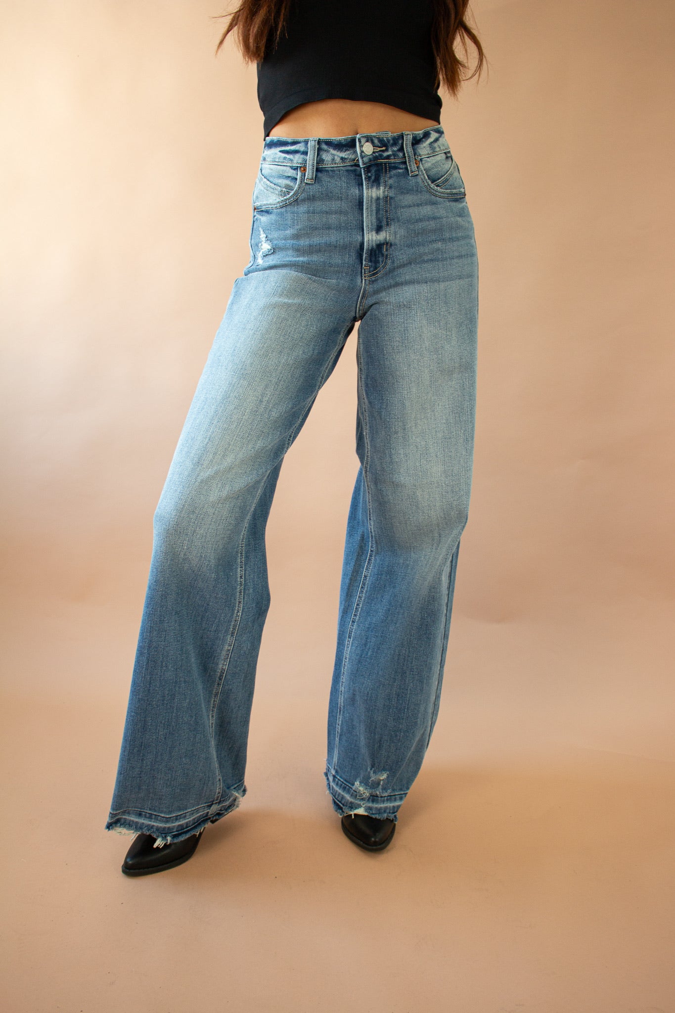 Our Jade jeans are a medium distressed wash, high rise, wide leg with tapered waist. light distressing, zipper fly and full length inseam. Super low stretch fabric stays sturdy and stretches only in the right places.