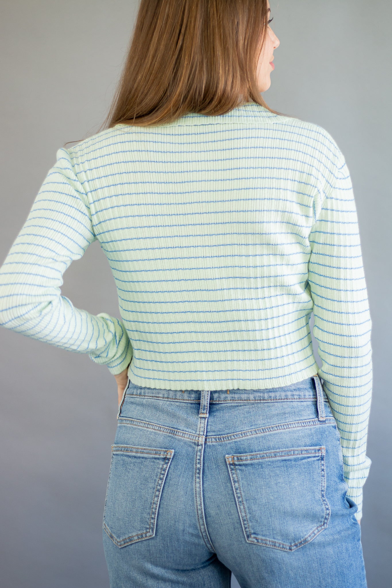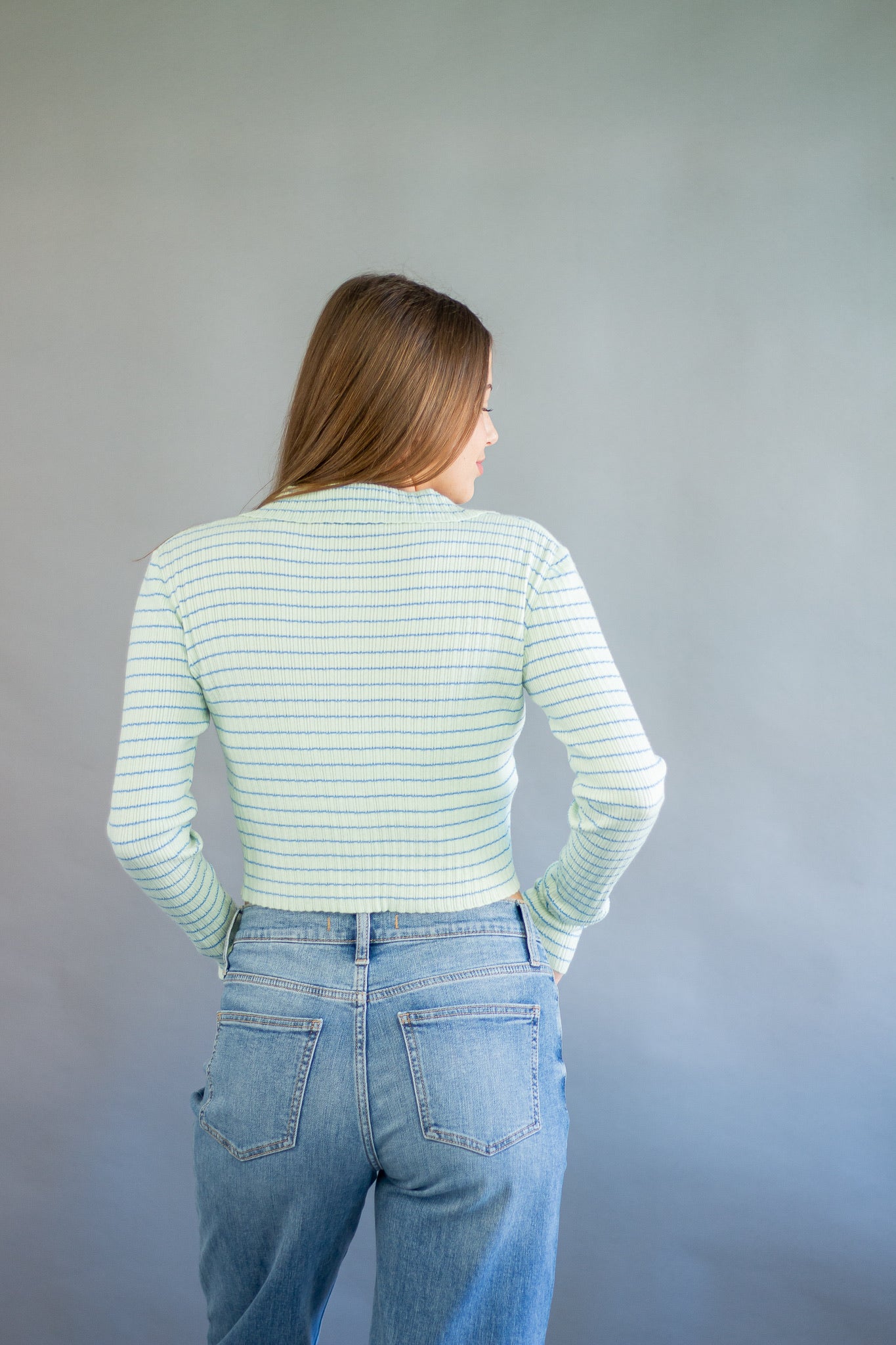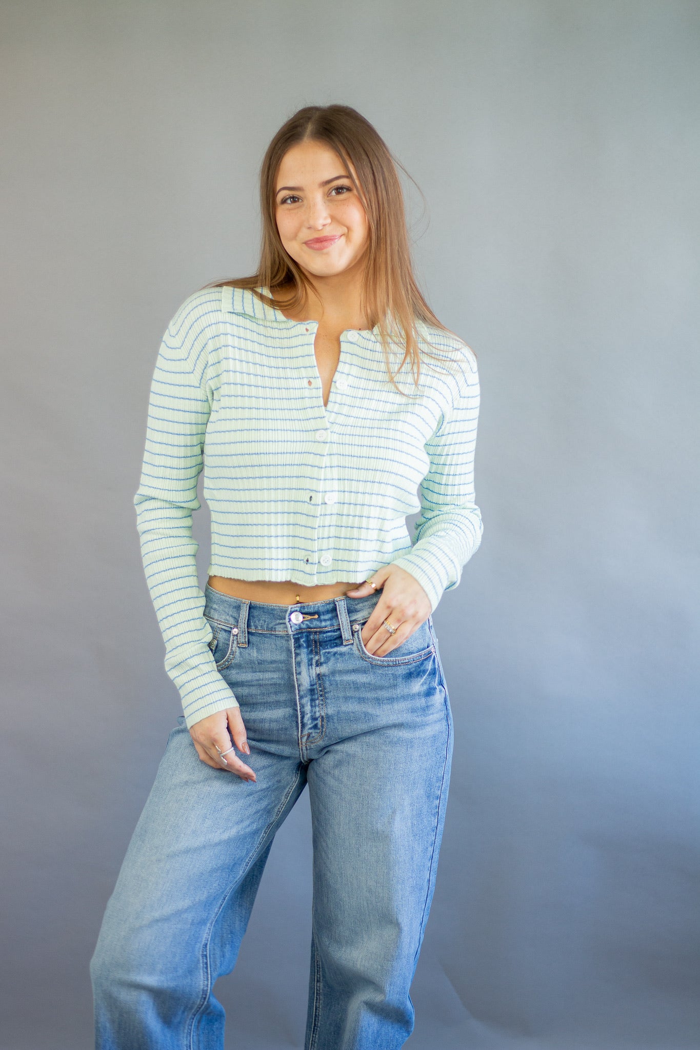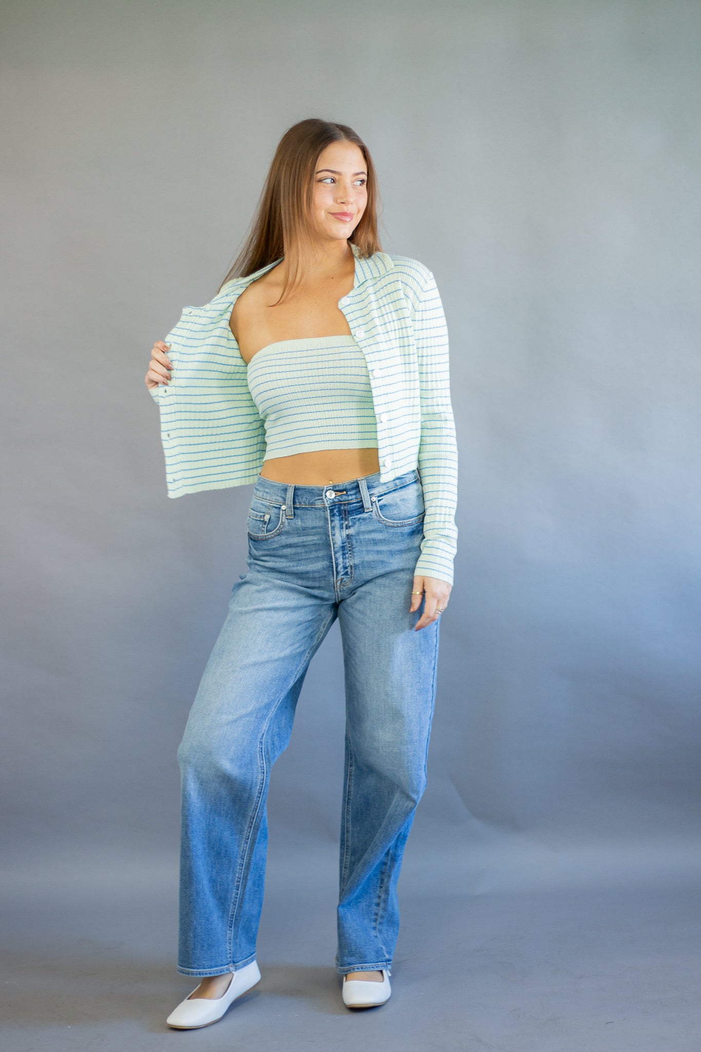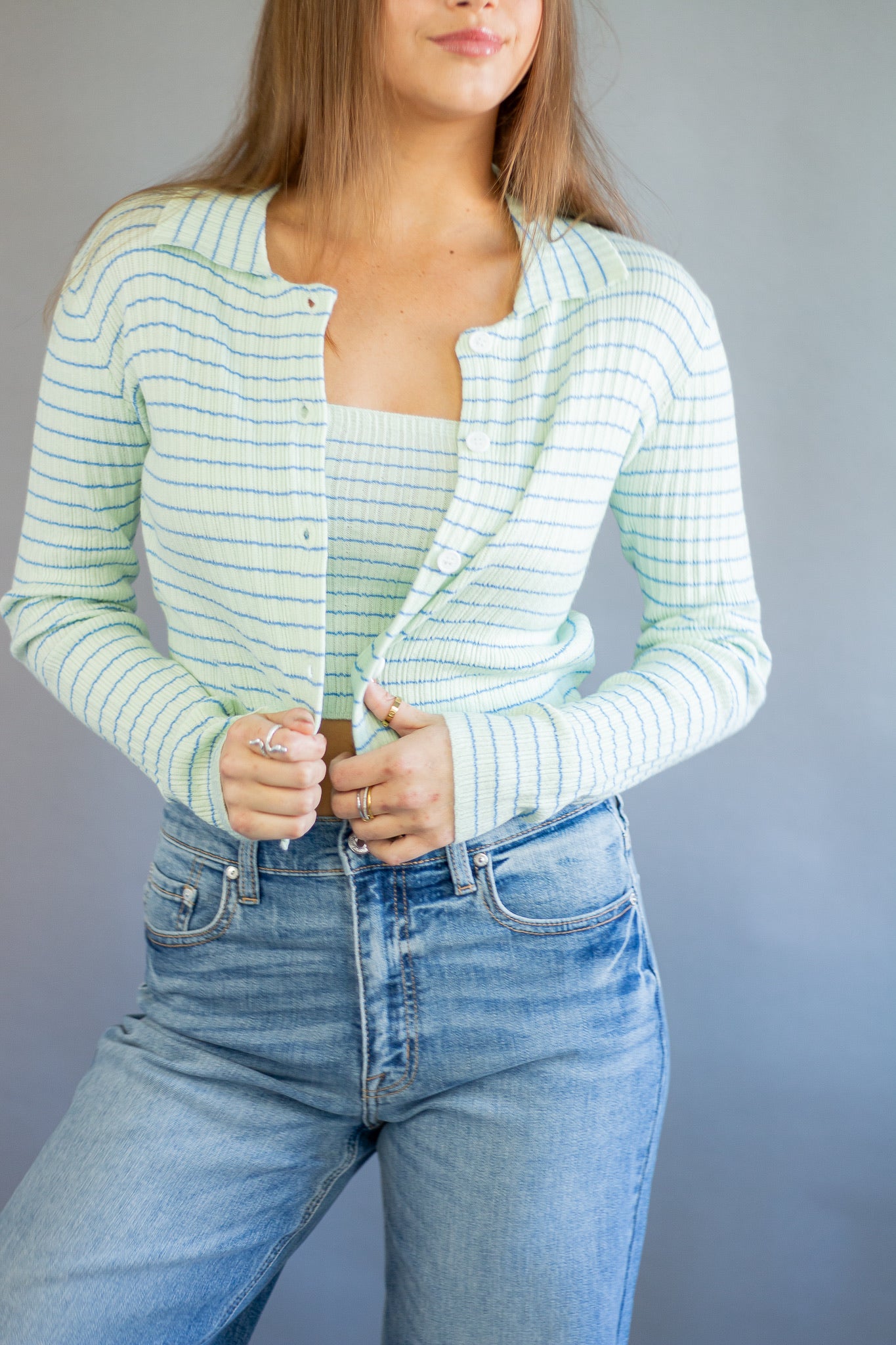 Emma Striped Button Top and Tube Top set is the ultimate two-in-one outfit upgrade. Featuring a fitted tube top and a collared, button-down cardigan, this cropped set brings that effortlessly chic, preppy vibe while keeping it flirty. The striped knit design adds texture and trend, while the tailored fit makes it perfect for layering or wearing solo. Dress it up with trousers for a polished look or keep it casual with your favorite denim.