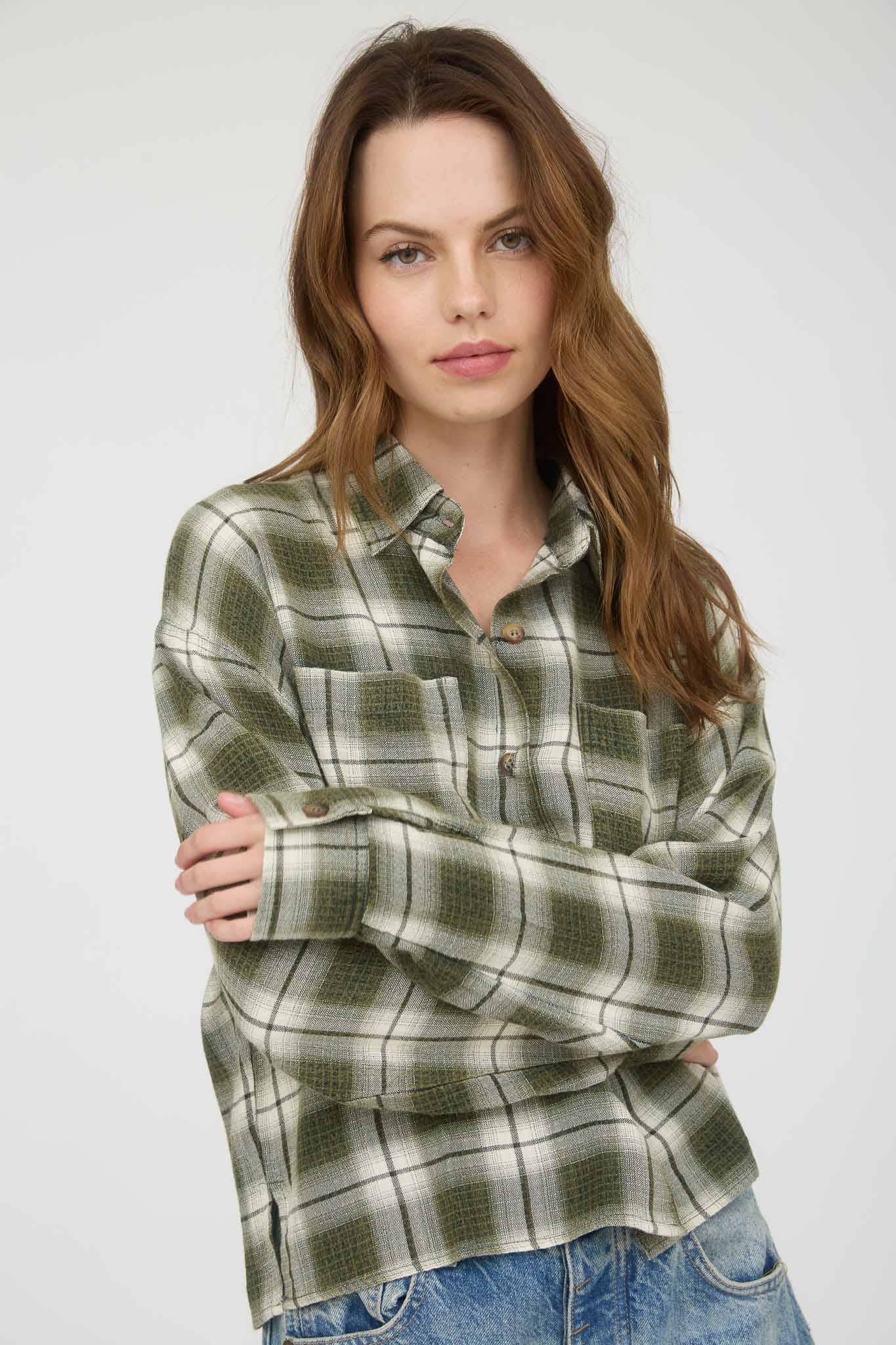 A cozy, cold-season classic with a modern, effortless fit. Aspen Trail features a soft brushed plaid, relaxed drop shoulders, and a slightly cropped length that layers perfectly over basics or under jackets. With dual chest pockets and a lived-in feel, it’s your new go-to for winter errands, mountain weekends, or easy everyday layering.