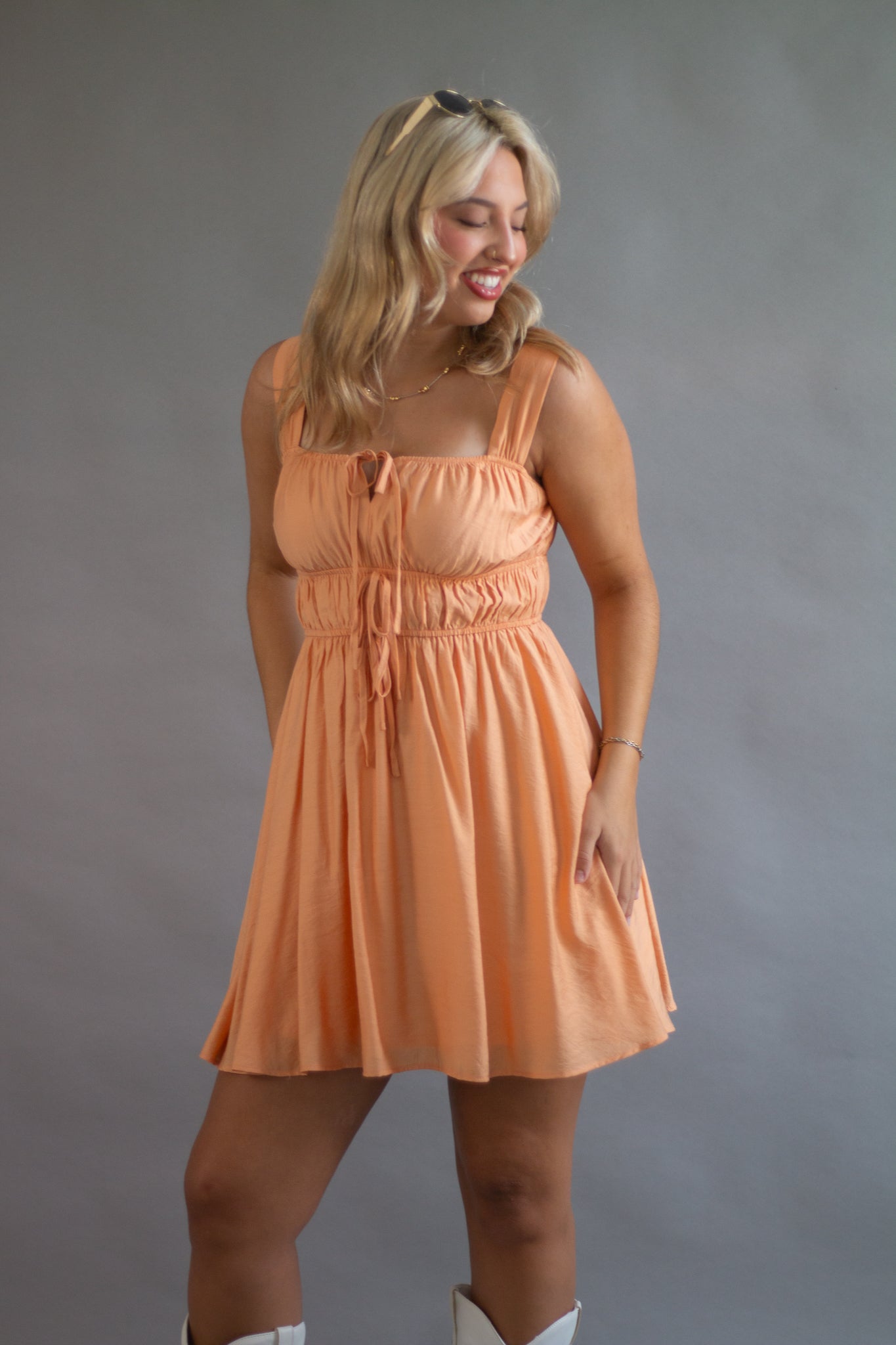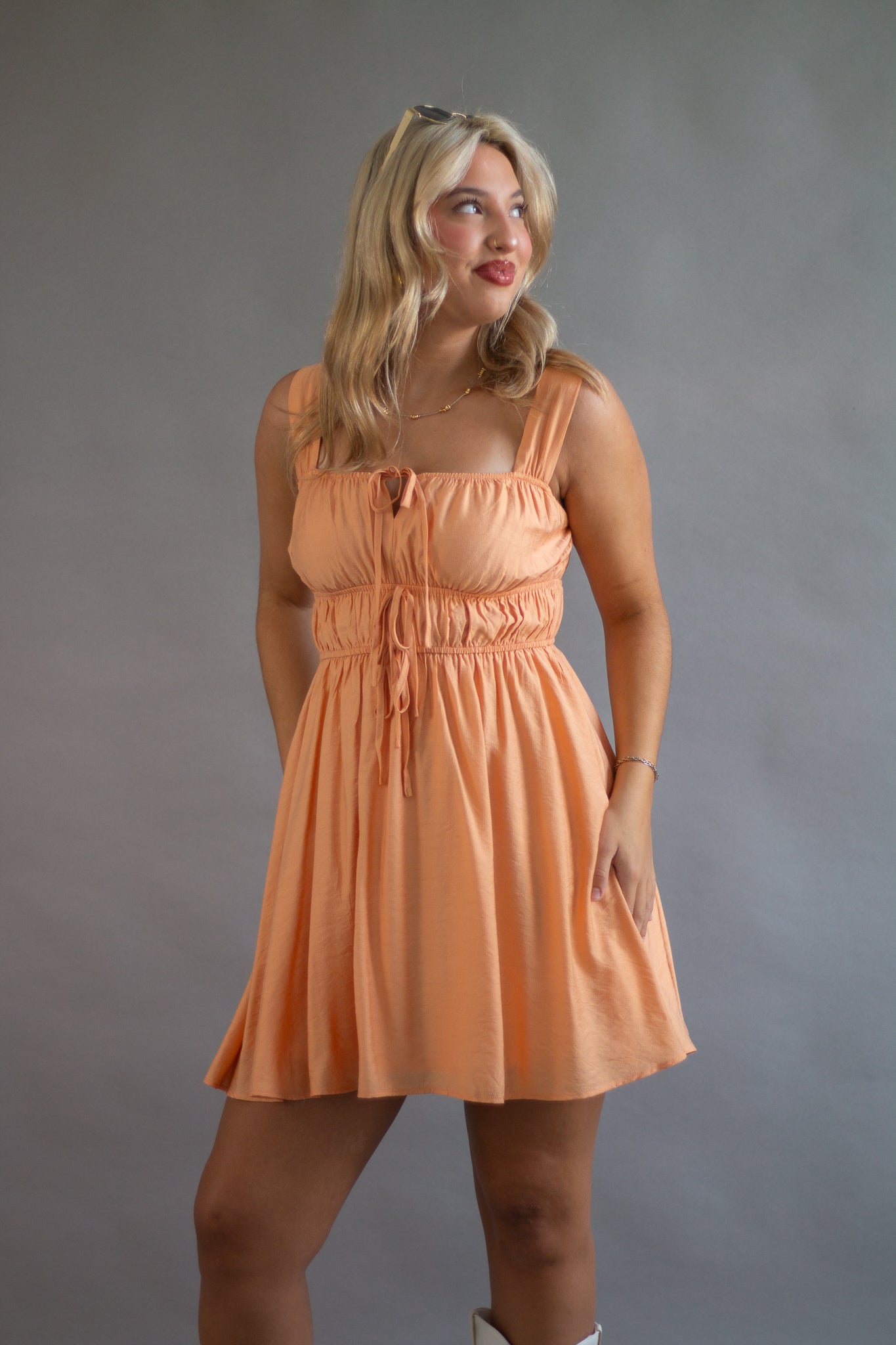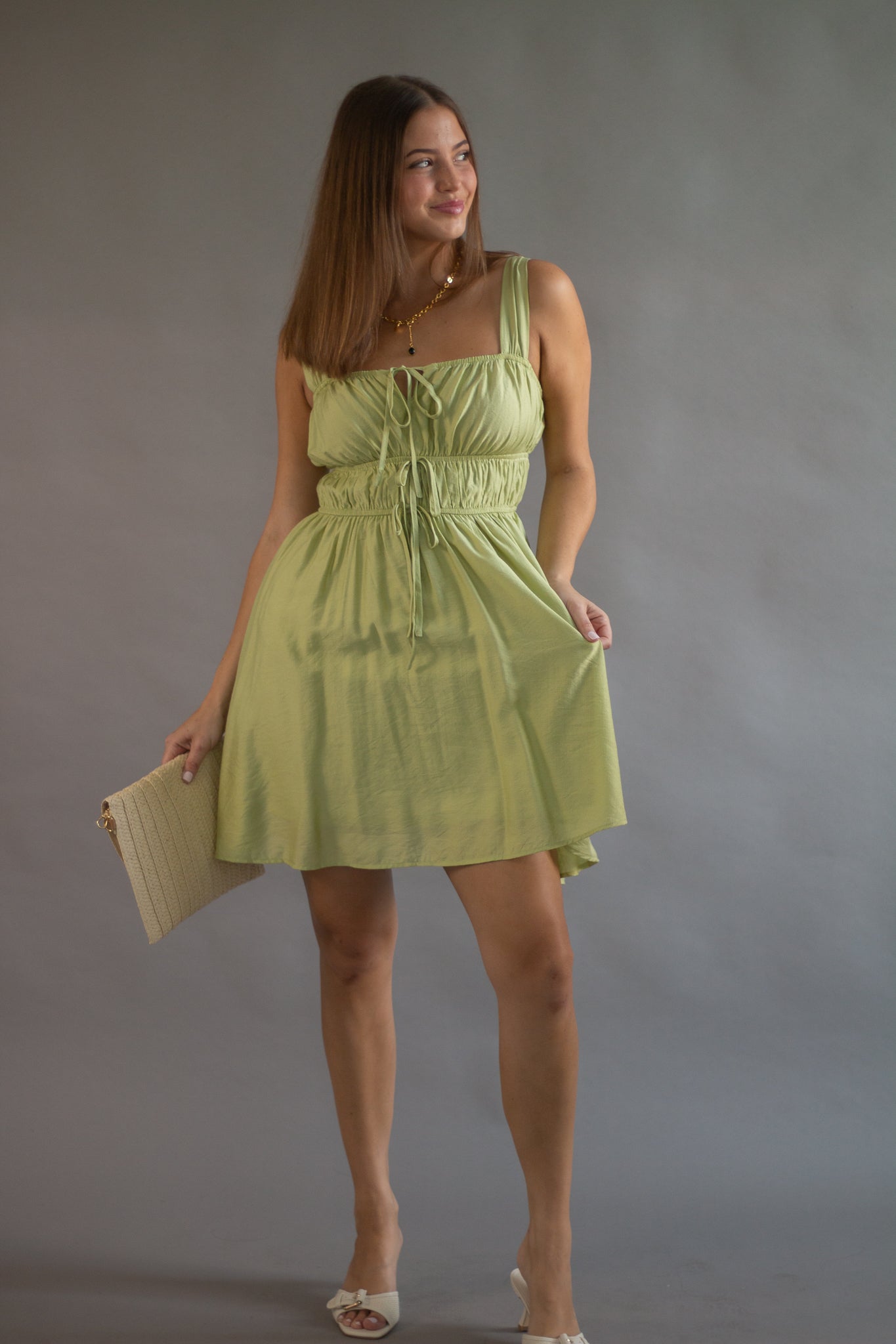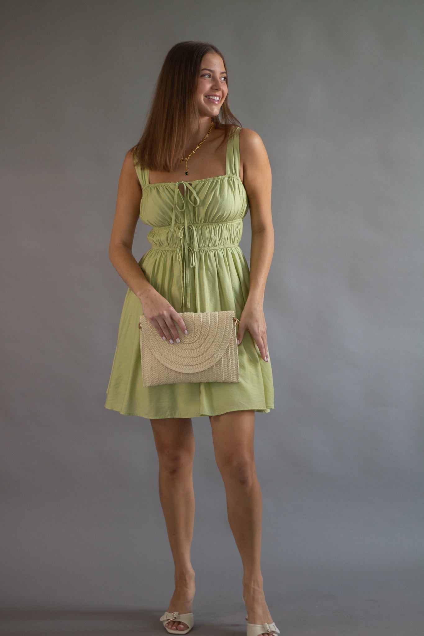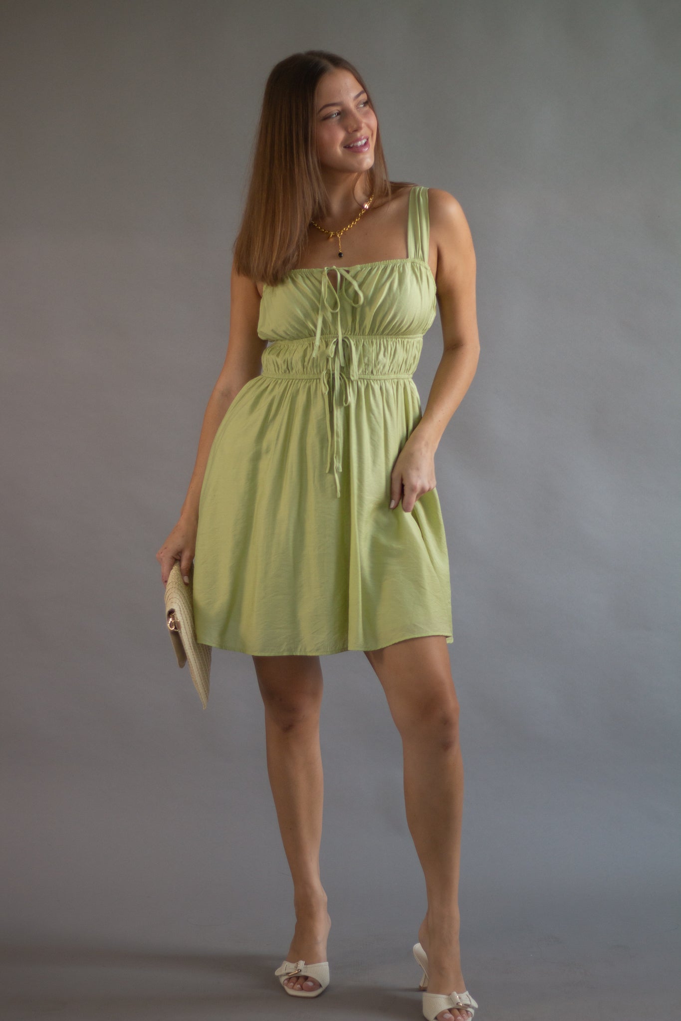 SQUARE NECK SLEEVELESS WIDE STRAP FRONT SELF TIE KEYHOLE DETAIL GATHERED SHIRRED WAIST SOLID LINED MINI DRESS