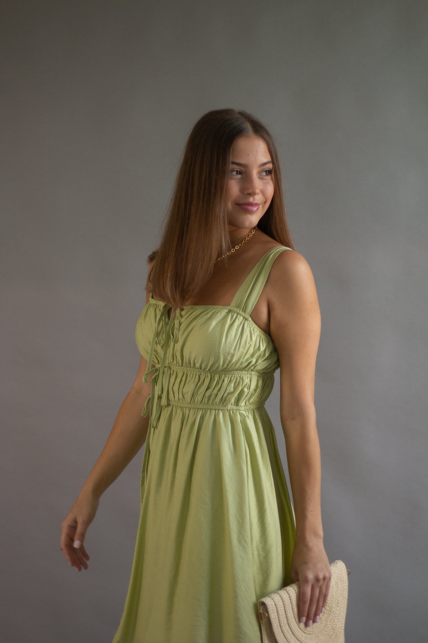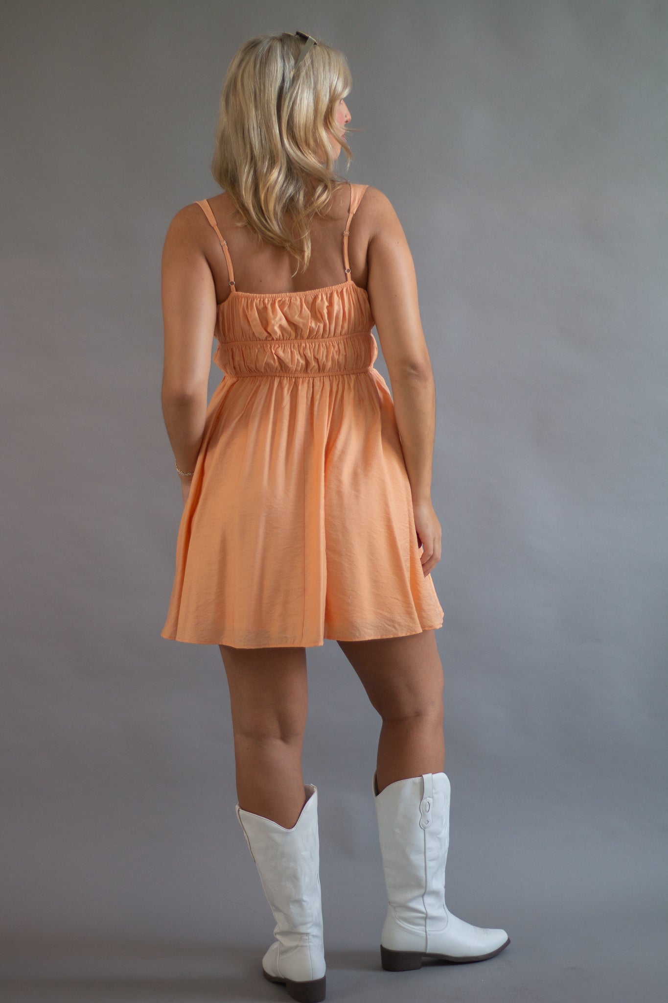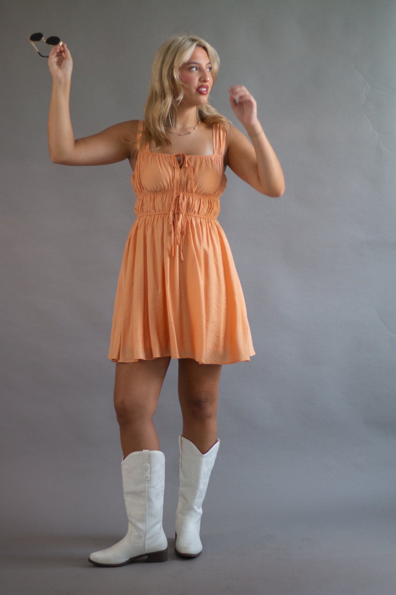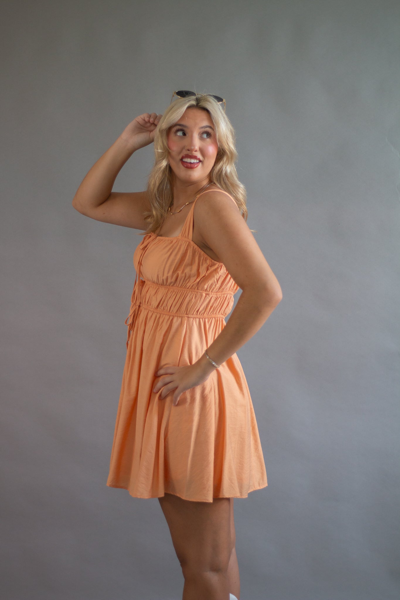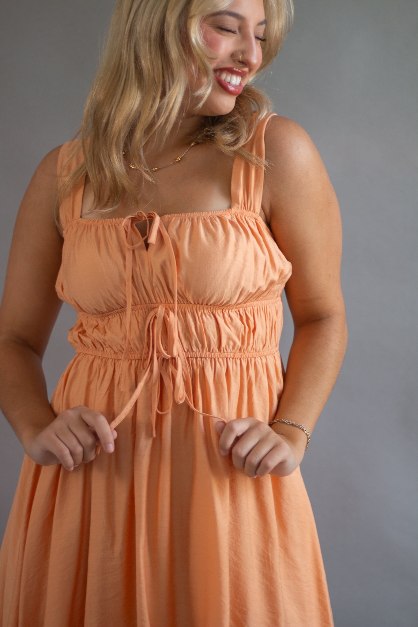 SQUARE NECK SLEEVELESS WIDE STRAP FRONT SELF TIE KEYHOLE DETAIL GATHERED SHIRRED WAIST SOLID LINED MINI DRESS