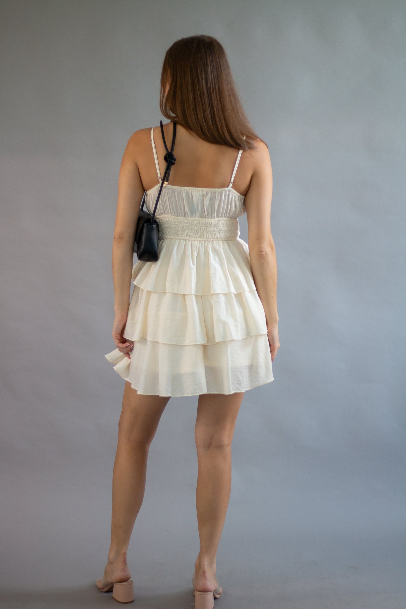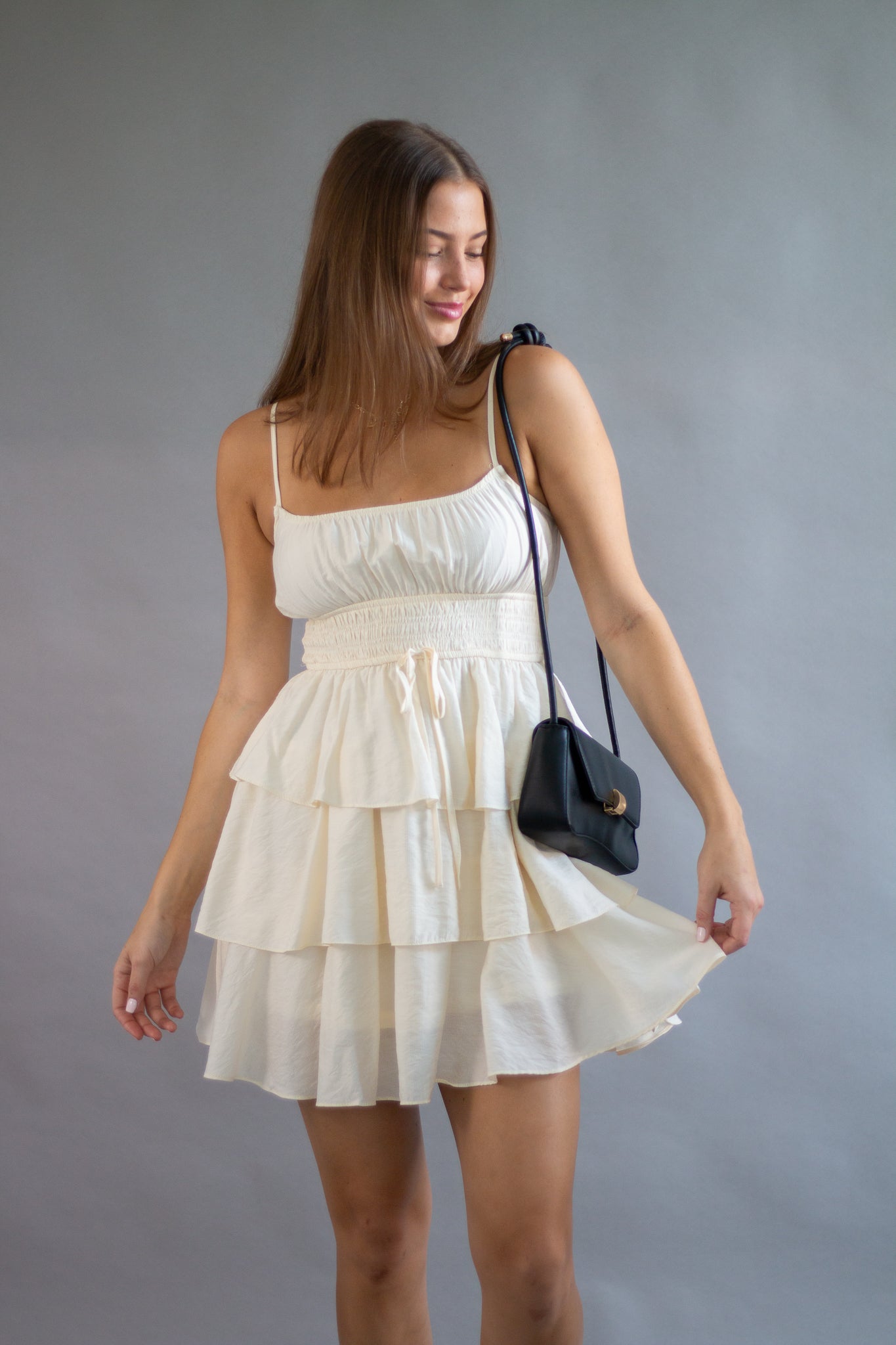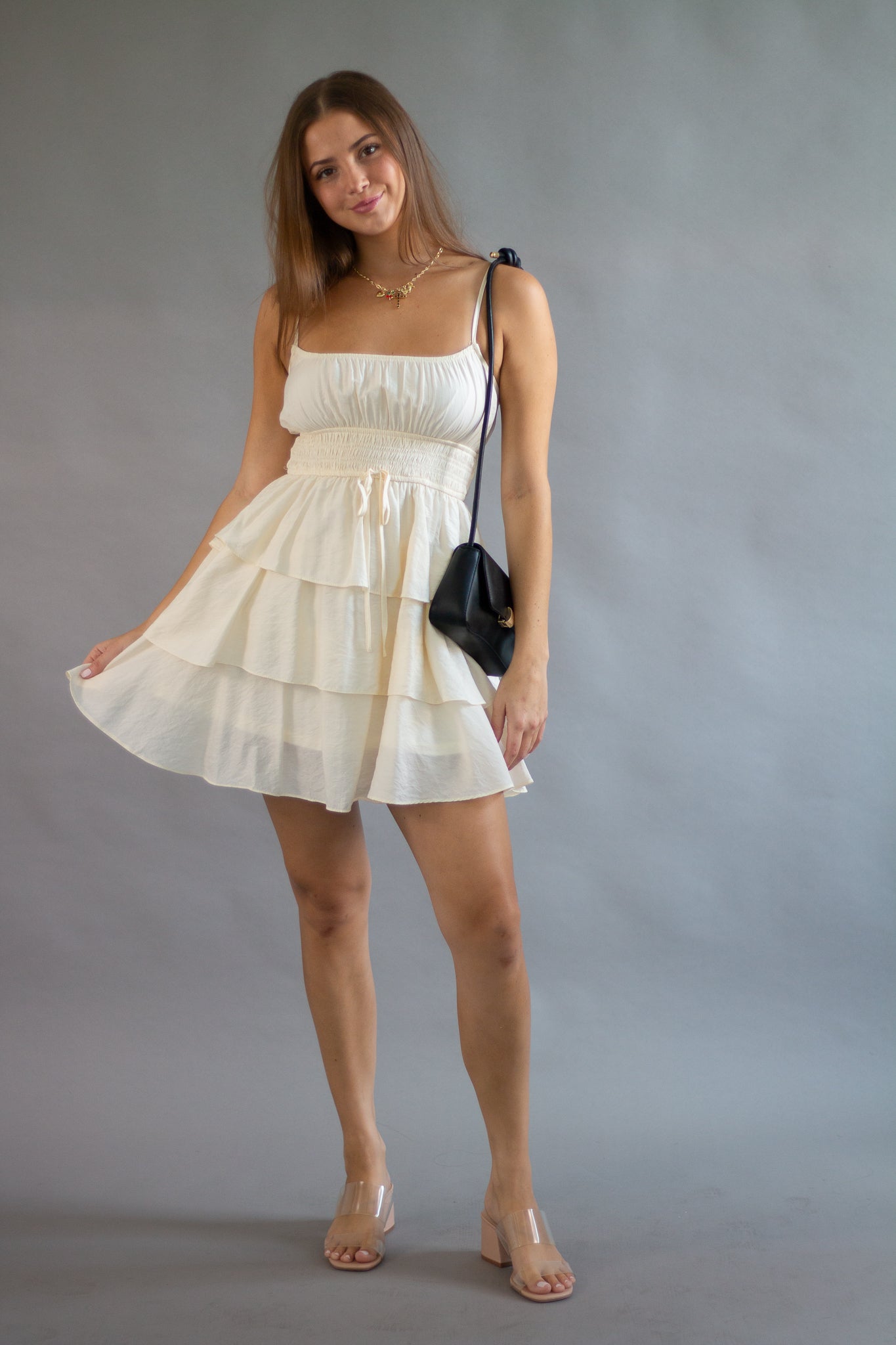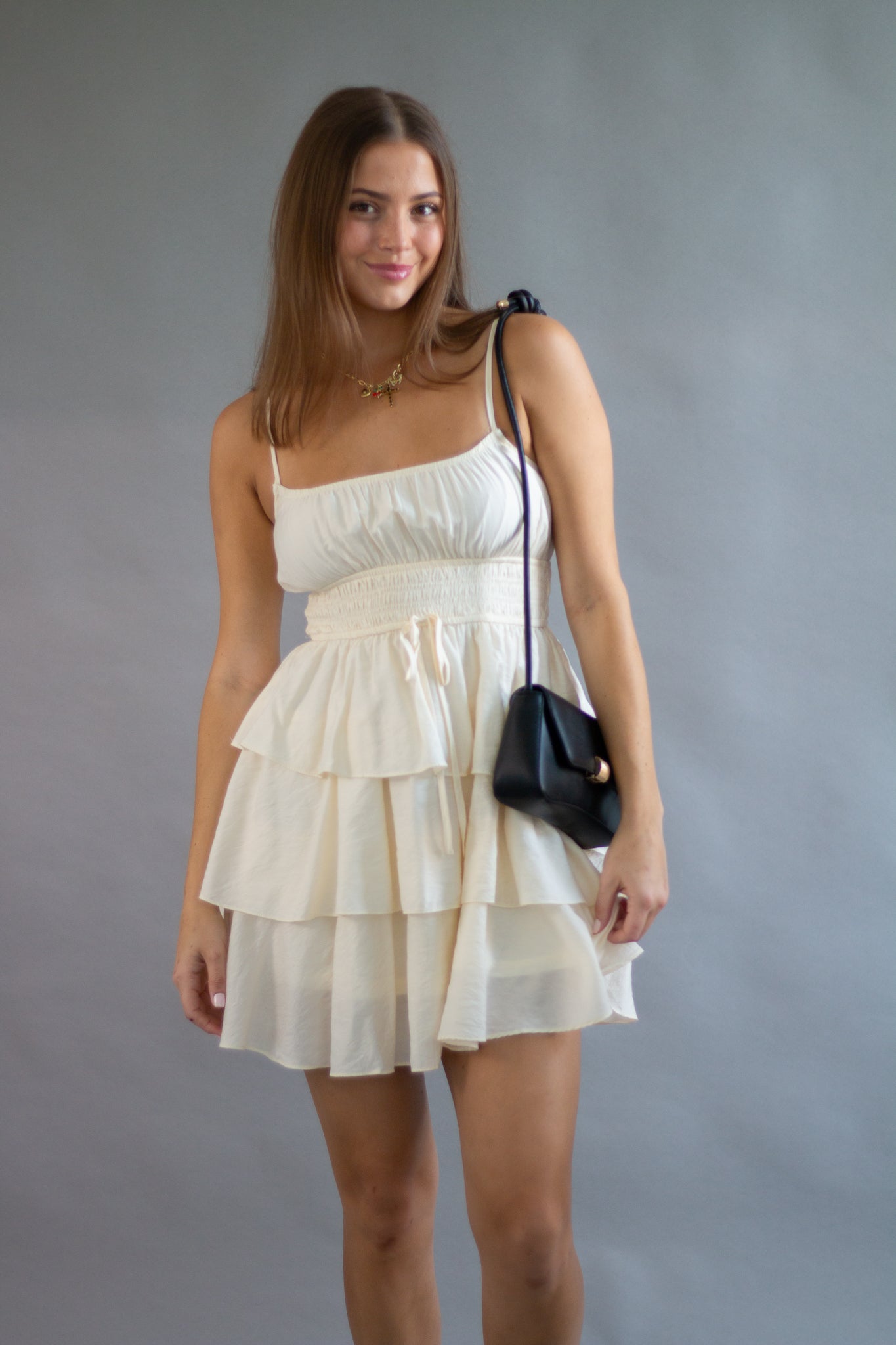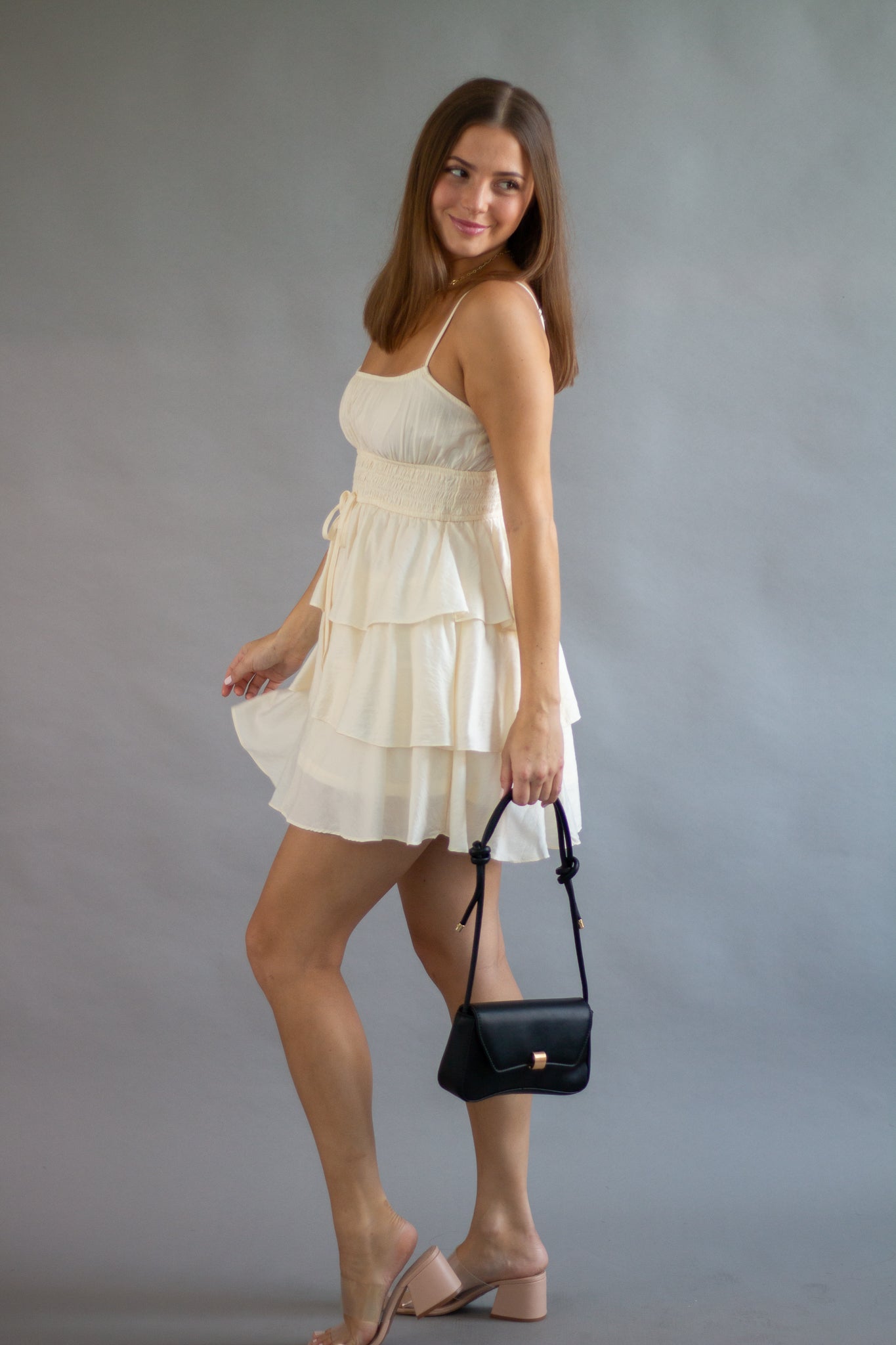 SCOOP NECKLINE SPAGHETTI STRAP ADJUSTABLE STRAP DETAIL SMOCKED WAIT FRONT WAIST TIE DETAIL RUFFLE TIERED SOLID LINED MINI DRESS